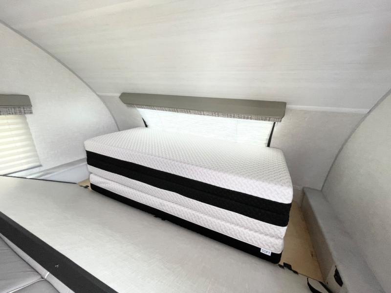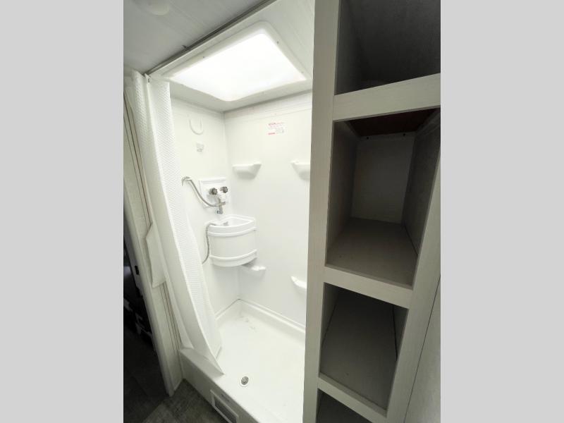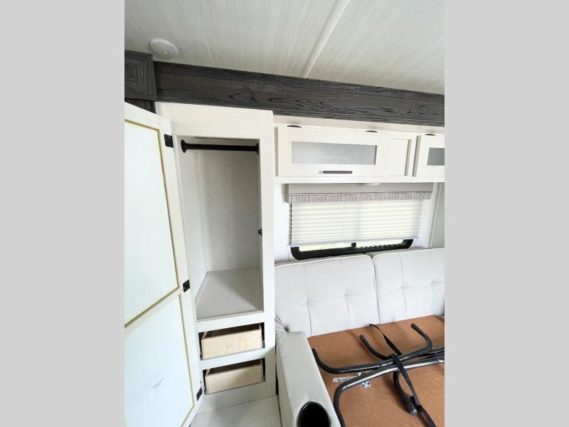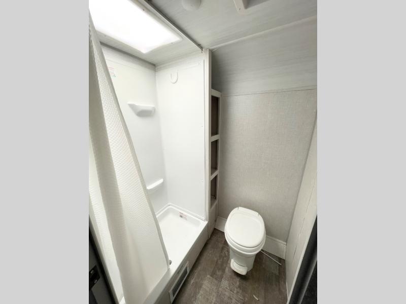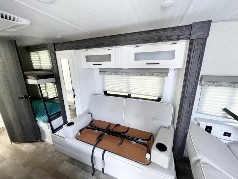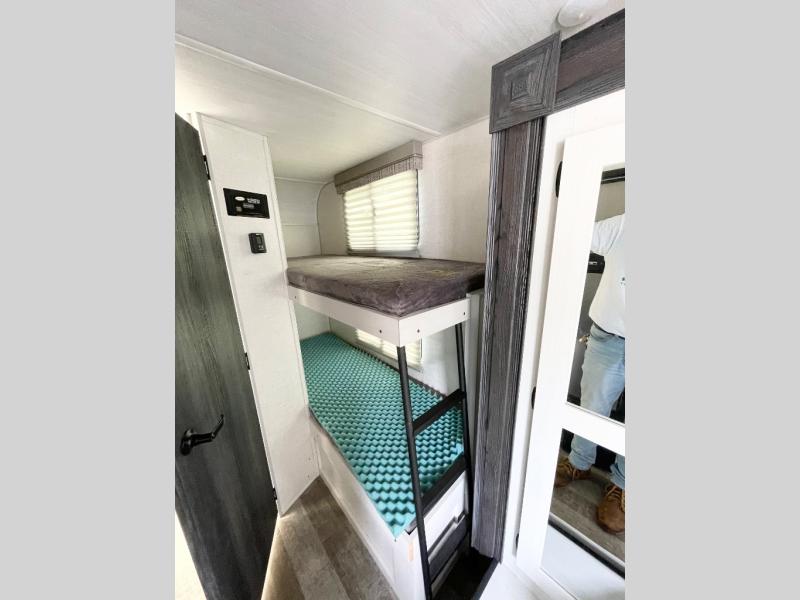 The whole family will enjoy this trailer with sleeping space for five between the bunk beds, the queen Murphy bed and the second sofa within the slide out. This sofa also includes a table for dining, and there is a closet to hang your clothes. During the day you will be able to relax inside while visiting with the cook in the kitchen with full amenities including a pantry for dry good storage. And the bathroom includes a toilet, linen storage, and a shower with a sink, so load up and head out to easily set up and enjoy your own accommodations in the great outdoors.