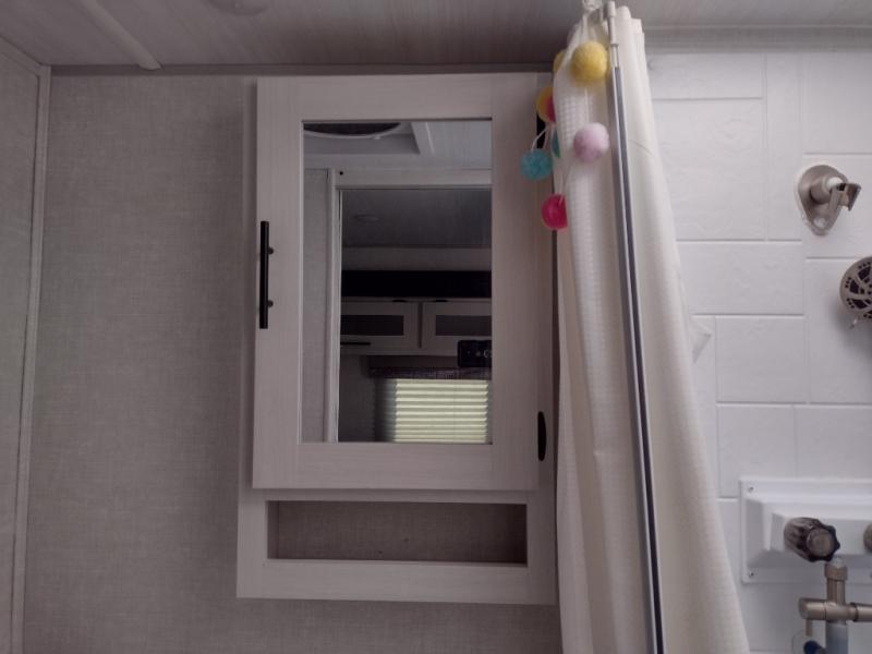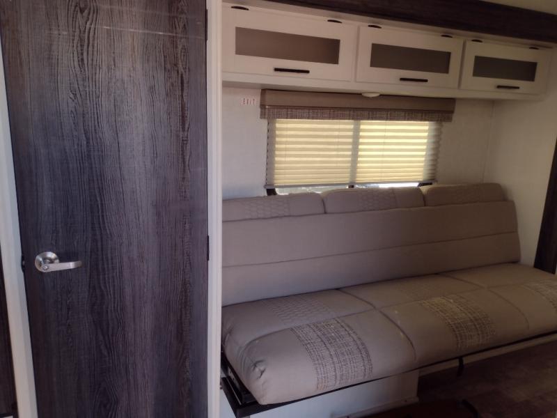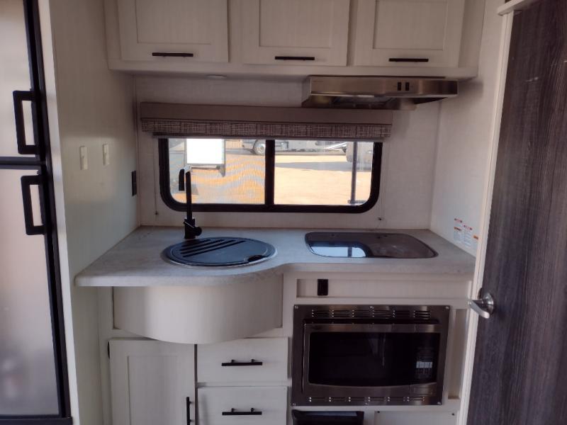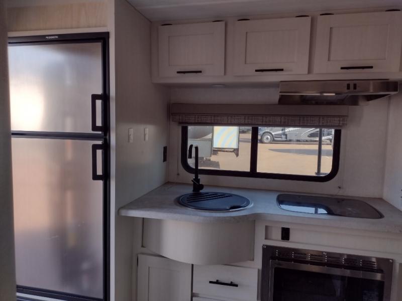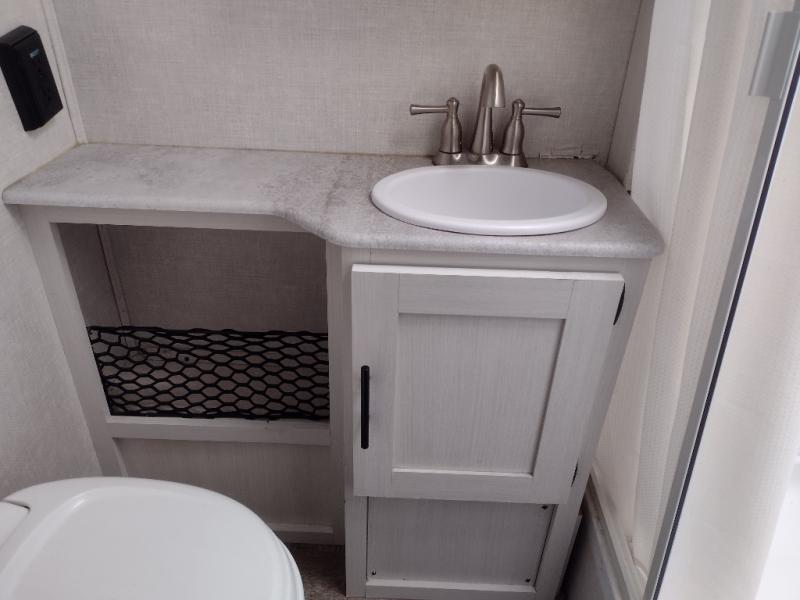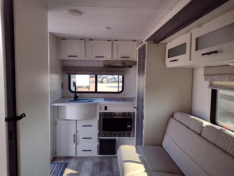 This is the perfect travel trailer for a couple or a smaller family, so pack your bags and get ready for an adventure in this R-Pod! After you've set up camp and had a look around the campgrounds, you can prepare lunch on the two-burner cooktop and in the convection microwave found in the rear kitchen. There is a convenient refrigerator and pantry to store your favorite snacks and perishables, plus overhead compartments for more items. The full bath allows you to skip the camp's facilities, and the exterior pass-through storage provides space for you to bring along the fishing poles!