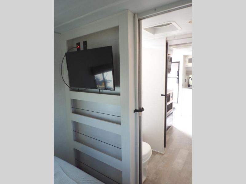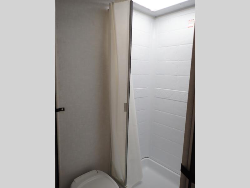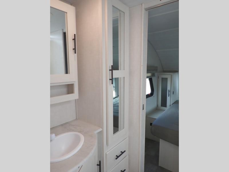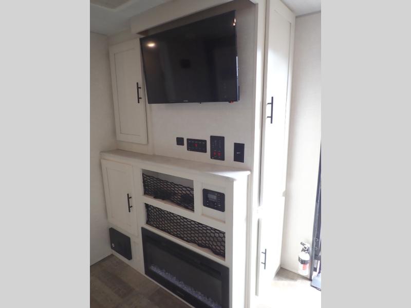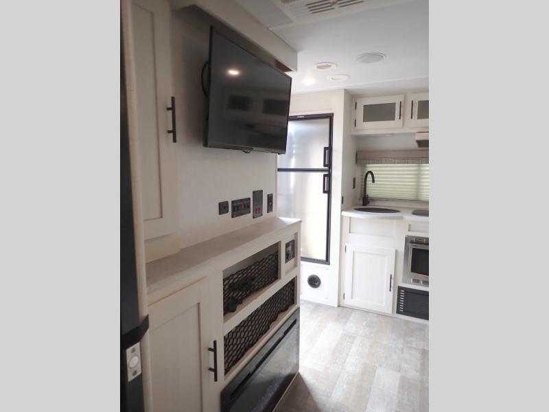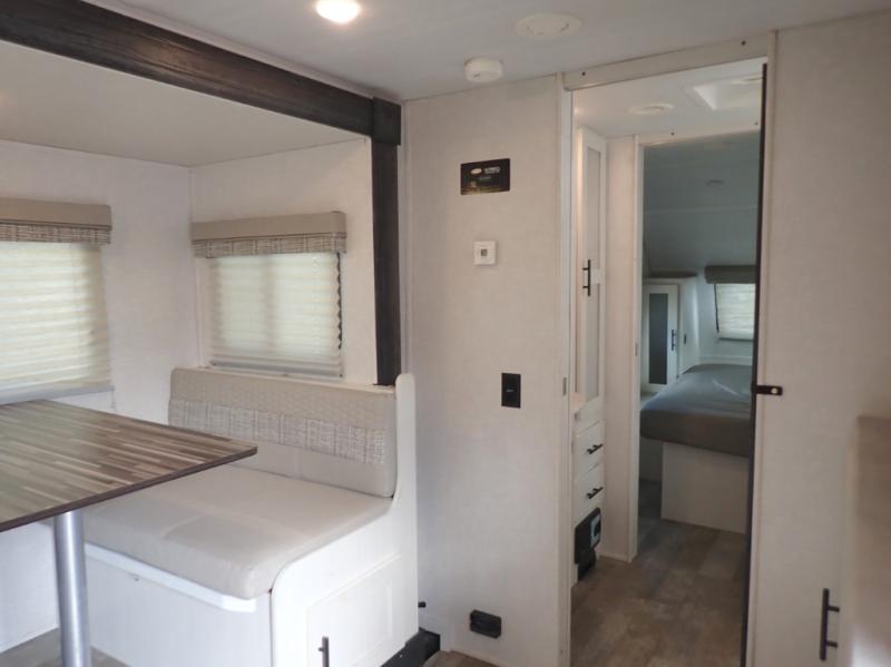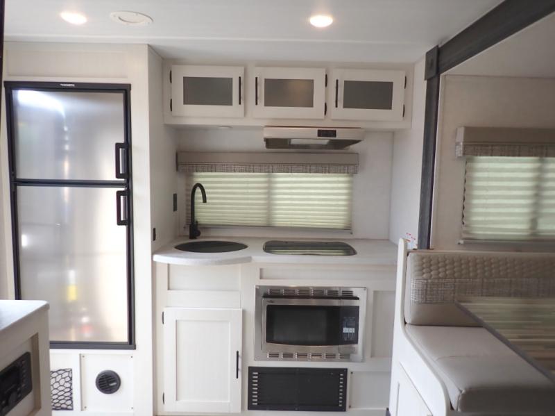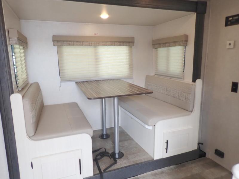 A private bedroom with a walk-around RV queen bed, a walk-through bathroom, and an outside kitchen are a few of the features that you are sure to want in your next RV! You can rest comfortably each night, plus all your clothing can be stored in the dual wardrobes to keep everything tidy. Everyone will stay clean with the full bathroom only steps away, and there is linen storage as well. The main living and kitchen area offers a slide out dinette that can also sleep one more camper. The rear kitchen provides everything you will need, plus the outside kitchen gives you more choices. Step inside to start planning your weekend trip!