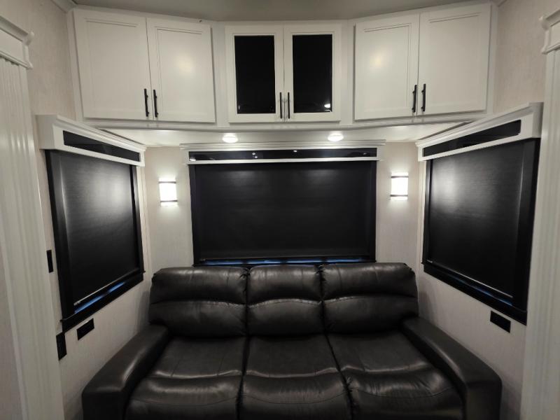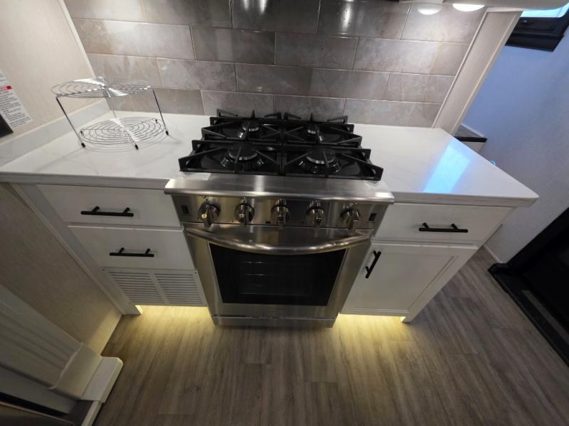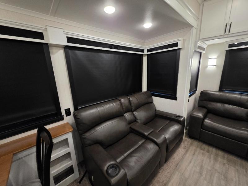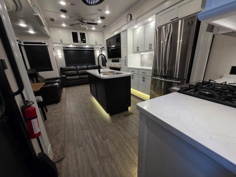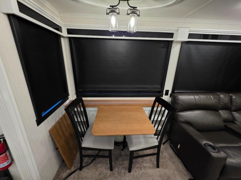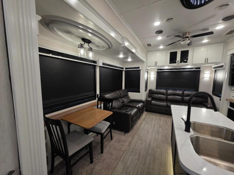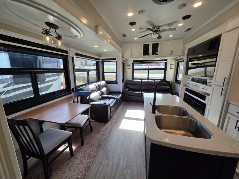 This RiverStone Reserve Series fifth wheel is a high-class unit that has all of the essentials and then some! The front private bedroom is going to be a great place to spend your evenings relaxing on the king bed slide in front of the 39" LED Smart TV. The bedroom also includes a dresser, a bench seat, a full-width wardrobe, and preparations for a washer/dryer. Right next to the bedroom is the full bathroom, and this bathroom is full of great features, like a 48" x 30" shower with seat, a linen closet, an oval porcelain toilet, and a medicine cabinet above the vanity. Back in the kitchen, you will love the look of the large Infiniti light over the island, and it will be so helpful to have a four-burner range and pantry with drawers while you are cooking.