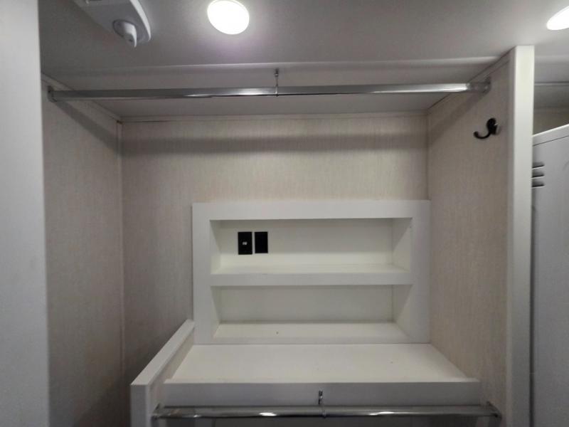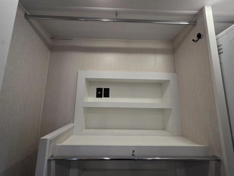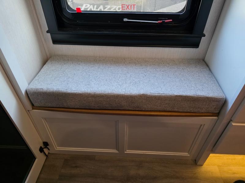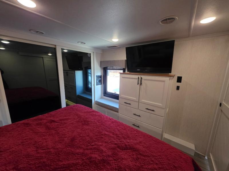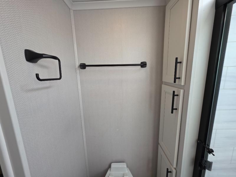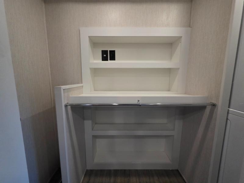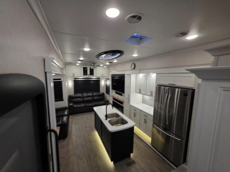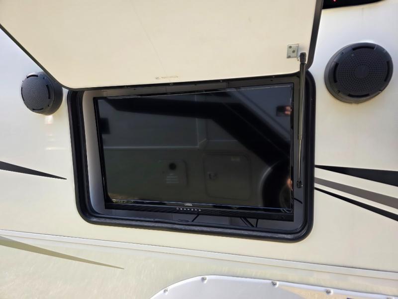 This RiverStone Reserve Series fifth wheel is a high-class unit that has all of the essentials and then some! The front private bedroom is going to be a great place to spend your evenings relaxing on the king bed slide in front of the 39" LED Smart TV. The bedroom also includes a dresser, a bench seat, a full-width wardrobe, and preparations for a washer/dryer. Right next to the bedroom is the full bathroom, and this bathroom is full of great features, like a 48" x 30" shower with seat, a linen closet, an oval porcelain toilet, and a medicine cabinet above the vanity. Back in the kitchen, you will love the look of the large Infiniti light over the island, and it will be so helpful to have a four-burner range and pantry with drawers while you are cooking.
