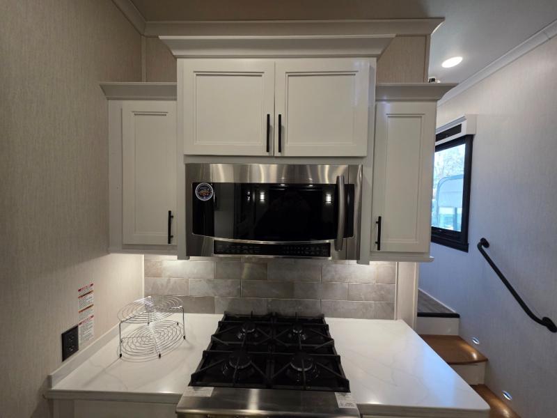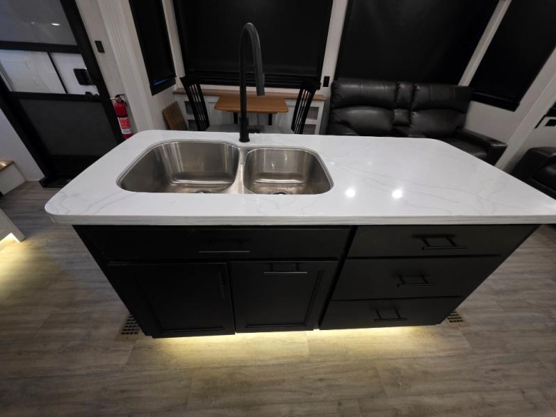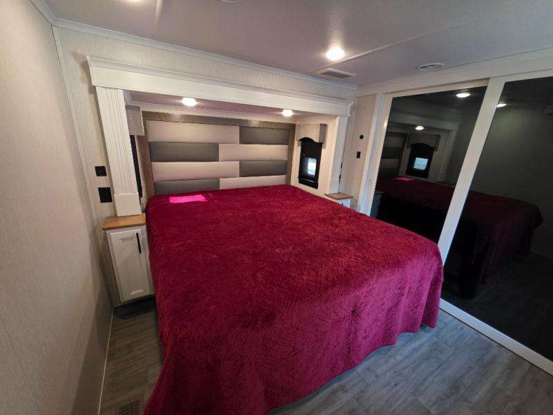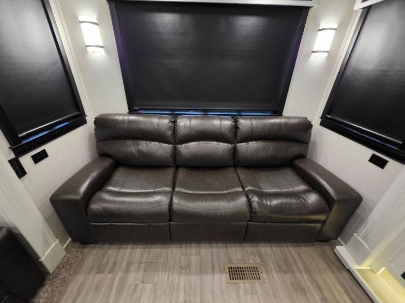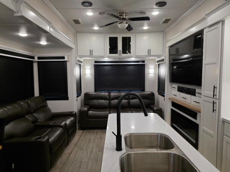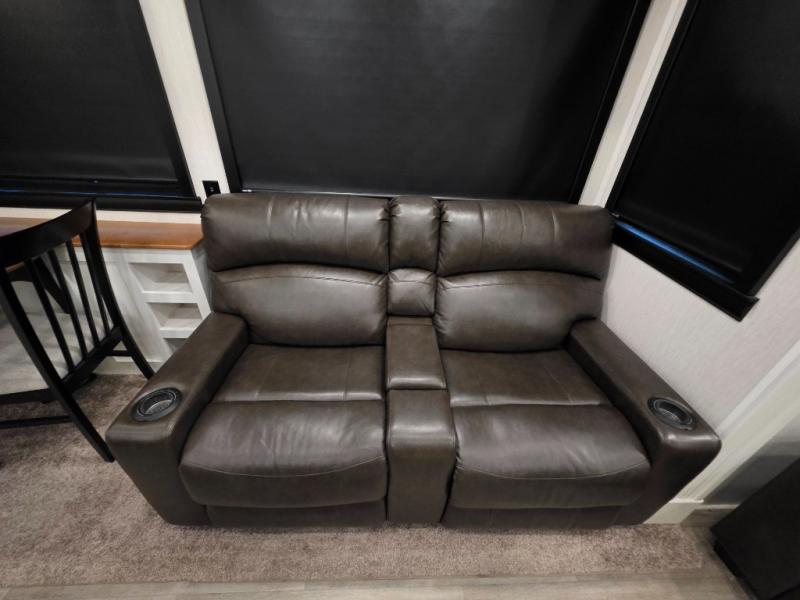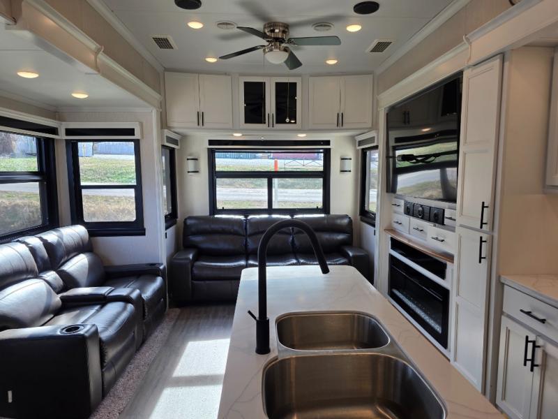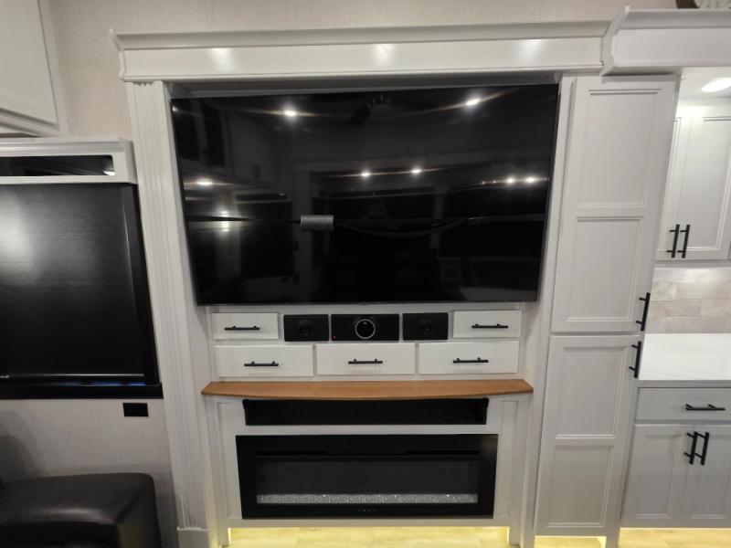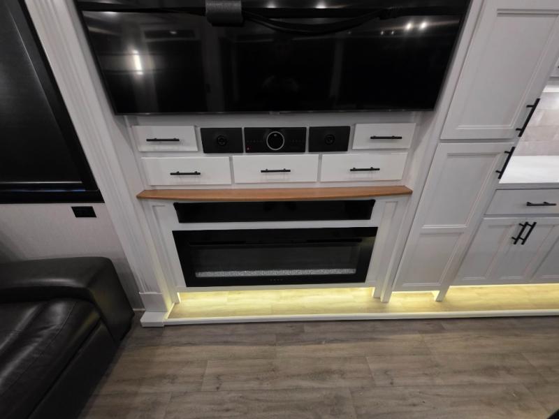 The Forest River RiverStone Reserve Series fifth wheel is an absolute dream! The construction is top notch with its wool-glass, residential-style insulation, 17.5" H-rated tires with aluminum rims, hydraulic slide outs, Dexter EZ Flex suspension system, painted full front fiberglass cap, and MORryde Step Above entry step. The RiverStone Reserve Series takes quality a step further by implementing a fully residential interior, the latest styles for interior design, and an excellent assortment of modern amenities. The central vacuum system is essential for keeping your unit clean while you are traveling, and the residential soft-close cabinet hinges are an added bonus that make your unit feel upscale. The 5,200 BTU fireplace is both functional and decorative, and the 190W solar panel, JBL Premium sound system, 1,000W inverter, and Firefly integrated touch control system are some of the great electronic features.