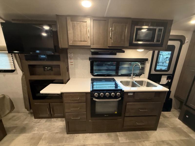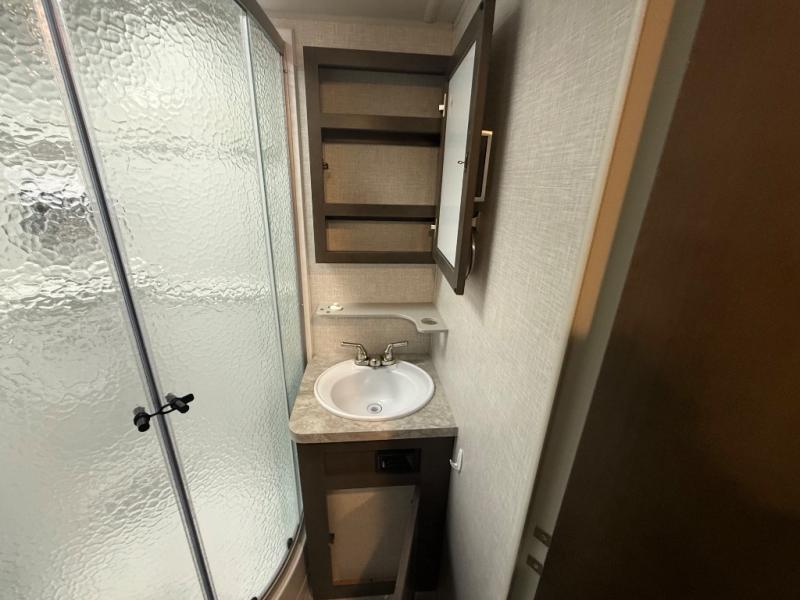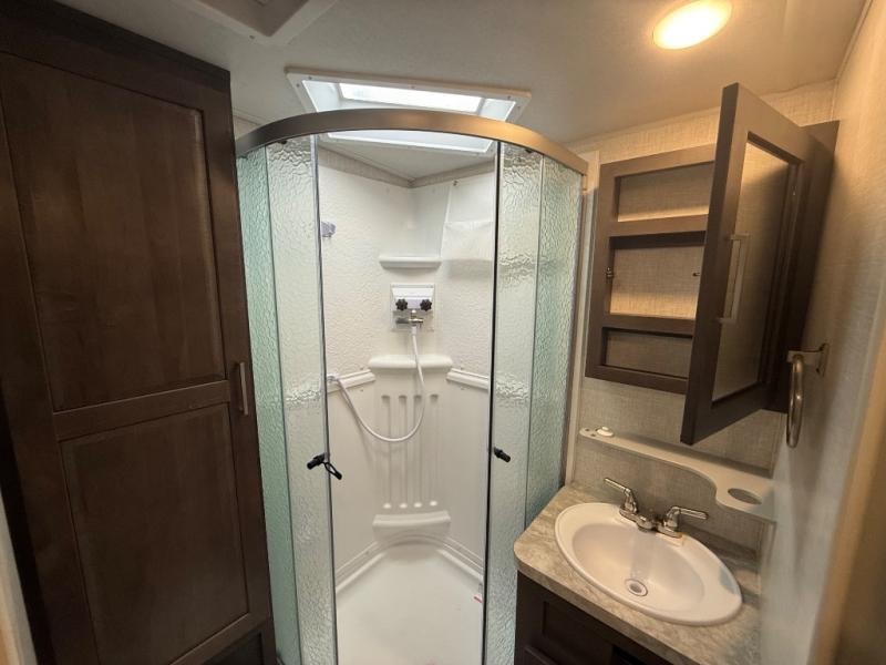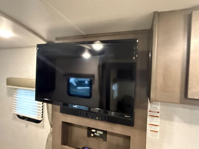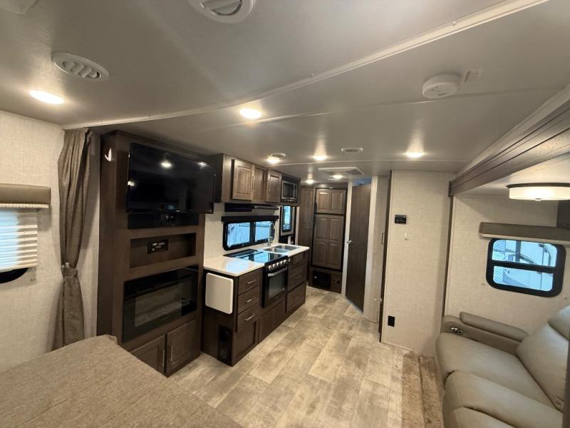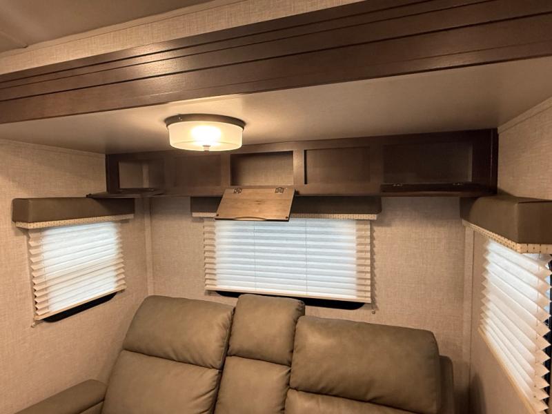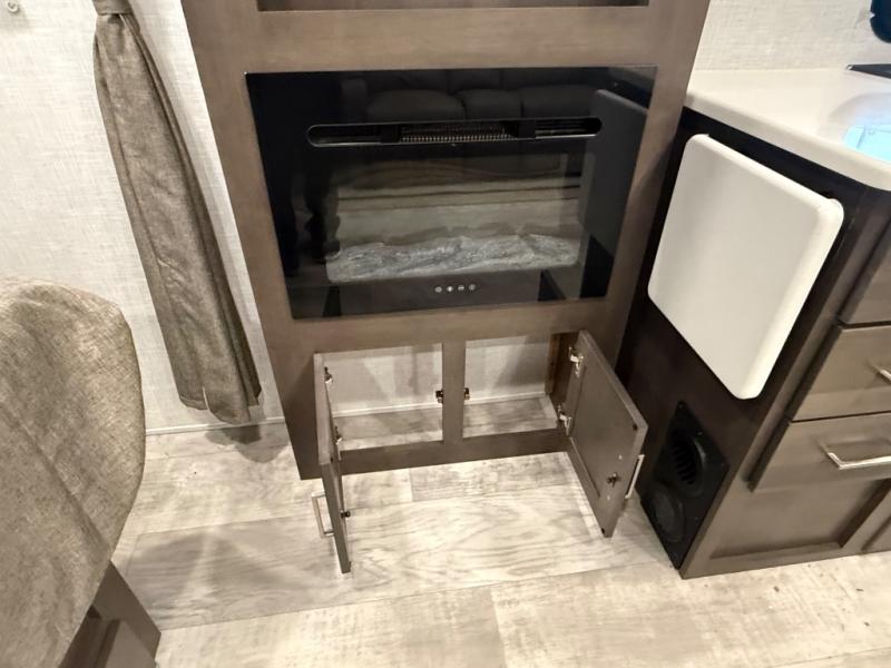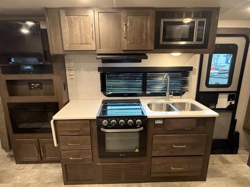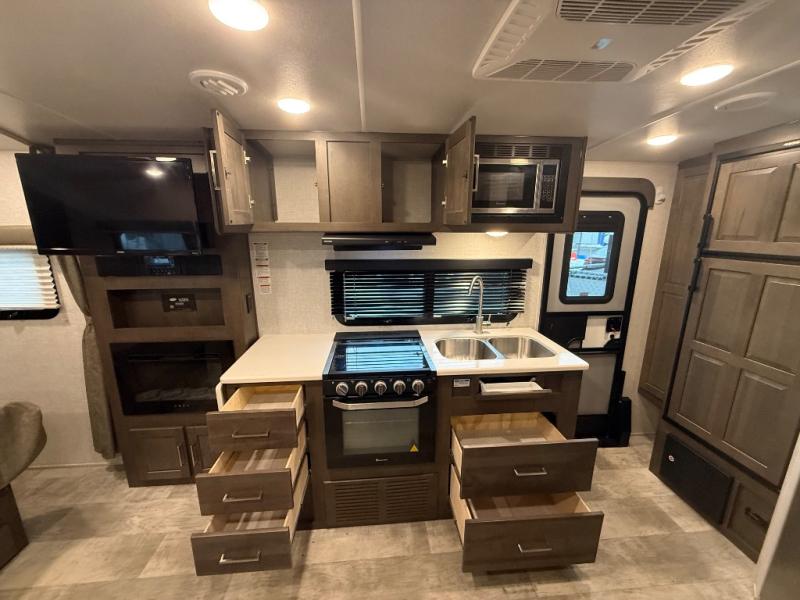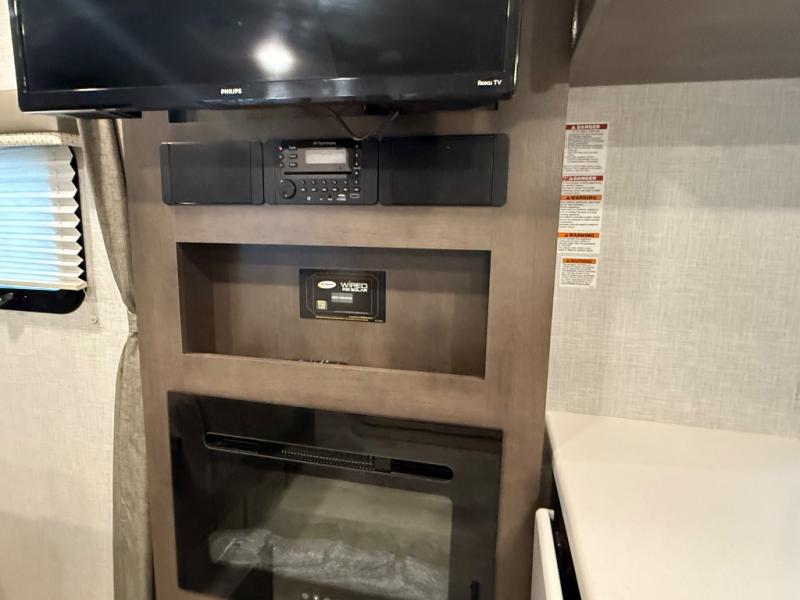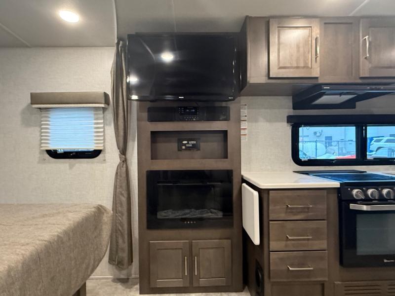 it's time to ditch that old tent and upgrade to this comfortable travel trailer. You will enjoy sleeping off of the floor on a queen bed, plus there are dual wardrobes for your clothes. There's no need to use the camp's facilities since this model includes a full bath, complete with a linen closet and shower skylight. The chef of the family will love preparing meals in the kitchen on the three burner cooktop, and there is a pantry to store dry goods and snacks. You and your spouse can get comfortable on the slide out theater seat that sits directly across from the entertainment center and fireplace!