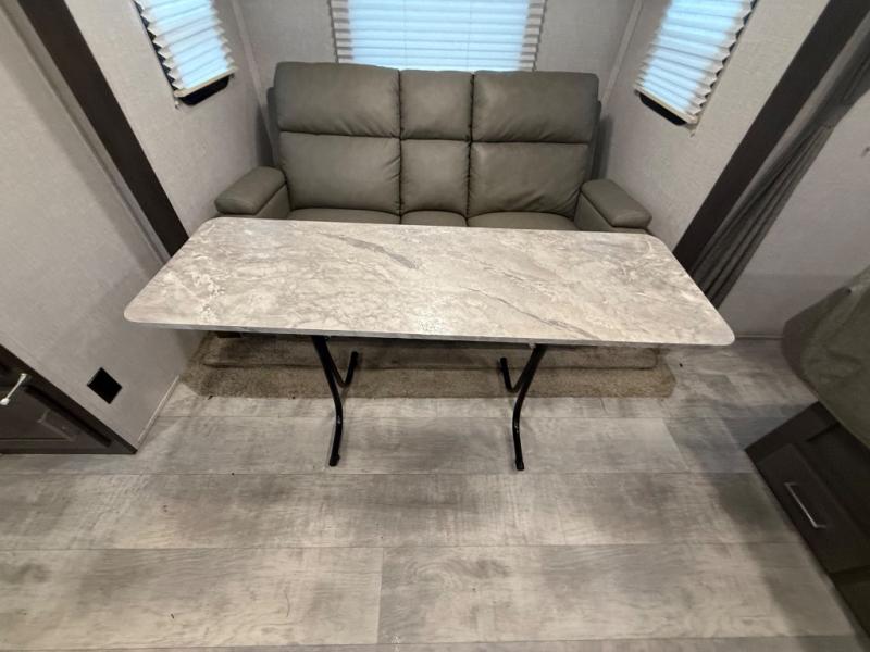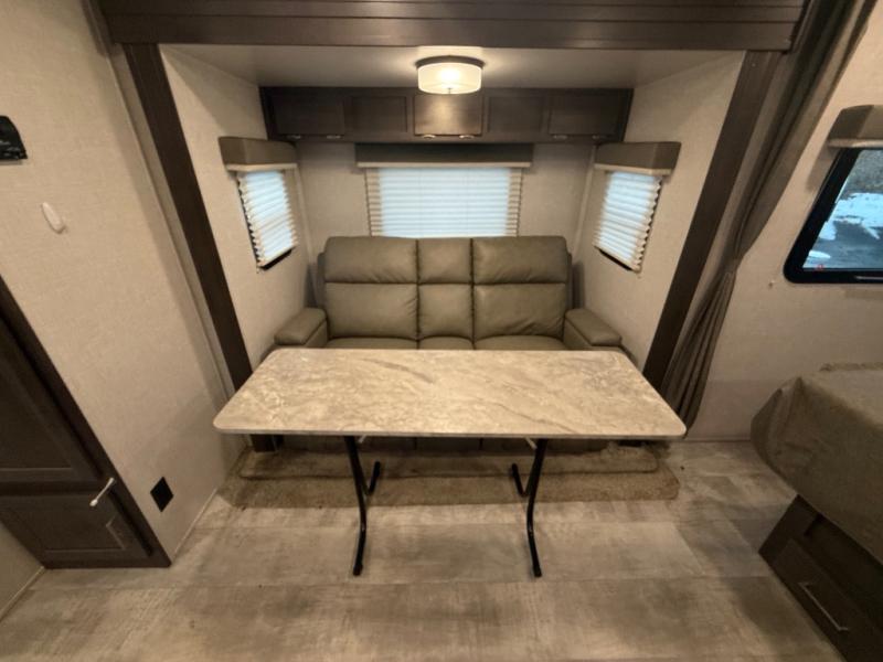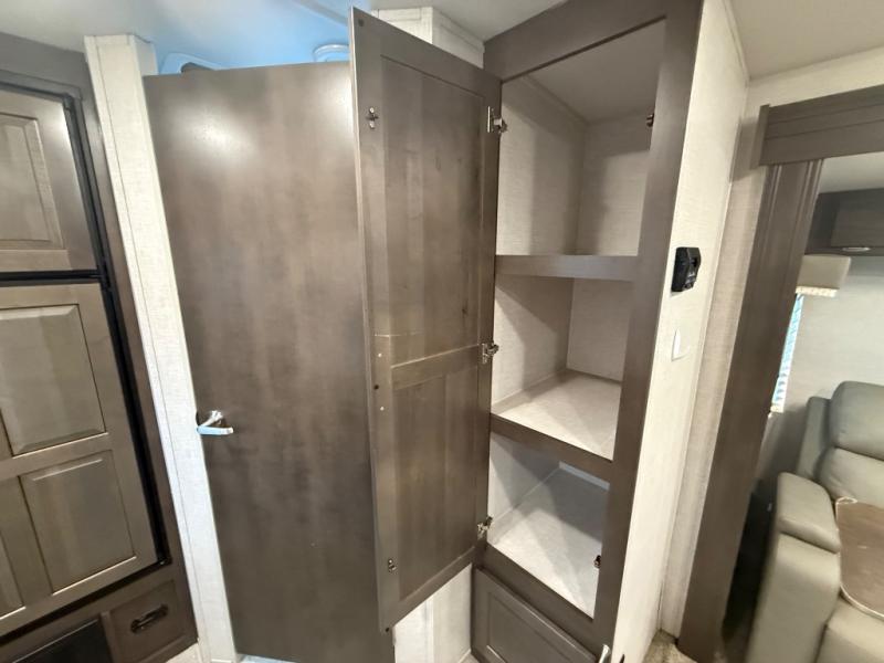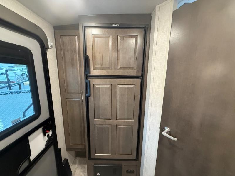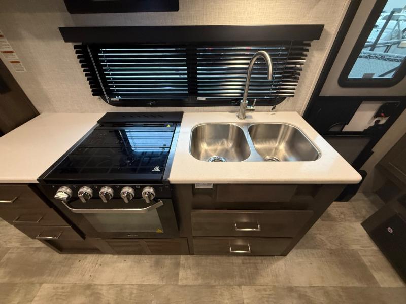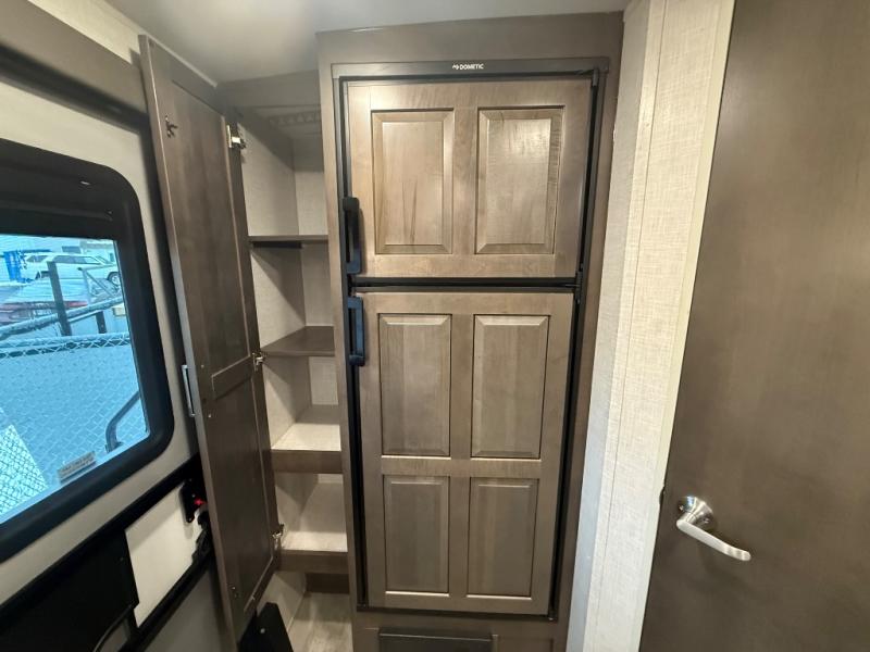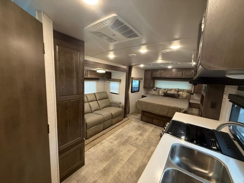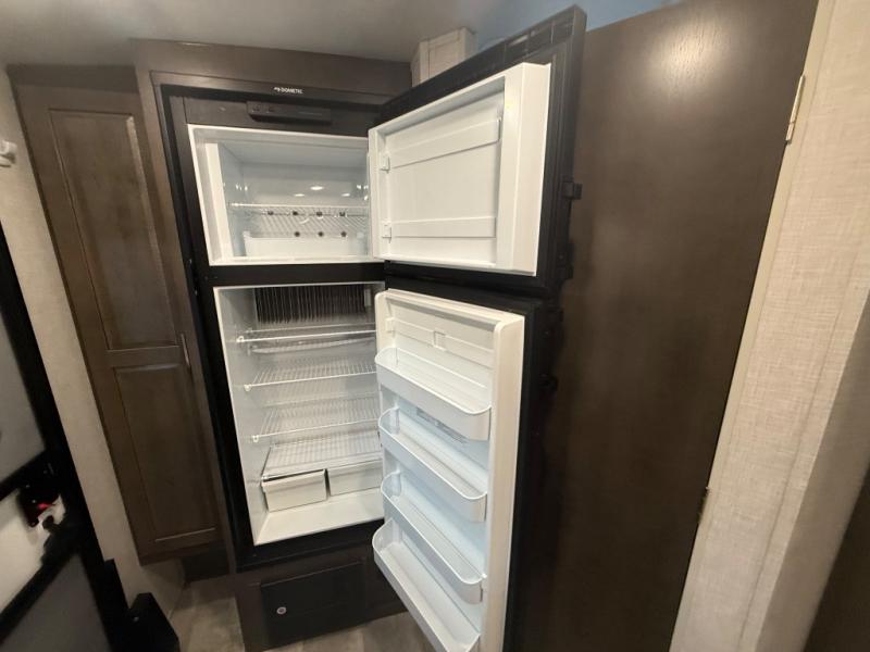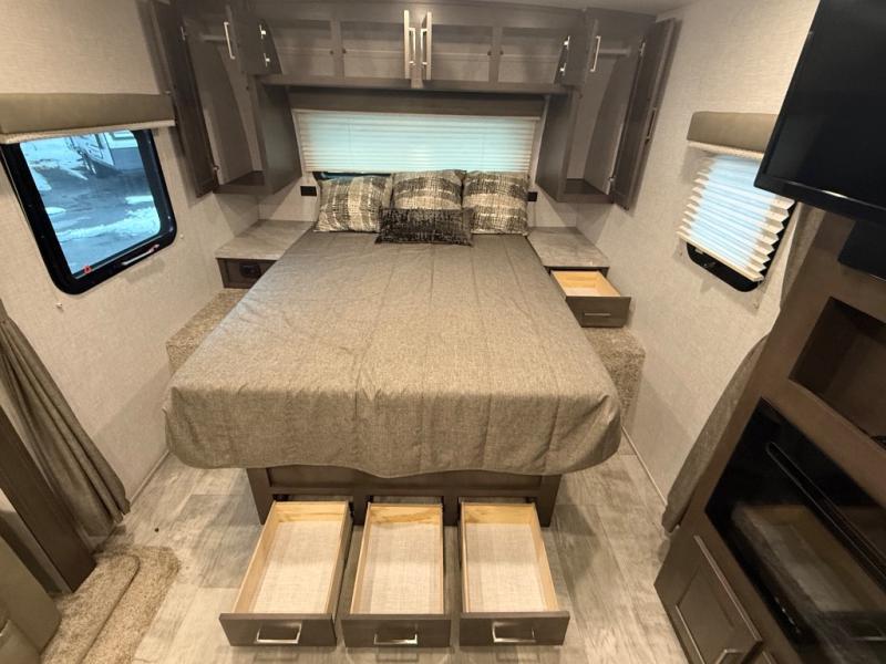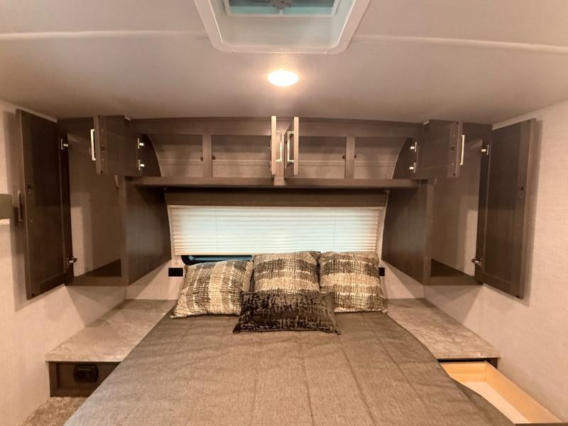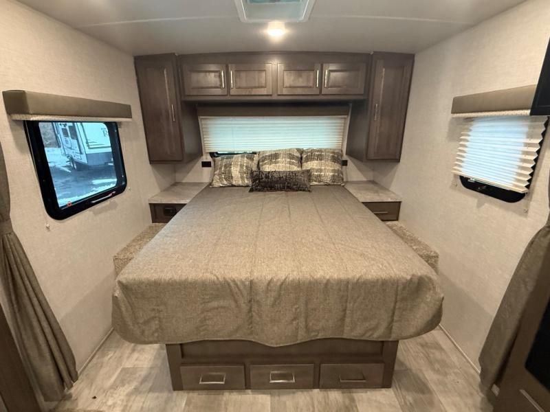 it's time to ditch that old tent and upgrade to this comfortable travel trailer. You will enjoy sleeping off of the floor on a queen bed, plus there are dual wardrobes for your clothes. There's no need to use the camp's facilities since this model includes a full bath, complete with a linen closet and shower skylight. The chef of the family will love preparing meals in the kitchen on the three burner cooktop, and there is a pantry to store dry goods and snacks. You and your spouse can get comfortable on the slide out theater seat that sits directly across from the entertainment center and fireplace!