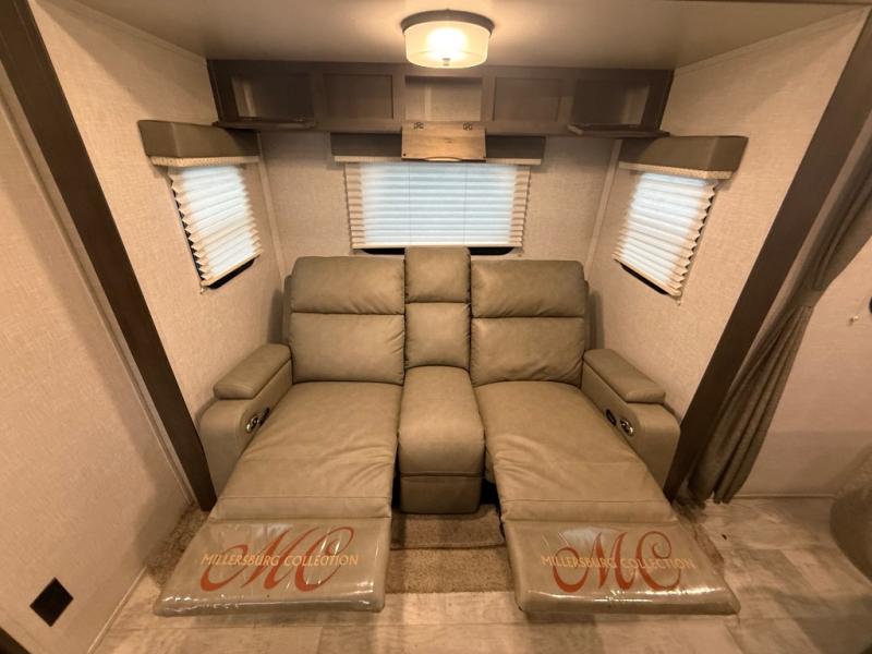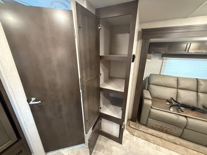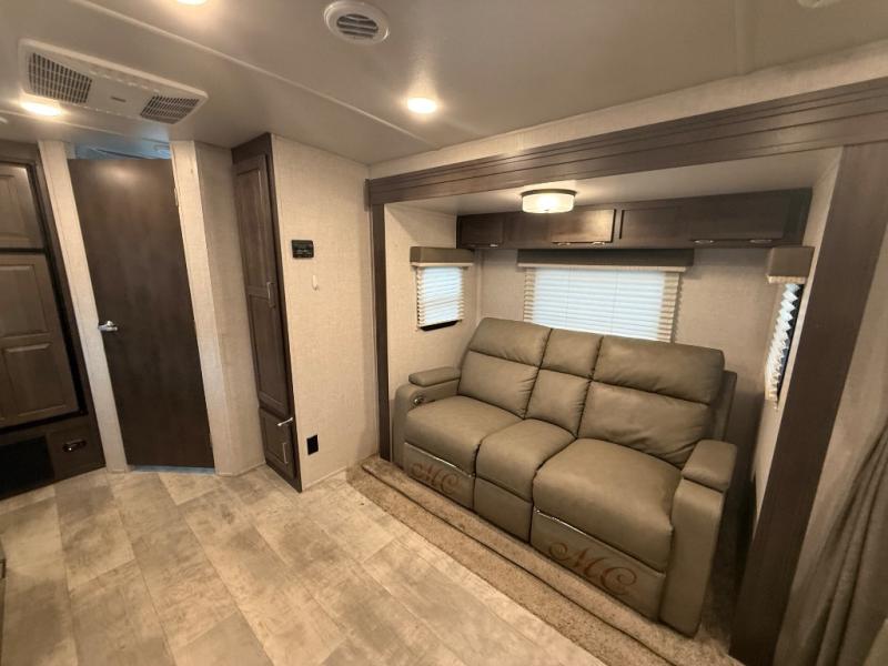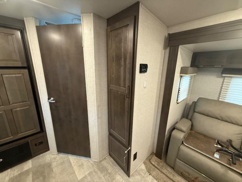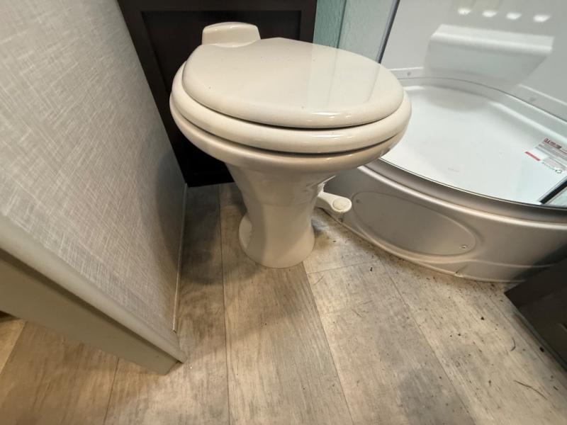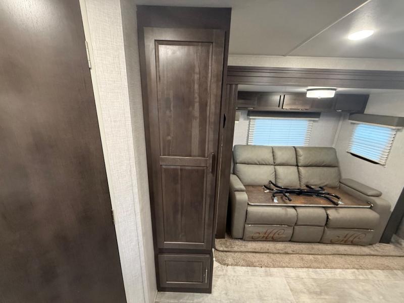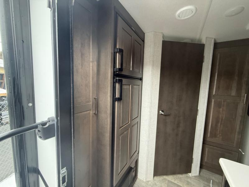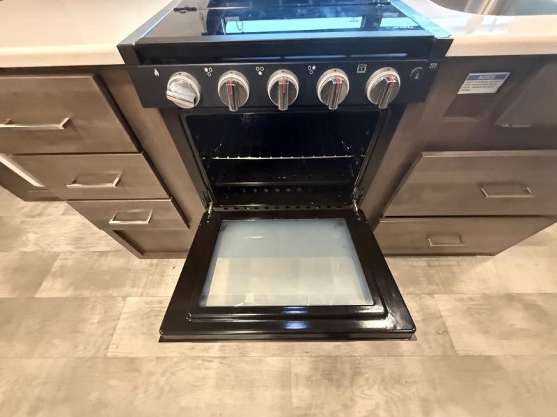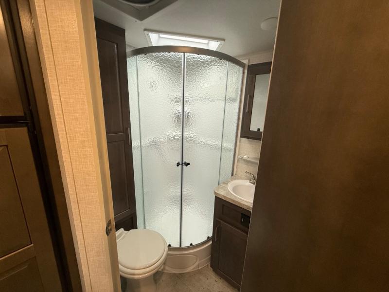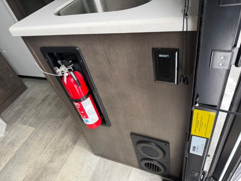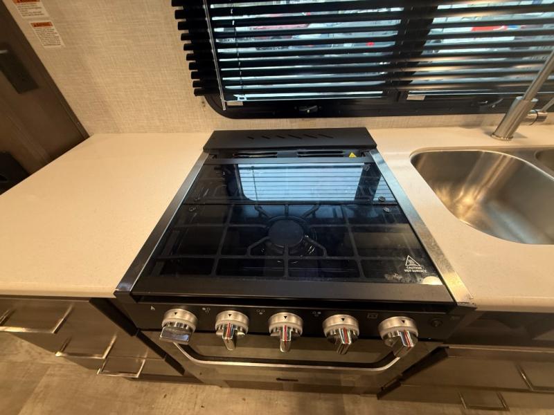it's time to ditch that old tent and upgrade to this comfortable travel trailer. You will enjoy sleeping off of the floor on a queen bed, plus there are dual wardrobes for your clothes. There's no need to use the camp's facilities since this model includes a full bath, complete with a linen closet and shower skylight. The chef of the family will love preparing meals in the kitchen on the three burner cooktop, and there is a pantry to store dry goods and snacks. You and your spouse can get comfortable on the slide out theater seat that sits directly across from the entertainment center and fireplace!