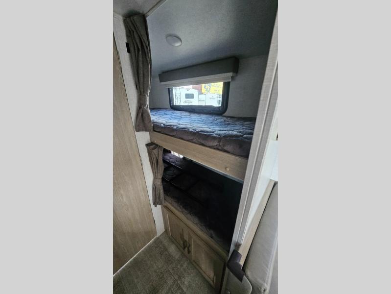 You and the kids will love camping in this travel trailer! It features a set of bunk beds with the bottom bunk being able to fold up. The rear corner bathroom has everything you will need to freshen up each morning. Grab some eggs and bacon from the gas/electric refrigerator, fry them up on the three burner cooktop, and enjoy them at the 32" dinette. Along the exterior is a front storage area, a ladder, a bike door to store the kids' bikes or other essentials, and a 13' power awning to protect you whether rain or shine!
