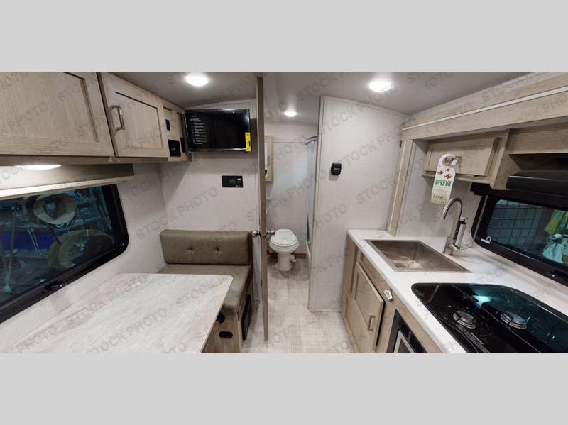 You will enjoy the comforts of home with this travel trailer! It features a full rear bathroom with a large shower and a linen closet to store your towels close by. The 32" dinette is a great place to enjoy a meal or play a card game, and you can watch the TV next to it too. The kitchen slide helps to open up the interior space, and has a three burner cooktop to create delicious meals and a gas/electric refrigerator to keep your beverages cold. Depending on what time of day you enter the unit will determine whether you see the 54" x 74" bed or the 73" sofa!