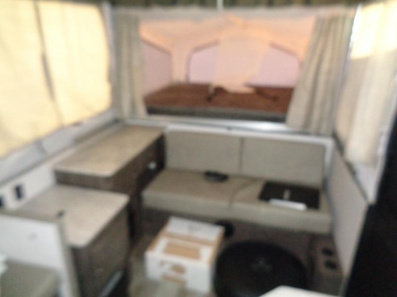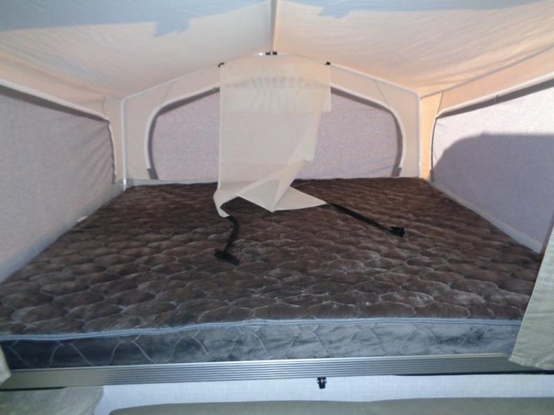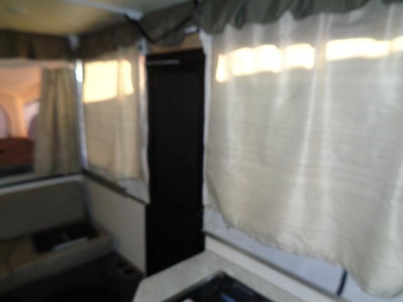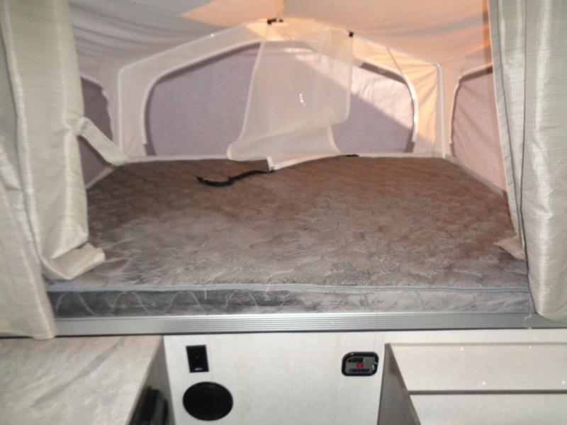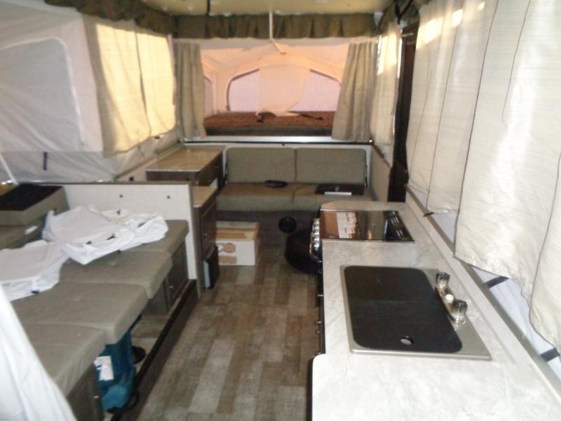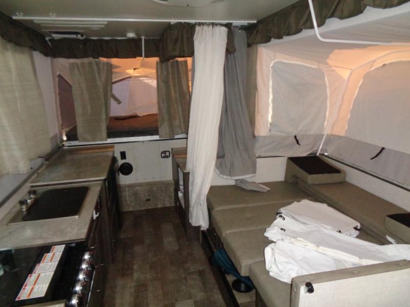 With any Forest River Rockwood High Wall folding pop-up camper, you will start with a powder coated tubular steel frame with five-piece Vinolon Supreme tenting, plus a power roof lift and four EZ crank down stabilizer jacks with sand pads for an easy and sturdy setup. The comfortable interior provides conveniences such as heated mattress bunk ends, a water filtration system, two bed end lights with a fan, and a hot water package including an outside shower. Choose a High Wall today for the travel trailer type amenities and the easy storage and towing capabilities!