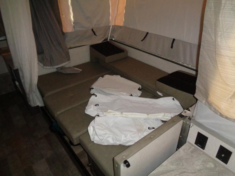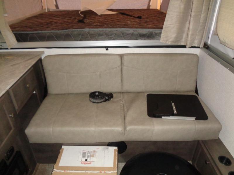Enjoy inside comforts while sitting at the sofa with a table or the U-shaped slide out while eating or playing games before or after you explore outdoors! The cook will have a three burner cooktop, an oven and a three-way refrigerator to keep everyone fed, plus an outdoor griddle. The interior also offers a TV shelf, cabinet and counter space for your clothing and cellphones, plus a cassette toilet with a shower curtain for privacy. And you will find lots of exterior storage compartments for more gear, plus a 13' awning offering some protection from the sun.