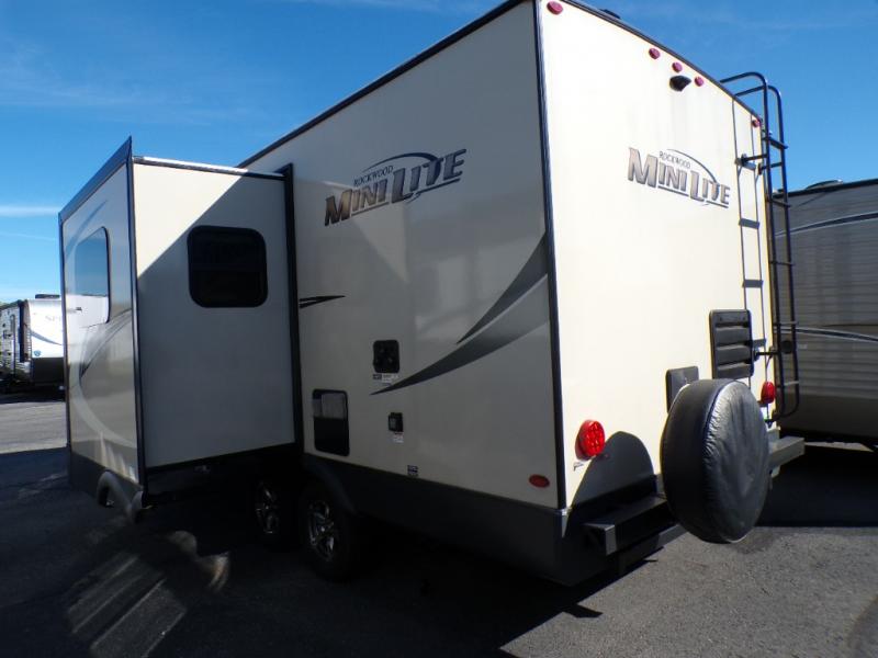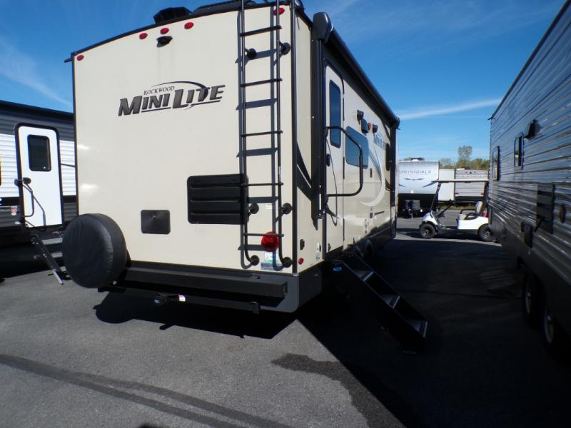 The easy-to-tow, lightweight Rockwood Mini Lite travel trailers by Forest River are the adventurer's dream come true. The six sided aluminum frame, fully laminated one-piece walkable roof, and painted fiberglass front cap with clear coat will provide a strong, durable unit that will last through years of memories and fun. You will appreciate many convenient features, such as the Maxxair fan with a cover, the back-up camera prep, and the Teton All In One WiFi booster with LTE prep and an antenna if you need to get some work done while you're away from home. Each model includes hardwood cabinet doors, a monitor panel switch with the OneControl app, and solid surface kitchen countertops. You will stay entertained on those rainy days with the multizone stereo with DVD, CD, AM/FM and Bluetooth control, and there are outdoor speakers so you will be the life of the campground. Choose your favorite Rockwood Mini Lite layout today!