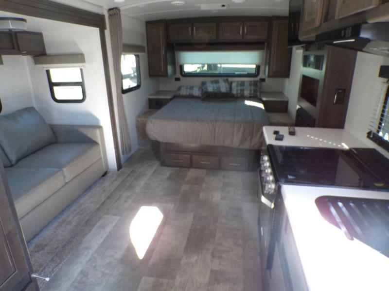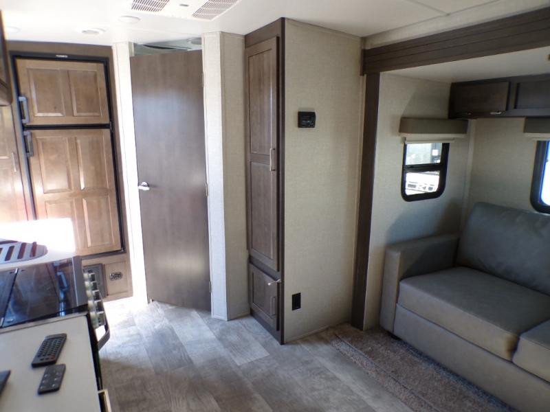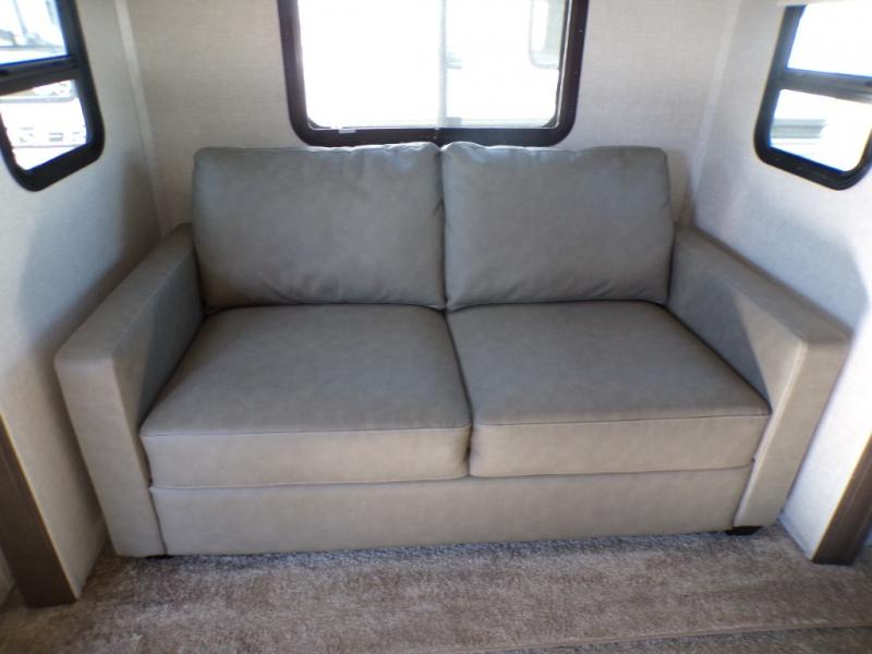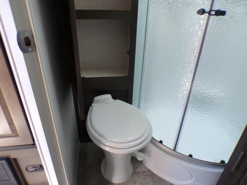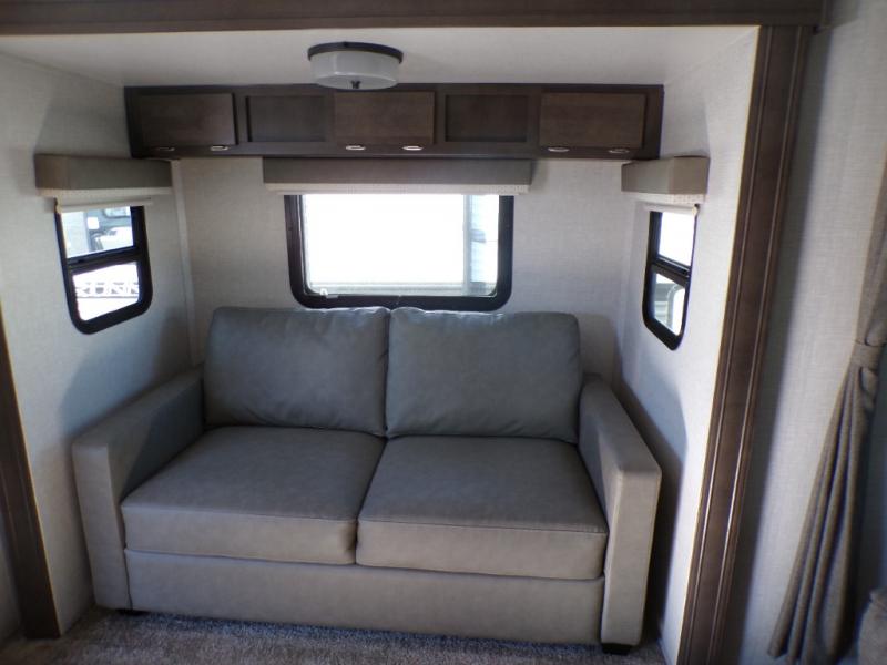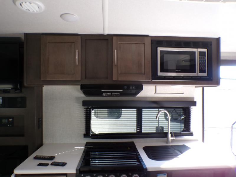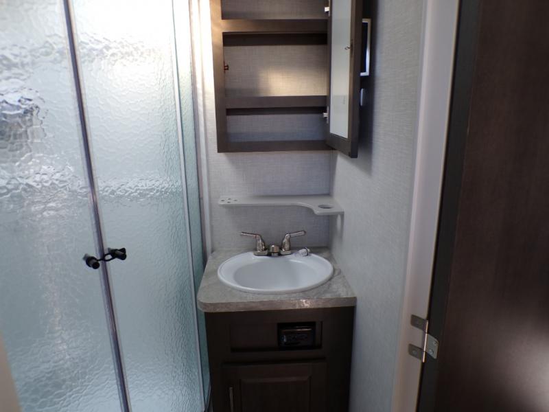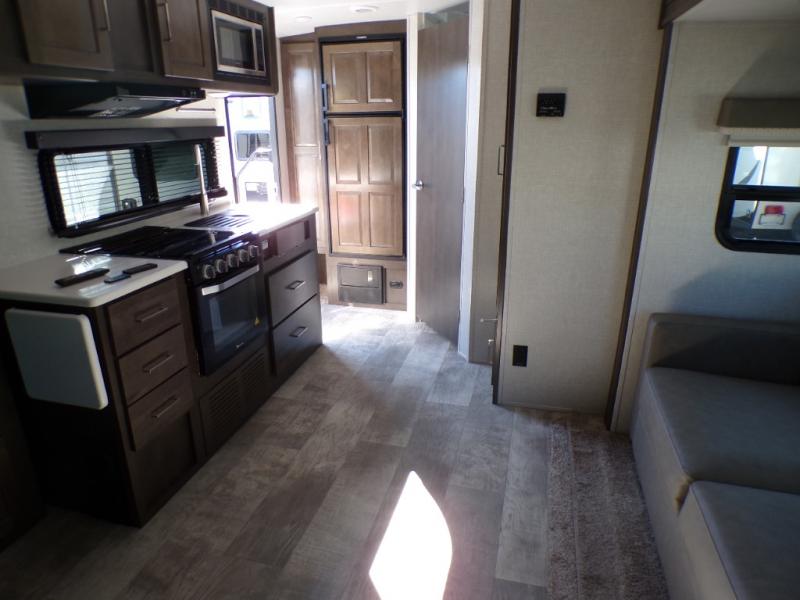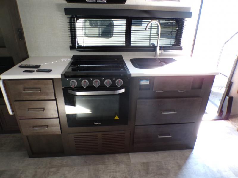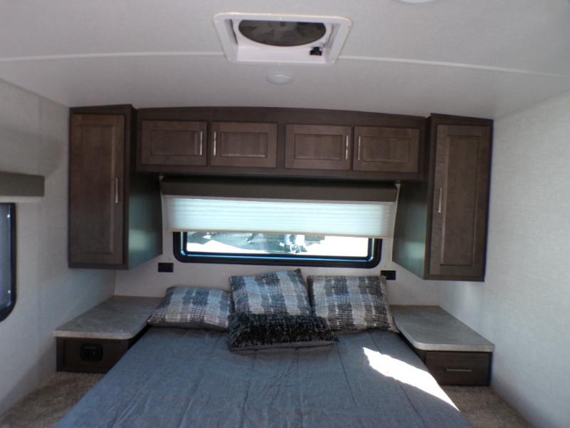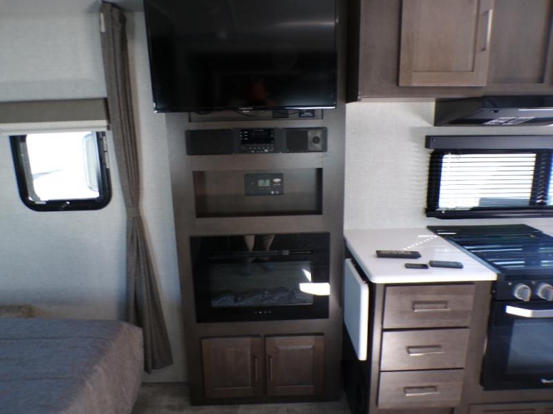 it's time to ditch that old tent and upgrade to this comfortable travel trailer. You will enjoy sleeping off of the floor on a queen bed, plus there are dual wardrobes for your clothes. There's no need to use the camp's facilities since this model includes a full bath, complete with a linen closet and shower skylight. The chef of the family will love preparing meals in the kitchen on the three burner cooktop, and there is a pantry to store dry goods and snacks. You and your spouse can get comfortable on the slide out theater seat that sits directly across from the entertainment center and fireplace!