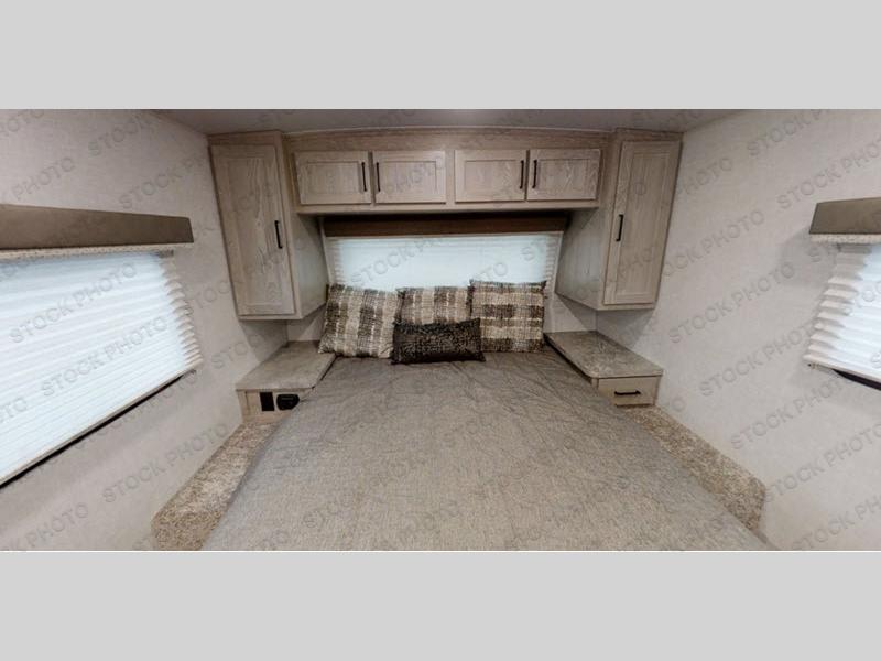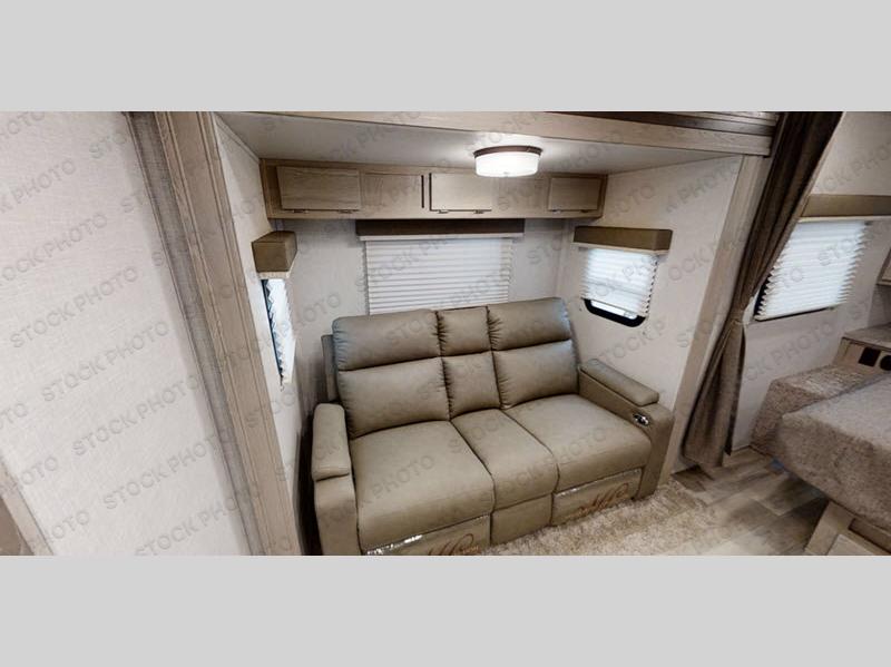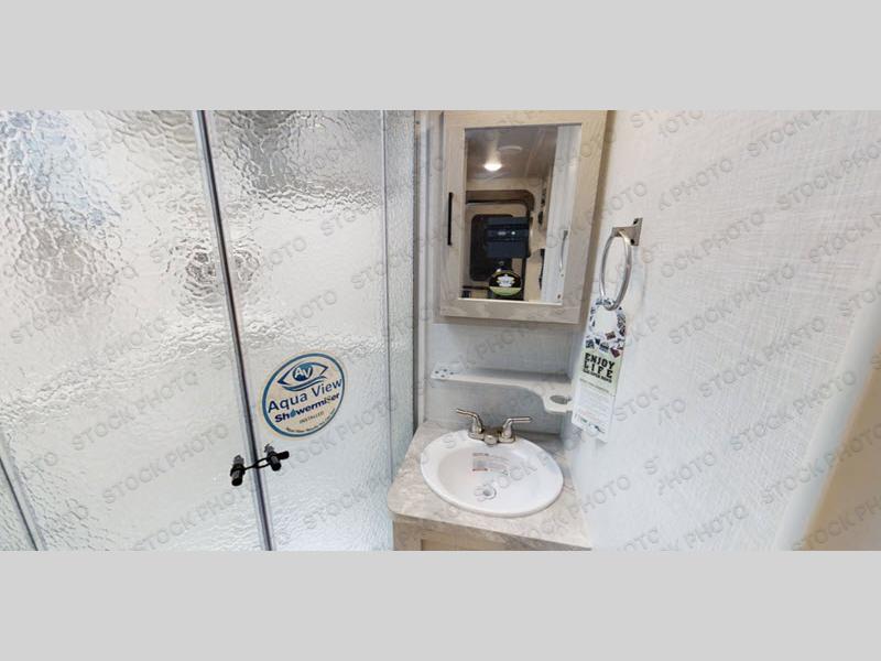 it's time to ditch that old tent and upgrade to this comfortable travel trailer. You will enjoy sleeping off of the floor on a queen bed, plus there are dual wardrobes for your clothes. There's no need to use the camp's facilities since this model includes a full bath, complete with a linen closet and shower skylight. The chef of the family will love preparing meals in the kitchen on the three burner cooktop, and there is a pantry to store dry goods and snacks. You and your spouse can get comfortable on the slide out theater seat that sits directly across from the entertainment center and fireplace!
