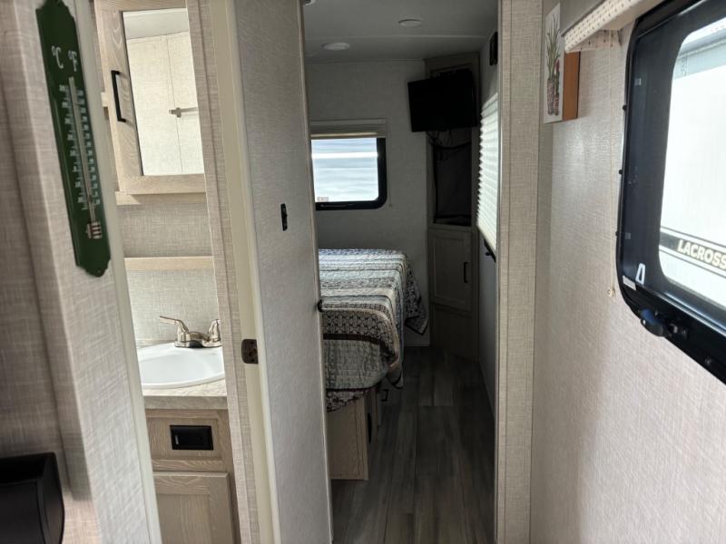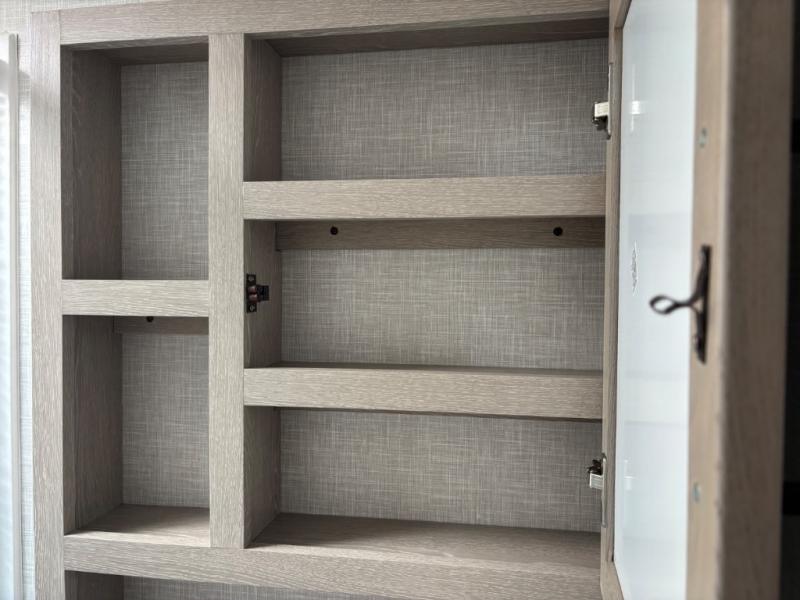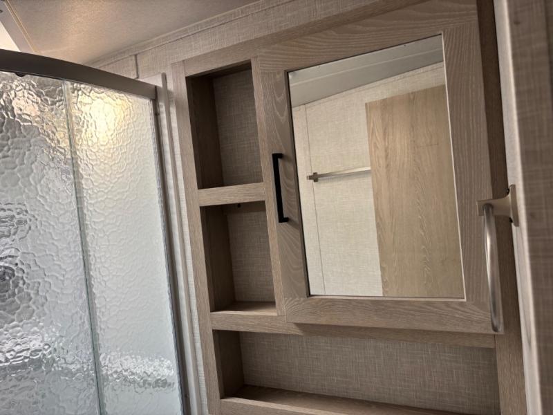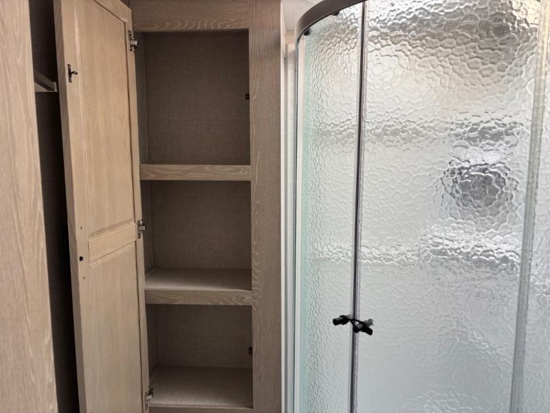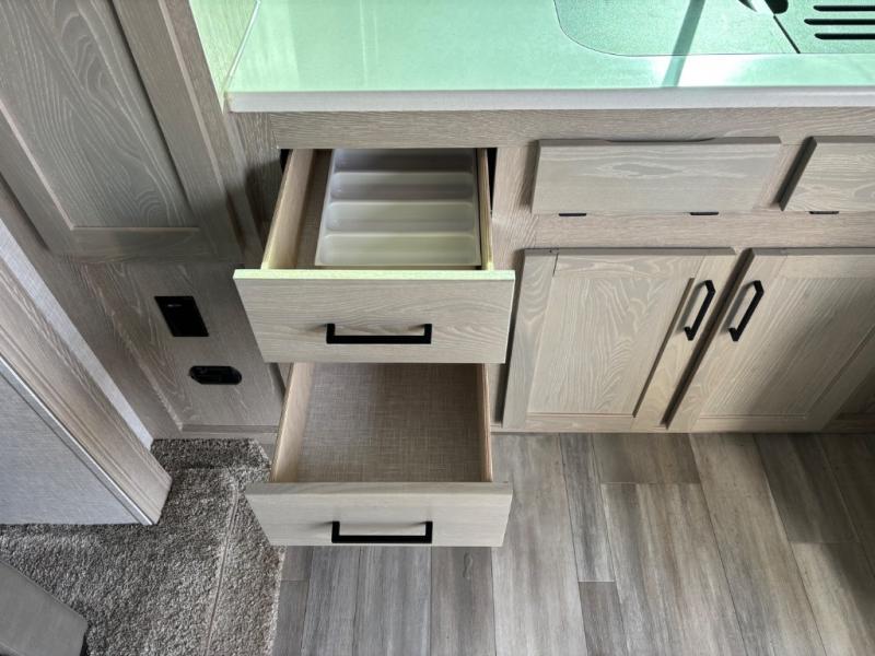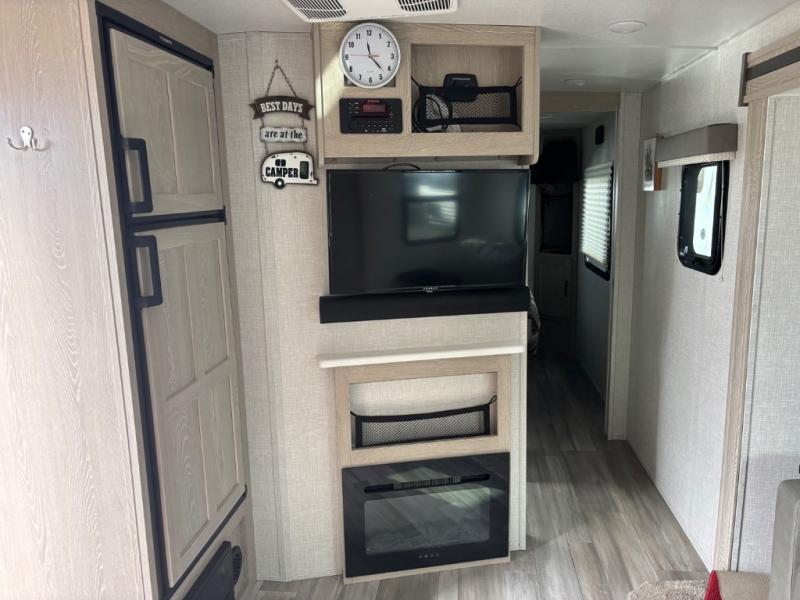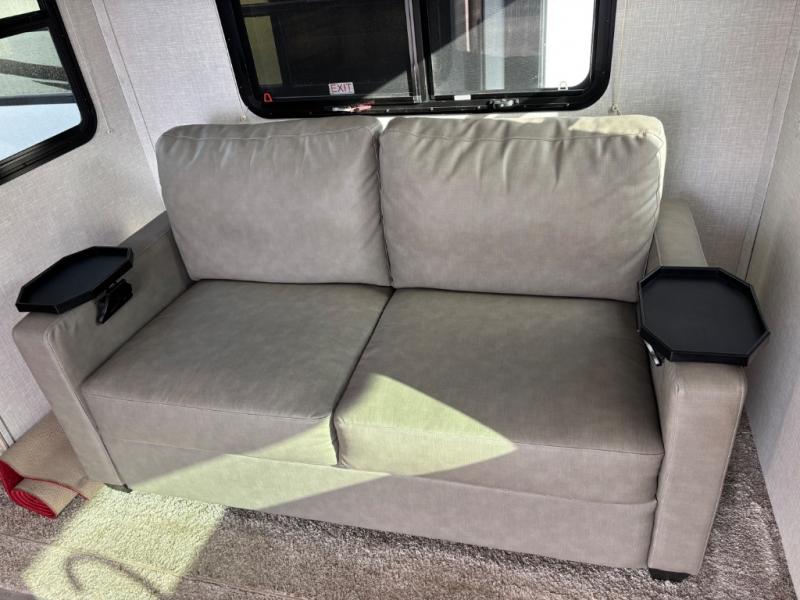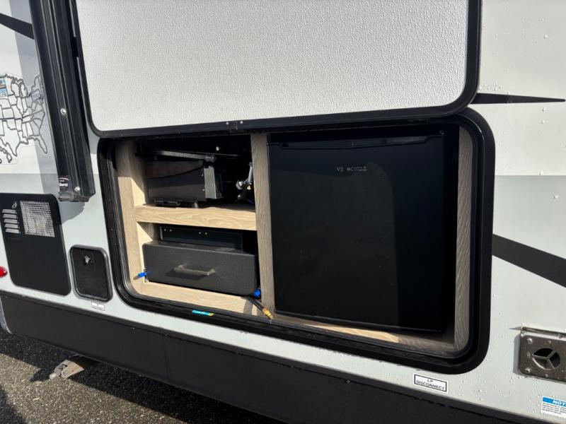 If you like the front kitchen layout, you're going to love this one! You'll have plenty of counter space to prepare and cook meals, or you may just want to head outdoors to cook on the outside griddle. There is a 19' power awning with LED lights to keep you protected from the sun and rain, and there are three exterior storage compartments for lawn chairs, fishing poles, and firewood! This model includes a U-shaped dinette slide in perfect view of the 12V smart entertainment TV and fireplace, and this area can double as your guests' sleeping space at night. You'll stay comfortable in the rear bedroom that includes an RV queen bed, dual bedroom wardrobes, and an optional TV if you enjoy movies in bed!