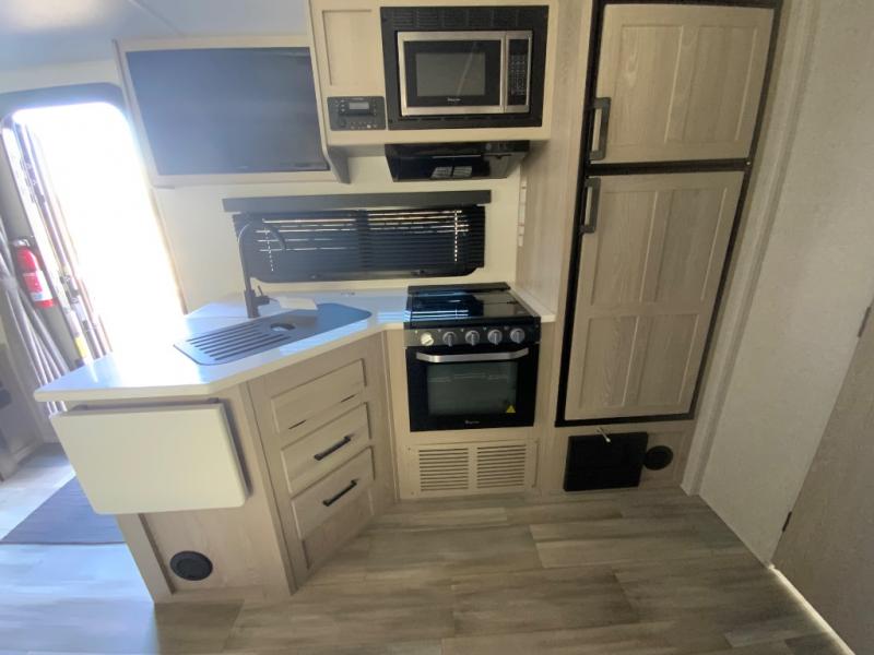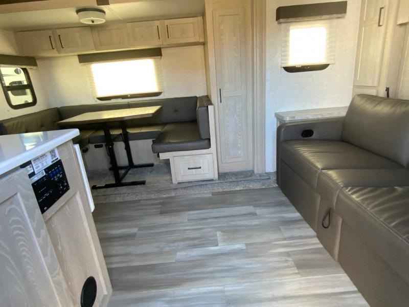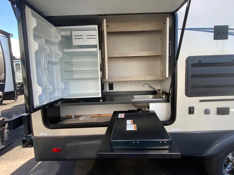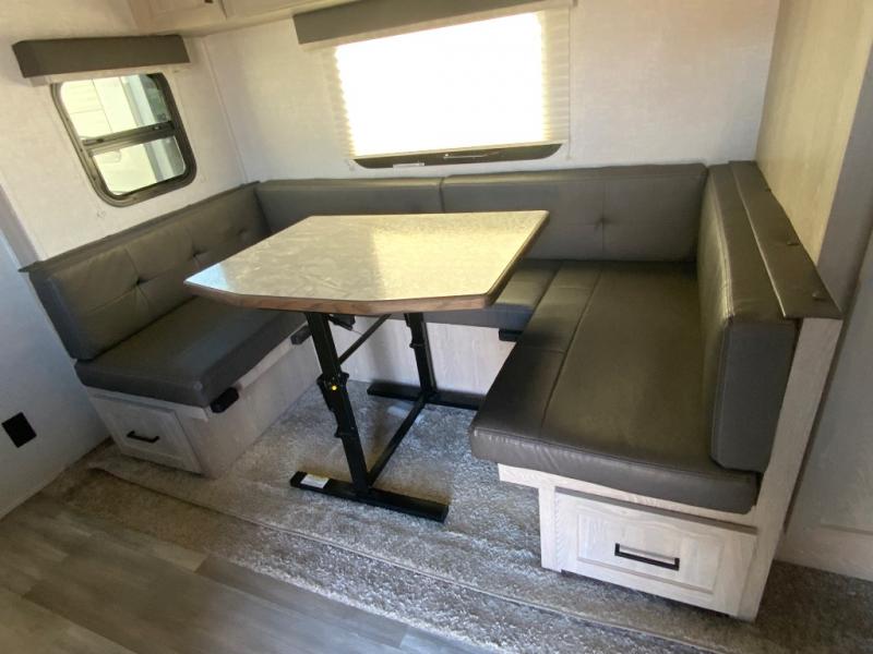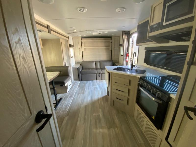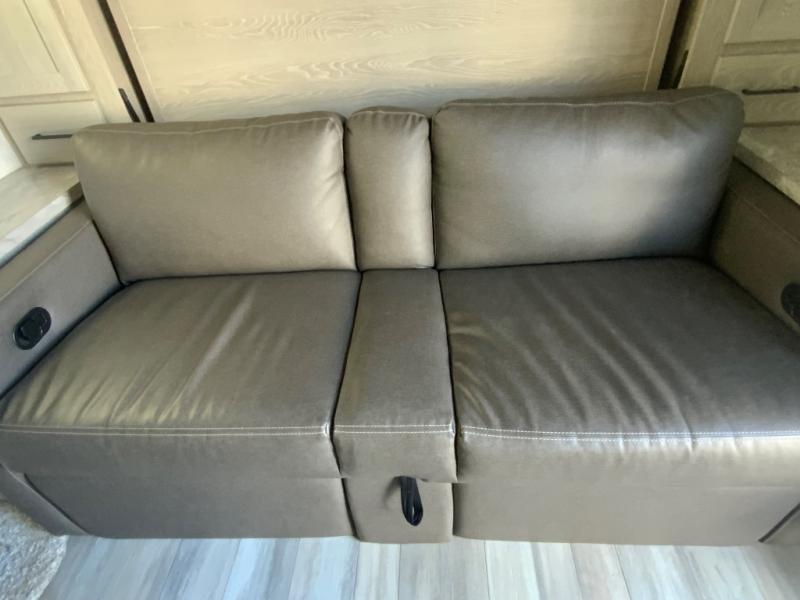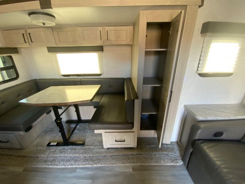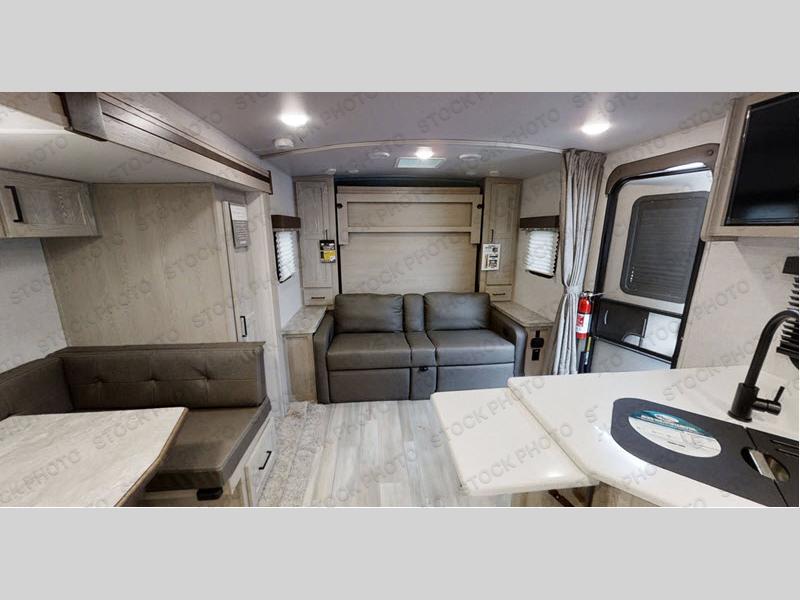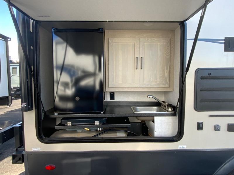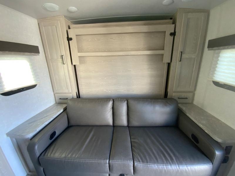 If you're looking for more interior space, more comfort, and more storage, look no further than this travel trailer. Not only is there a pass-through storage, but there is also a drop frame pass-through as well for maximum storage! There is a sofa to relax on during the day and enjoy more floor space, and a comfortable Murphy bed to fold down and sleep on at night. If you have any overnight guests, they can sleep on the slide out U-shaped dinette. Paper goods and snacks can go in the lean-in pantry, while you store clothes in necessities in the three wardrobes. The chef of the family can choose to cook inside, or outside on the outdoor kitchen, plus there is a 19' power awning with LED lights that will provide protection from the elements!