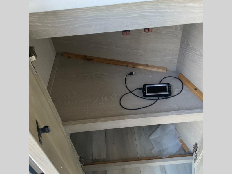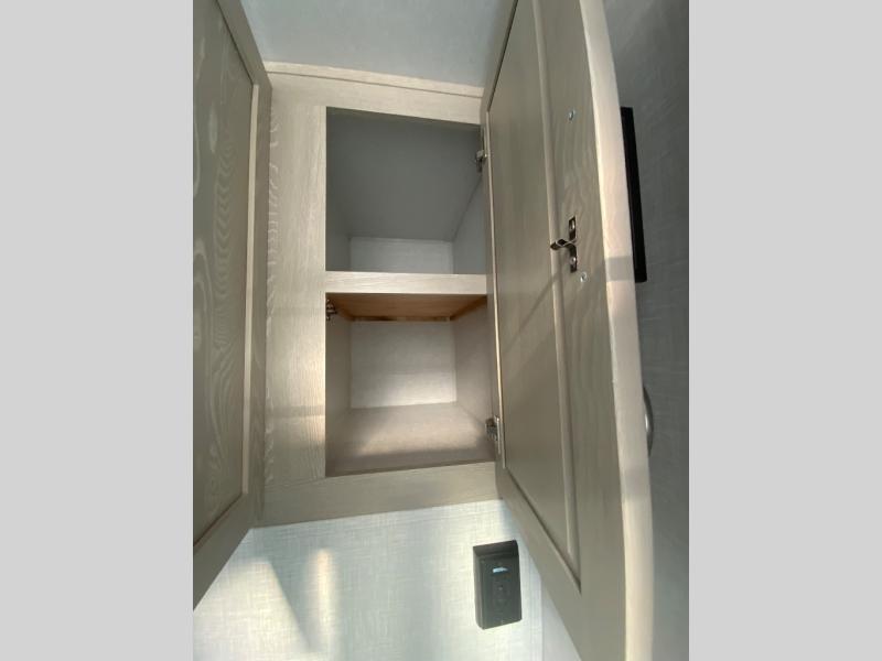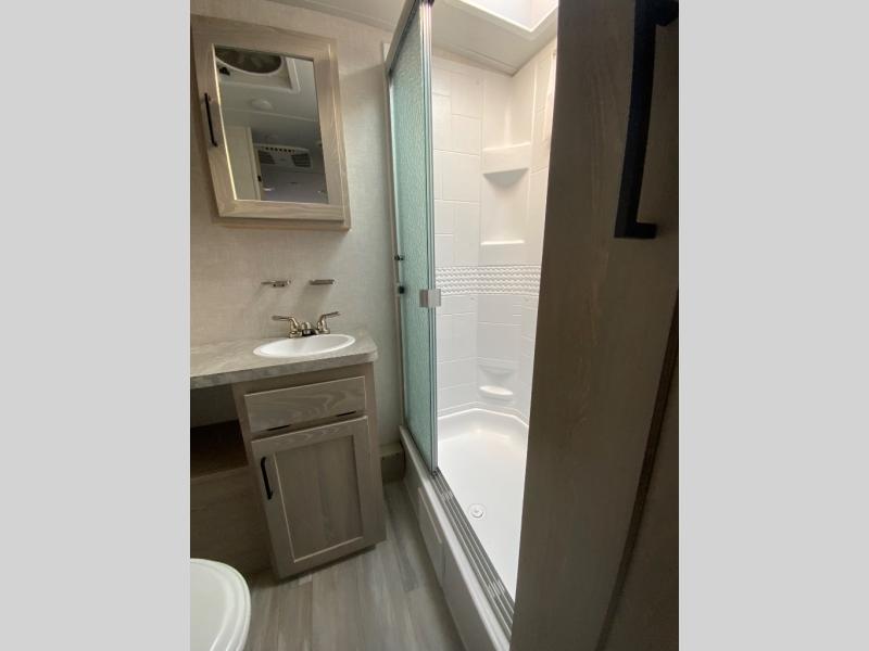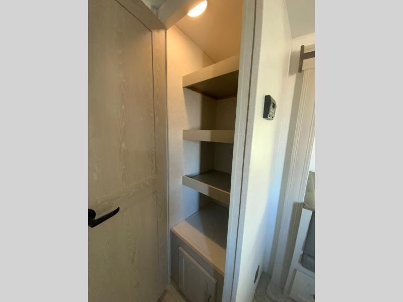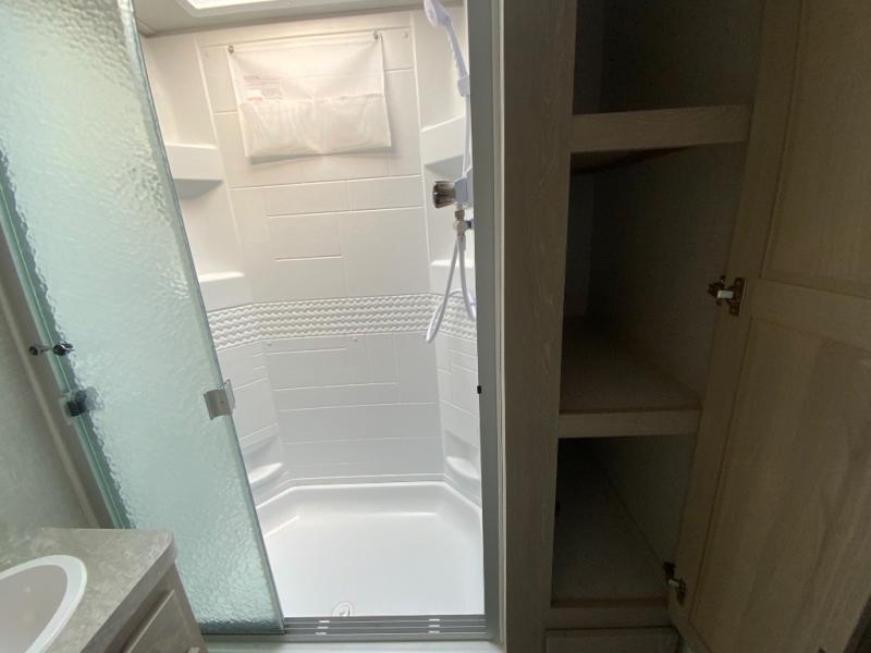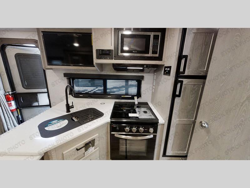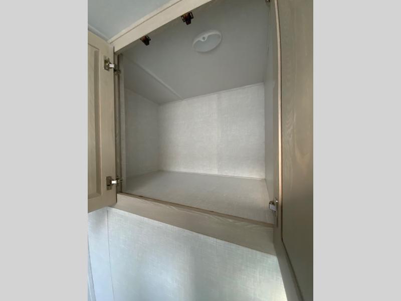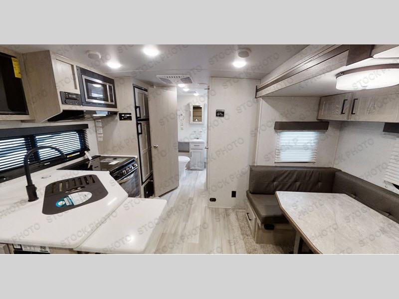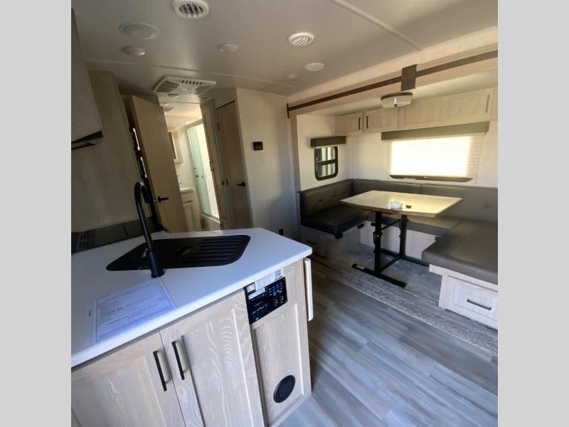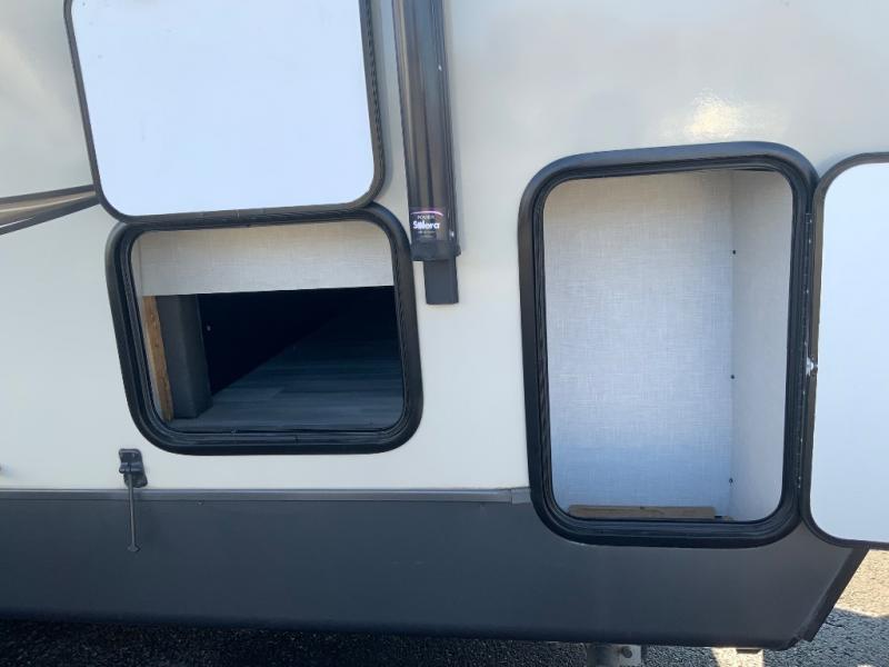 If you're looking for more interior space, more comfort, and more storage, look no further than this travel trailer. Not only is there a pass-through storage, but there is also a drop frame pass-through as well for maximum storage! There is a sofa to relax on during the day and enjoy more floor space, and a comfortable Murphy bed to fold down and sleep on at night. If you have any overnight guests, they can sleep on the slide out U-shaped dinette. Paper goods and snacks can go in the lean-in pantry, while you store clothes in necessities in the three wardrobes. The chef of the family can choose to cook inside, or outside on the outdoor kitchen, plus there is a 19' power awning with LED lights that will provide protection from the elements!