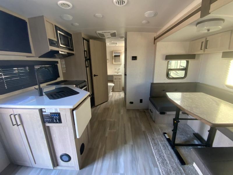 The easy-to-tow, lightweight Rockwood Mini Lite travel trailers by Forest River are the adventurer's dream come true. The six sided aluminum frame, fully laminated one-piece walkable roof, and painted fiberglass front cap with clear coat will provide a strong, durable unit that will last through years of memories and fun. You will appreciate many convenient features, such as the Maxxair fan with a cover, the back-up camera prep, and the Teton All In One WiFi booster with LTE prep and an antenna if you need to get some work done while you're away from home. Each model includes hardwood cabinet doors, a monitor panel switch with the OneControl app, and solid surface kitchen countertops. You will stay entertained on those rainy days with the multizone stereo with DVD, CD, AM/FM and Bluetooth control, and there are outdoor speakers so you will be the life of the campground. Choose your favorite Rockwood Mini Lite layout today!