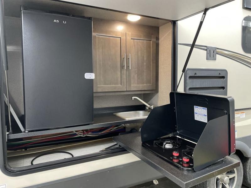 Your search is over for the perfect family-friendly travel trailer! The kids are sure to love the double-size bunks, while mom and dad sleep on the front Murphy bed. The sofa will provide comfortable seating space when the Murphy bed is tucked away, and the U-shaped dinette will allow additional guests to sleep over. You will find all the indoor kitchen appliances needed to prepare meals each day, as well as an outside kitchen that will be perfect when cooking bacon or fish. You won't have to leave your comforts of home behind since this model includes plenty of storage space, including three wardrobes, a pantry, plus an exterior pass-through storage for fishing poles!