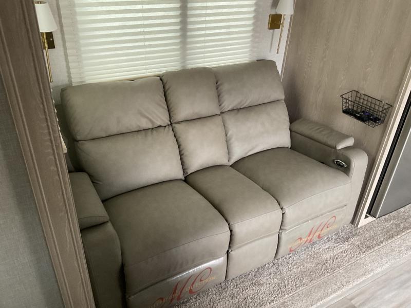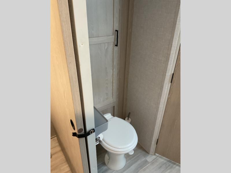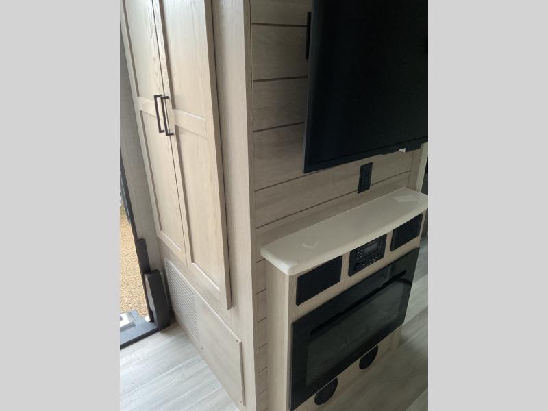 You and your spouse will love every minute spent in this travel trailer, from cooking meals in the front kitchen, relaxing on the theater seat, or sleeping on the slide out queen bed! The entertainment center and fireplace will make it feel more like home, and you'll find plenty of storage space, including a kitchen pantry and a large bedroom wardrobe for all your clothes. The walk-through bath is easily accessible, plus the bedroom includes its own exterior entry door for convenience. If you're needing more sleeping space, just choose the optional hide-a-bed sofa in place of the theater seat, or you can choose the optional free-standing table for a place to dine at.