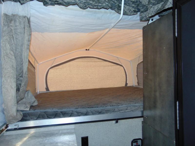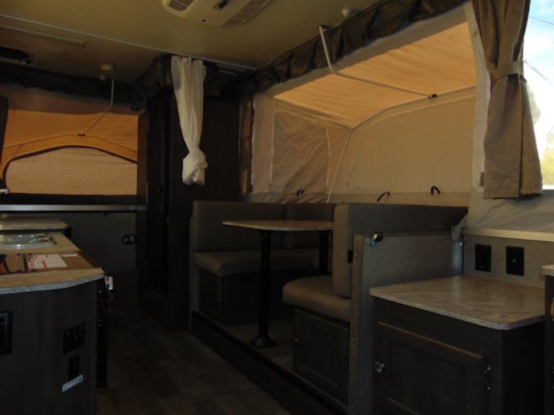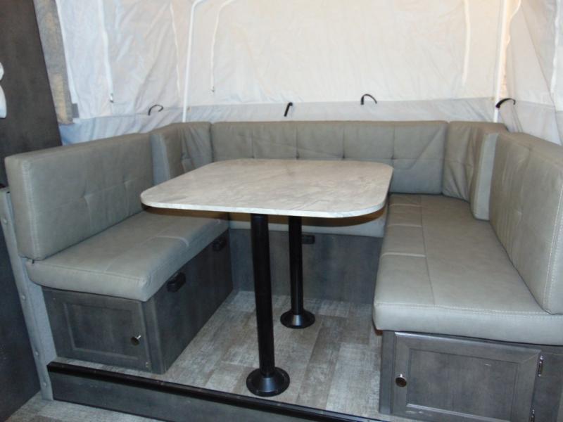 With any Forest River Rockwood High Wall folding pop-up camper, you will start with a powder coated tubular steel frame with five-piece Vinolon Supreme tenting, plus a power roof lift and four EZ crank down stabilizer jacks with sand pads for an easy and sturdy setup. The comfortable interior provides conveniences such as heated mattress bunk ends, a water filtration system, two bed end lights with a fan, and a hot water package including an outside shower. Choose a High Wall today for the travel trailer type amenities and the easy storage and towing capabilities!