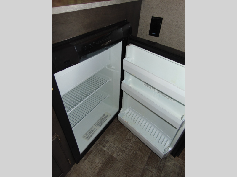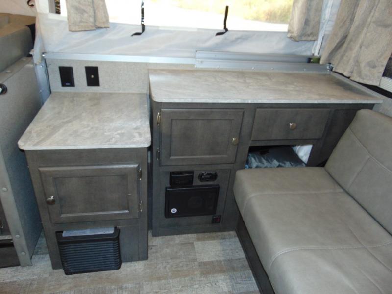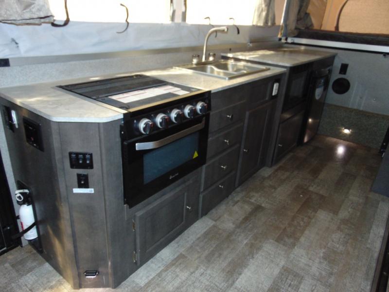 Enjoy inside comforts while sitting at the sofa with a table or the U-shaped slide out while eating or playing games before or after you explore outdoors! The cook will have a three burner cooktop, an oven and a three-way refrigerator to keep everyone fed, plus an outdoor griddle. The interior also offers a TV shelf, cabinet and counter space for your clothing and cellphones, plus a cassette toilet with a shower curtain for privacy. And you will find lots of exterior storage compartments for more gear, plus a 13' awning offering some protection from the sun.