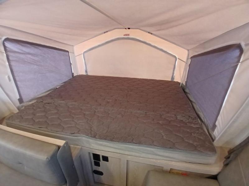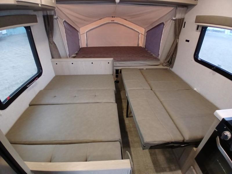 Weekend trips to the lake have never been easier than in this expandable trailer that can sleep six people each night. The two queen tent end beds will provide a comfy place to rest after traveling all day, and the kids can relax on the flip sofa or booth dinette. Prepare a quick lunch on the exterior griddle, or use the three burner gas cooktop before heading out on a trail. There is a full bath in this model which is sure to come in handy, and you'll appreciate storage space throughout for all your belongings.