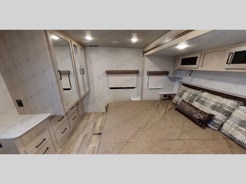 This travel trailer with a front kitchen layout is sure to bring you years of memories camping with family. The large slide out in the main living area is where the kids can enjoy their breakfast at the booth dinette, and you relax on the theater seat with your coffee. After a day at the lake everyone can freshen up in the dual entry bath before heading outside to sit under the 21' power awning with LED lights. Your guests can sleep on the hide-a-bed sofa and booth dinette, while you and your spouse enjoy the king bed slide out in the rear private suite. It's a win-win for everyone in this travel trailer!
