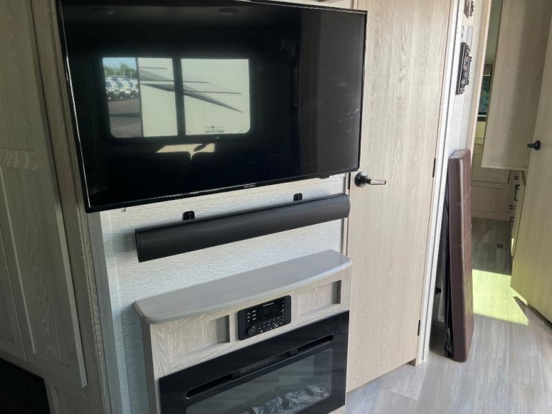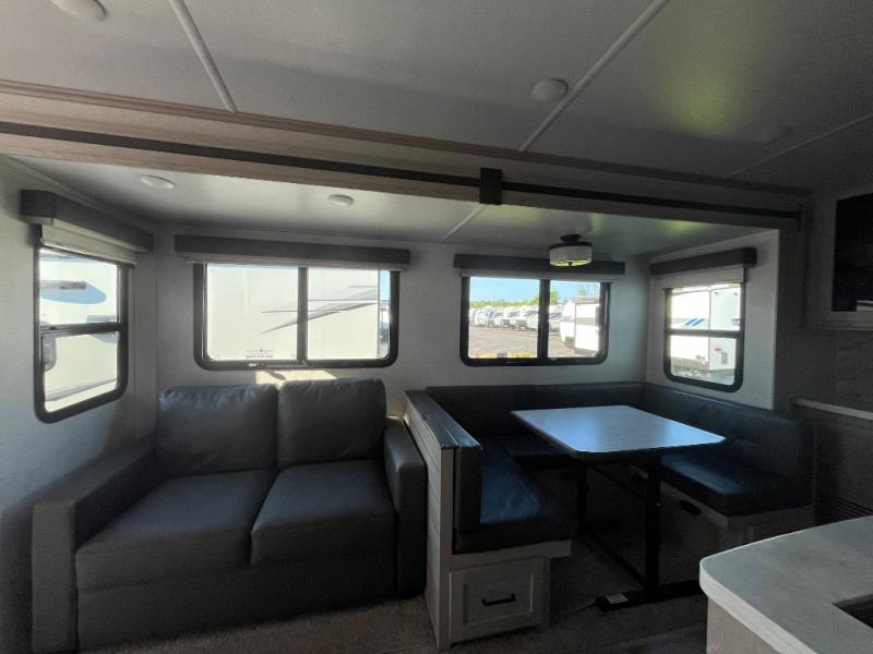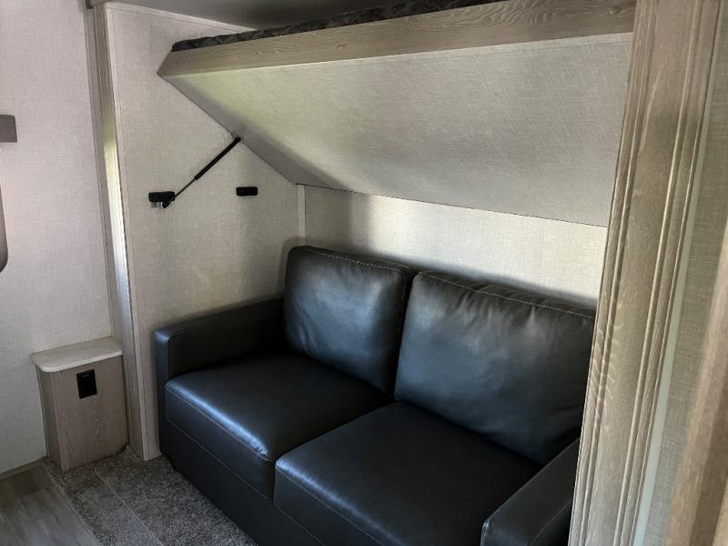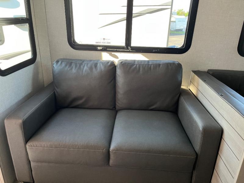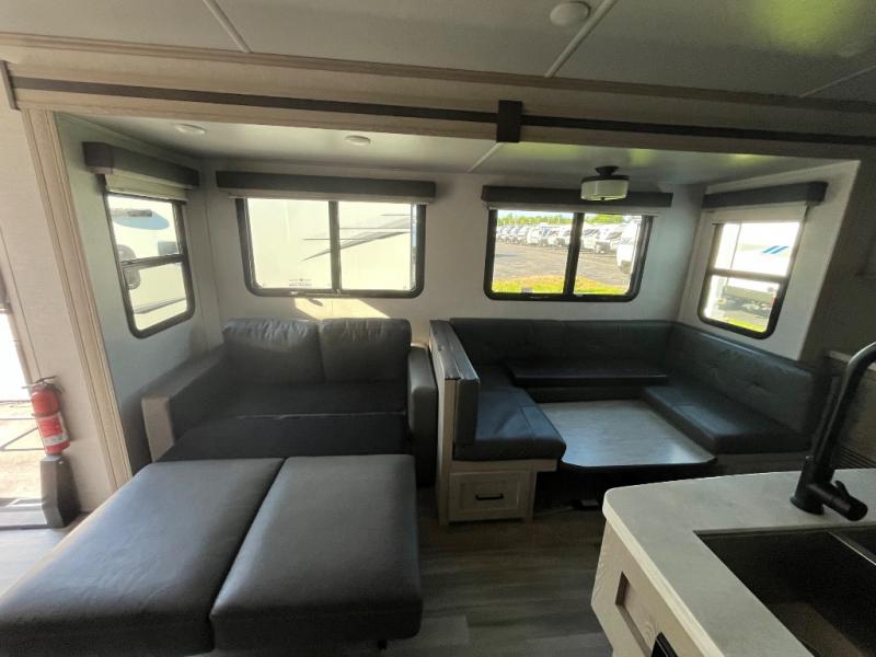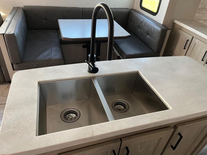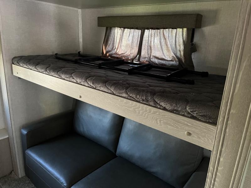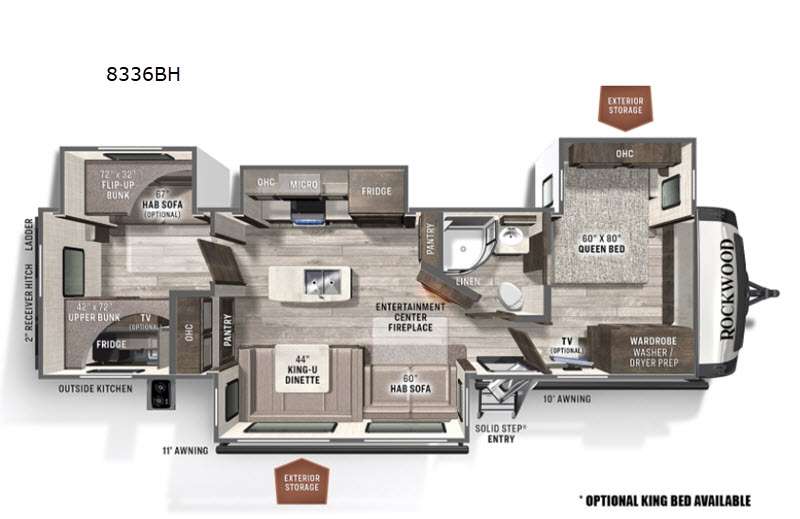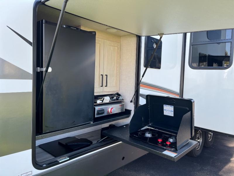 Load up your clothing, food, camping gear and family of eight for a weekend of fun outdoors making memories! After you hike, bike or play around the campsite you can relax under one of the two awnings or head inside to sit on the hide-a-bed sofa and king U-dinette, and both double as extra sleeping space when needed. The spacious kitchen and living area offers dual slides, two pantries, a kitchen island and all the appliances need to keep the gang fed. You will also have the outside kitchen to make several meals. The private bunkhouse will be the kids favorite inside space with two bunks and hide-a-bed sofa option. And you can retire to your own privacy in the front bedroom with a queen bed slide, countertop along the front wall, a space prepped for a washer/dryer option, plus easy access to the double entry bathroom.