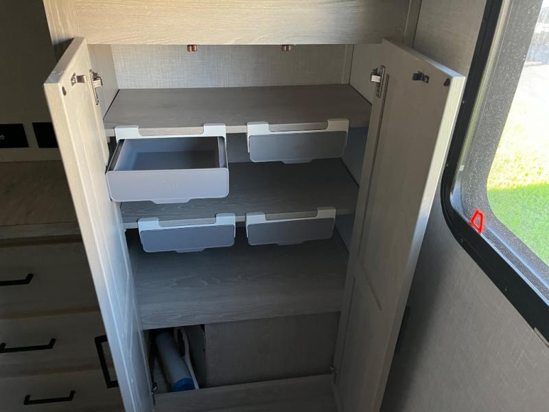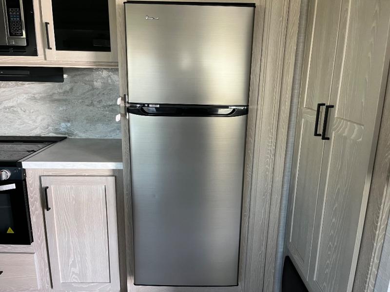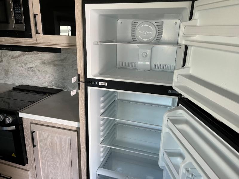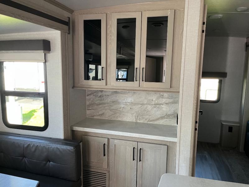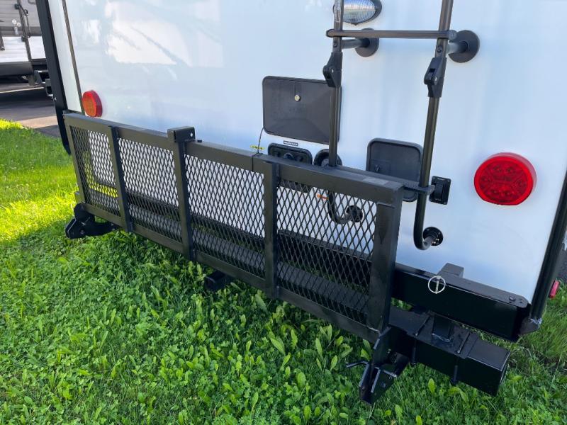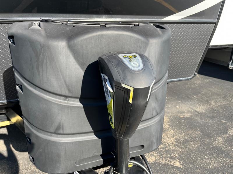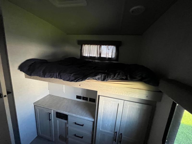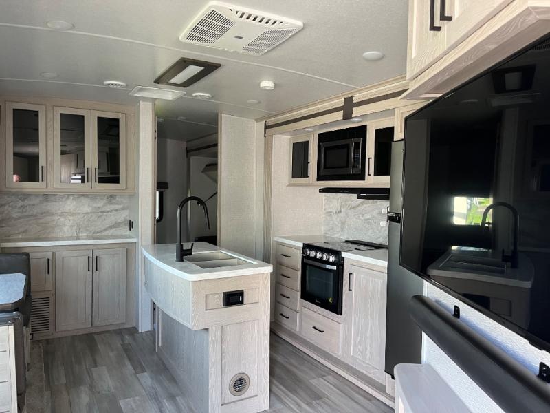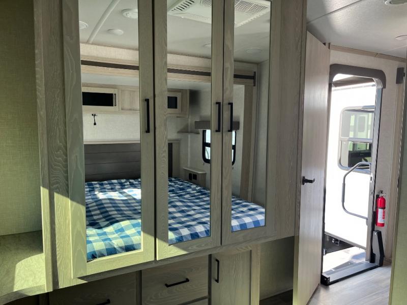 Load up your clothing, food, camping gear and family of eight for a weekend of fun outdoors making memories! After you hike, bike or play around the campsite you can relax under one of the two awnings or head inside to sit on the hide-a-bed sofa and king U-dinette, and both double as extra sleeping space when needed. The spacious kitchen and living area offers dual slides, two pantries, a kitchen island and all the appliances need to keep the gang fed. You will also have the outside kitchen to make several meals. The private bunkhouse will be the kids favorite inside space with two bunks and hide-a-bed sofa option. And you can retire to your own privacy in the front bedroom with a queen bed slide, countertop along the front wall, a space prepped for a washer/dryer option, plus easy access to the double entry bathroom.