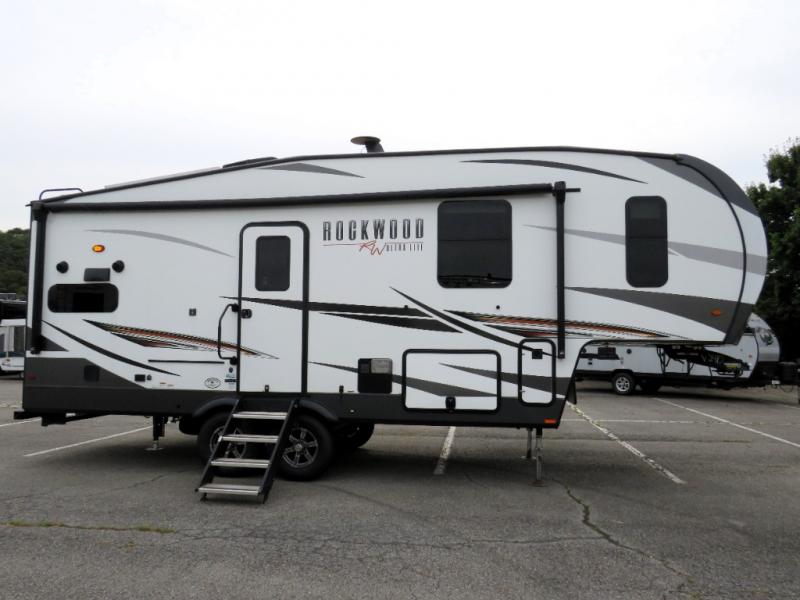 Comfortable, lightweight, fun, and accommodating are just a few of the words that you could use to describe the Forest River Rockwood Ultra Lite fifth wheel and travel trailer! Some of the other words you could use are stylish and dependable. The thermostatically controlled heated holding tanks and enclosed underbelly will keep your unit protected from the cold, and the six-sided aluminum cage construction and surface-coated steel I-beam frame deliver a strong base for everything to be built upon. Radius roofs with interior vaulted ceilings provide an open environment, and the exterior also has an outside shower and speakers for extra convenience.