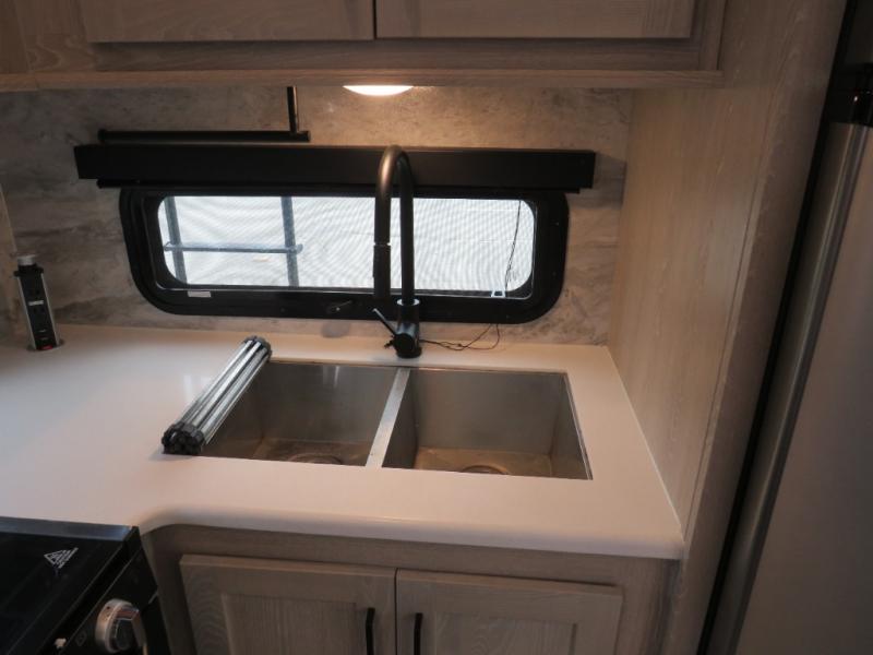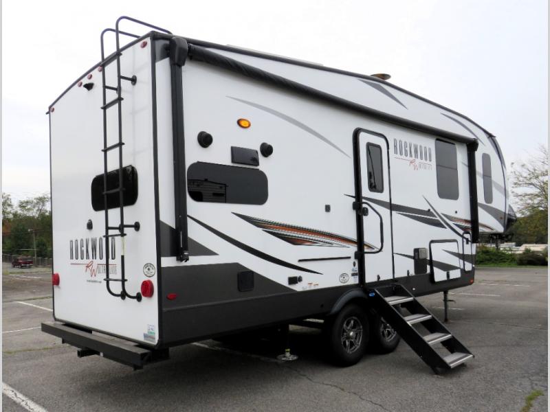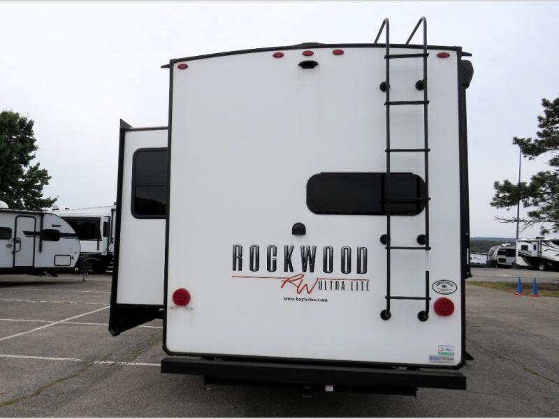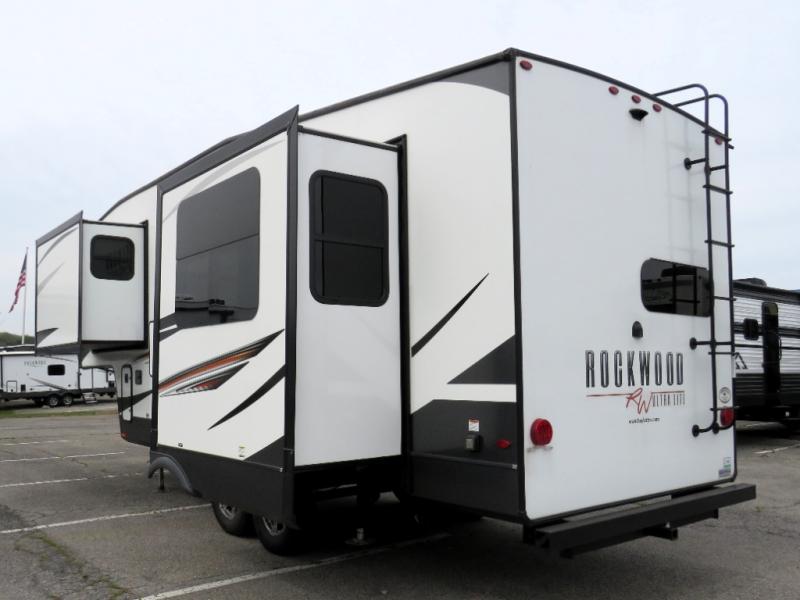 Whether you travel for long periods of time or short weekend getaways, this cozy Rockwood Ultra Lite fifth wheel gives you extra interior floor space thanks to the two slide outs, yet it isn't too big to tow around town. You will have a spacious private bedroom with a queen bed, mirrored wardrobe, storage shelves and a dresser. You might like to add the optional TV to make this area extra accommodating. The bathroom provides everything you need to stay refreshed for shopping in town or getting cleaned up after a hike. You can relax outside under the 20' power awning as you create some s'mores over the open campfire, or you can head inside to use the rear kitchen with full amenities to make some more detailed snacks. And if you have any overnight guests, they can sleep on the hide-a-bed sofa.