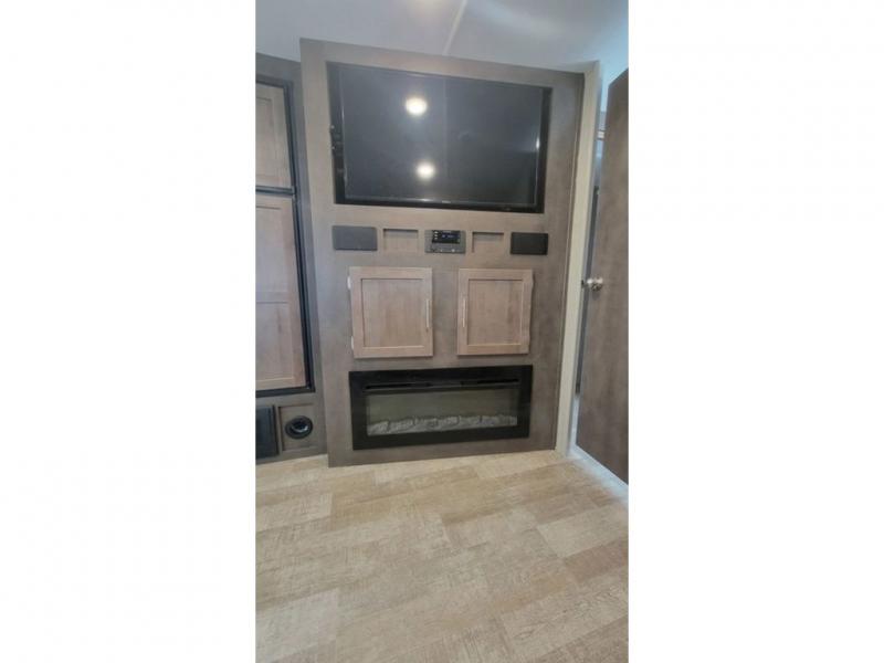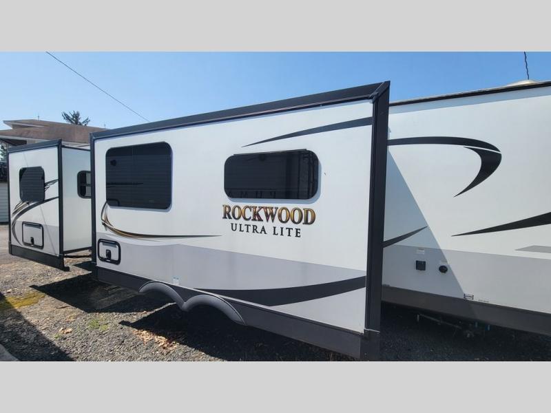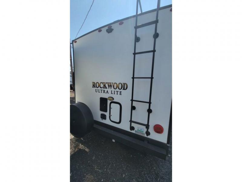 Are you looking for the perfect couple's travel trailer to take on long trips or maybe even adventures that last for months? This Forest River Rockwood Ultra Lite travel trailer offers a unique walk-in closet in the rear full bath, and you and your spouse can cozy up on the 67" hide-a-bed sofa and dine at the booth dinette all while staying warm in front of the fireplace. You will have full kitchen amenities to make meals whenever you like, plus a countertop extension to make it easier to clean the dishes. The front private bedroom consists of a queen-size bed with nightstands on either side, a unique window seating area with wardrobes on either side, and a dresser that has been prepped for an optional TV. There is even an outside kitchen underneath a 21' power awning to keep you protected from the sun's rays!
