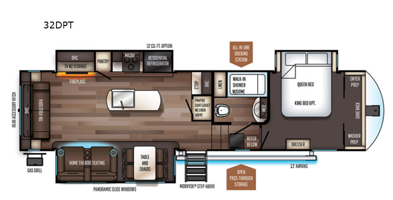 You're going to love camping in this Sabre fifth wheel! The front private bedroom features a queen bed that can be switched out for the optional king bed instead, and the large front closet comes with a shoe rack and an area prepped for you to add the optional washer and dryer to enjoy clean clothes throughout your entire trip! The full bathroom has everything you will need to get squeaky clean each morning, including a walk-in shower with a sky dome and a linen closet to have your towels close by. There is not only one kitchen pantry but two pantries, one of which has an area for your coat and linens to be stored. The exterior also has features you will love to use like the gas grill, the pass-through storage area, and the all-in-one docking station which even features an outdoor shower to eliminate tracking mud inside!