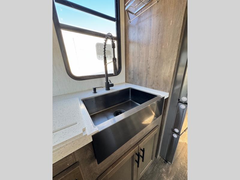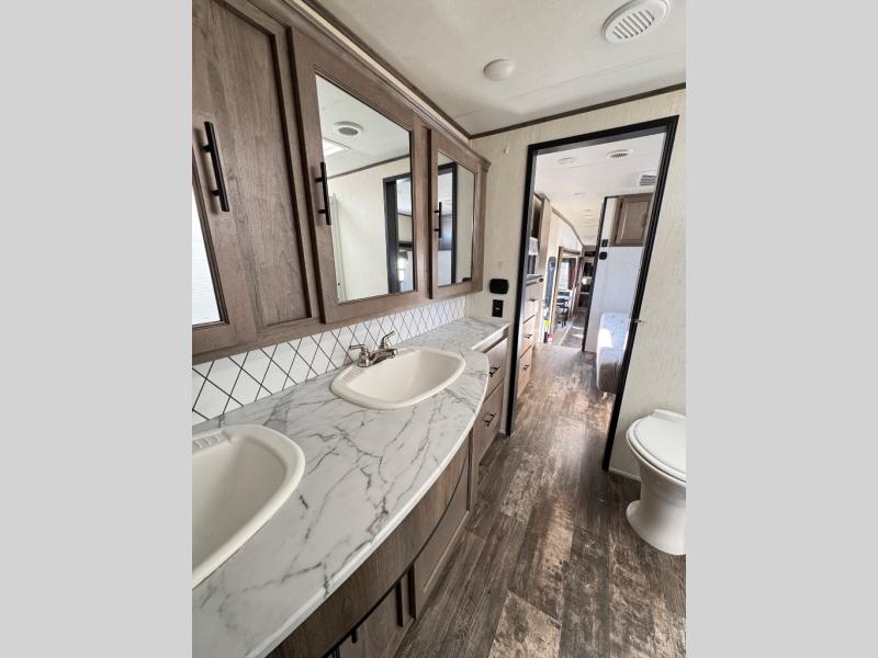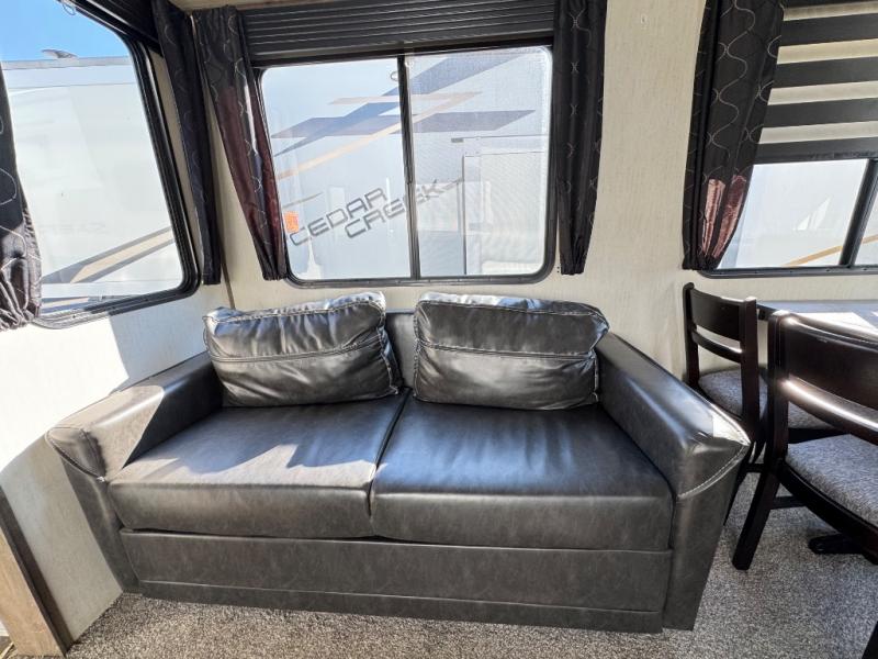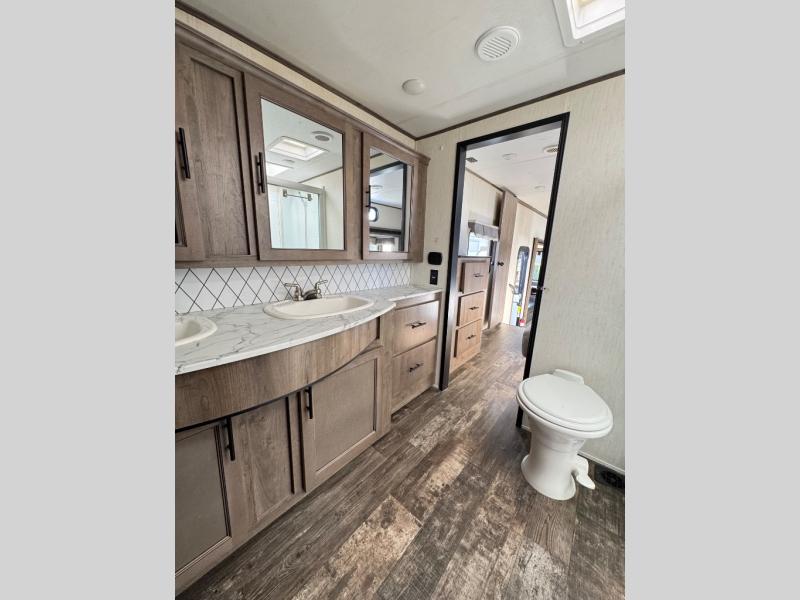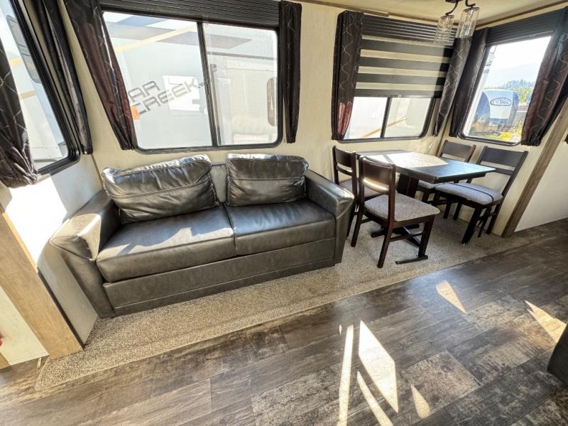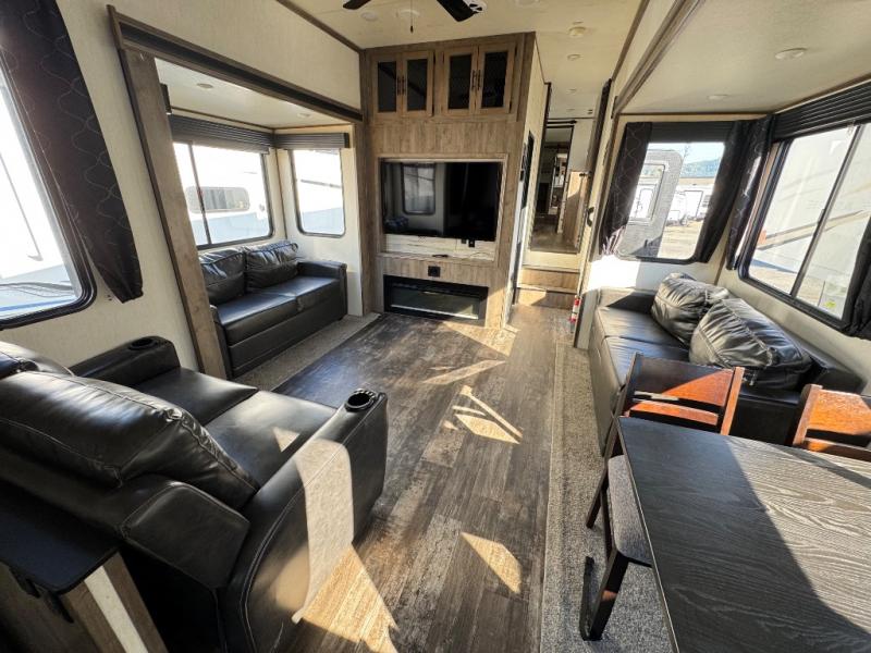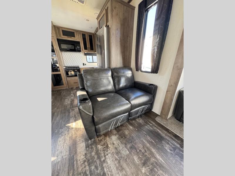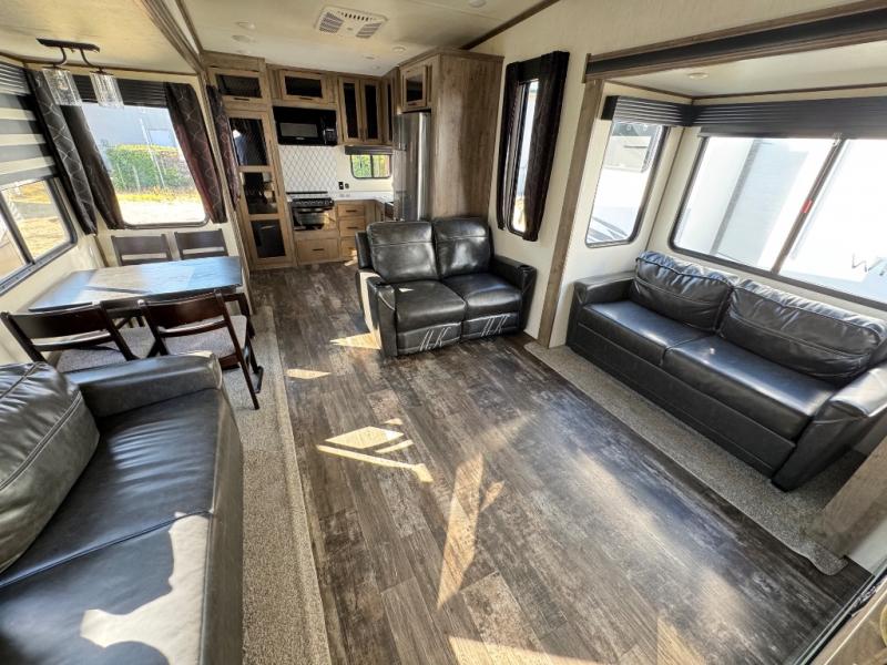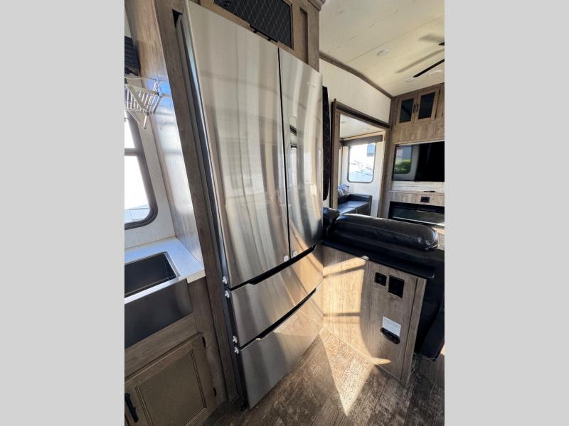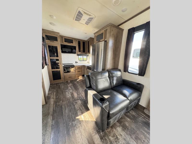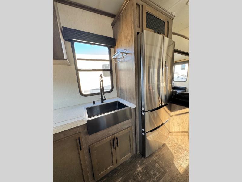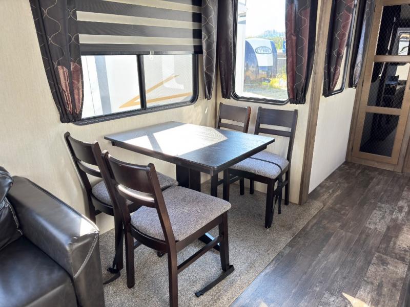 The amenities found in this fifth wheel are exceptional! There is a full bathroom with a dual-sink vanity, a shower, and a full-size wardrobe within the front master suite that will allow you to spend your evenings in complete comfort and convenience. There is an additional half bathroom located right next to the main living area so that your guests also have access to their own facilities while staying the night on the two tri-fold hide-a-bed sofas. You and your spouse can relax on the home theatre seating that is directly across from the residential-size LED TV. And everyone will appreciate finding a residential refrigerator in the rear kitchen late at night when a sugar craving strikes. You can even sit down at the free-standing table with chairs to enjoy that late-night snack.