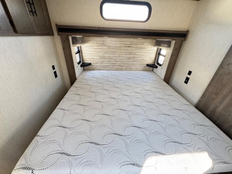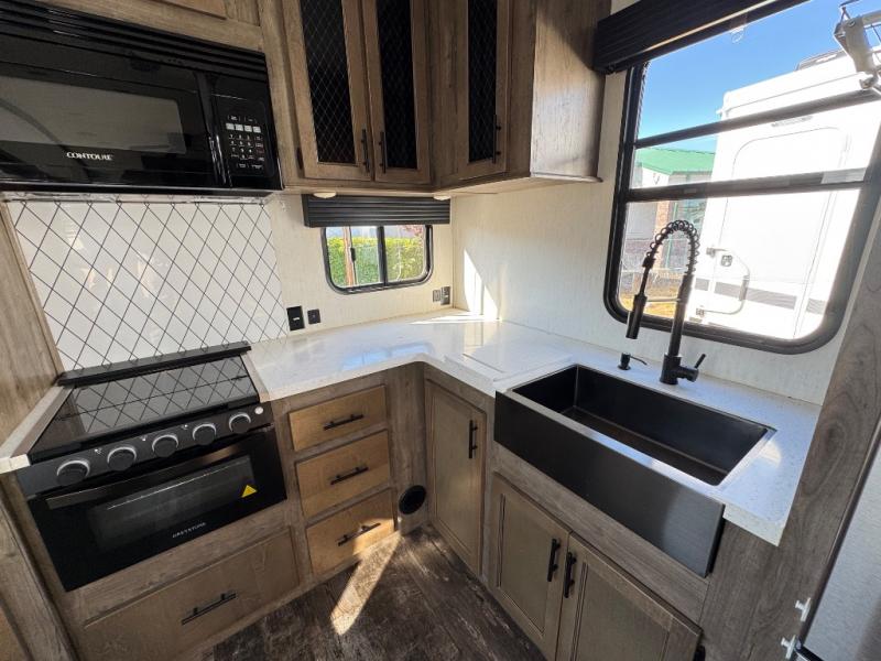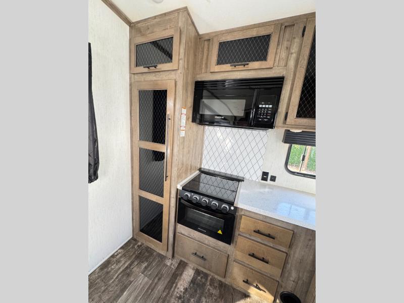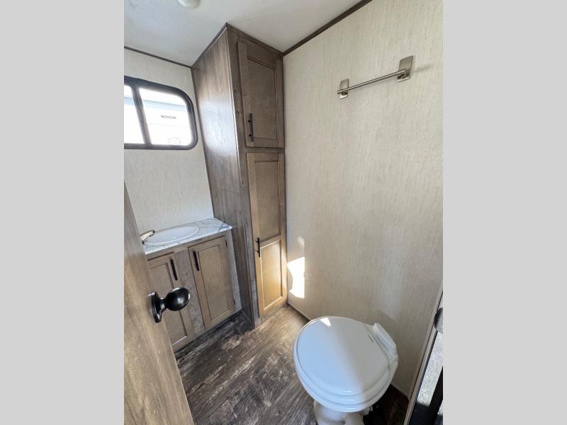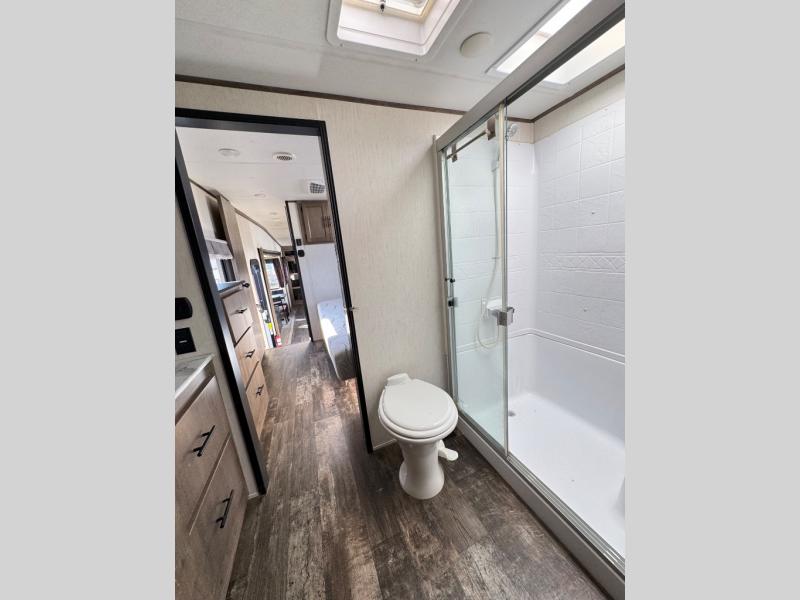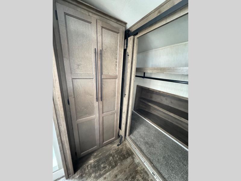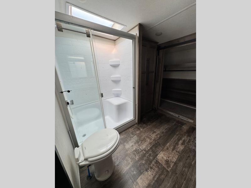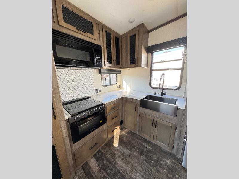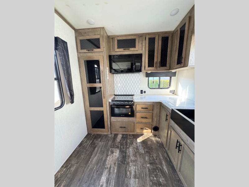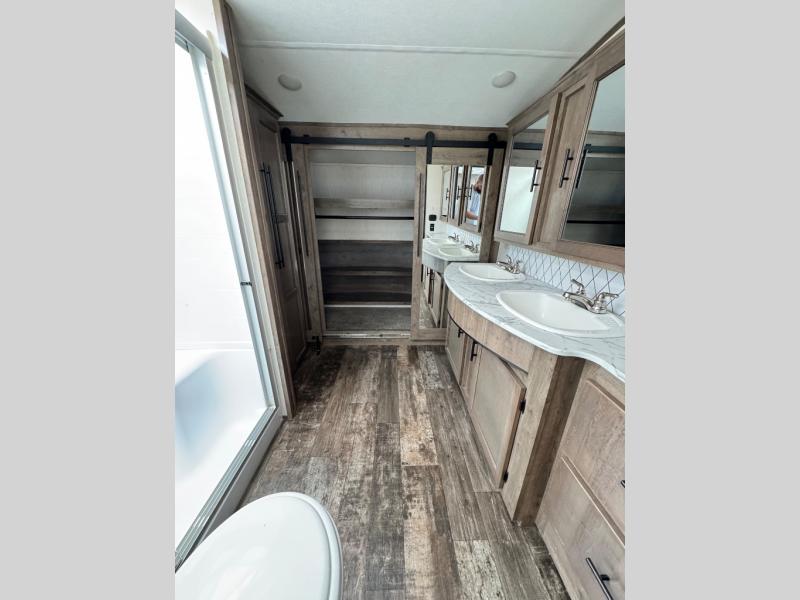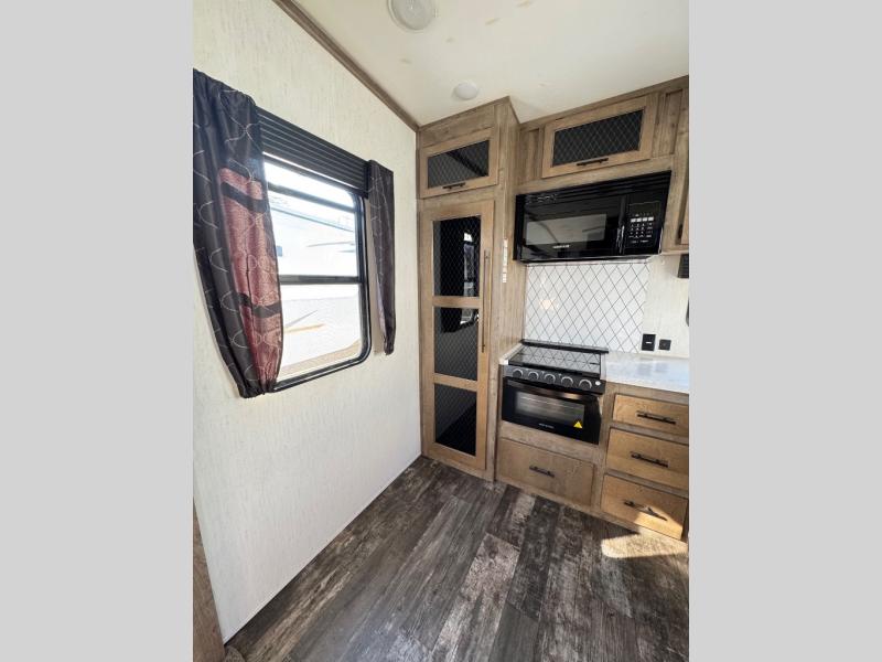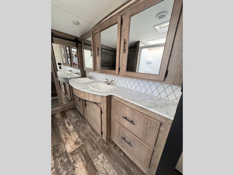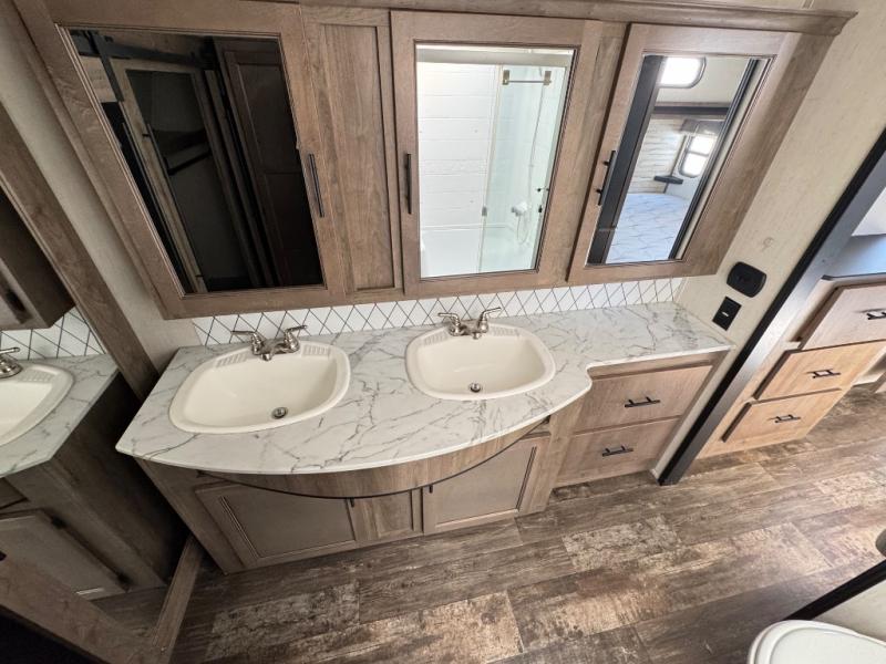 The amenities found in this fifth wheel are exceptional! There is a full bathroom with a dual-sink vanity, a shower, and a full-size wardrobe within the front master suite that will allow you to spend your evenings in complete comfort and convenience. There is an additional half bathroom located right next to the main living area so that your guests also have access to their own facilities while staying the night on the two tri-fold hide-a-bed sofas. You and your spouse can relax on the home theatre seating that is directly across from the residential-size LED TV. And everyone will appreciate finding a residential refrigerator in the rear kitchen late at night when a sugar craving strikes. You can even sit down at the free-standing table with chairs to enjoy that late-night snack.