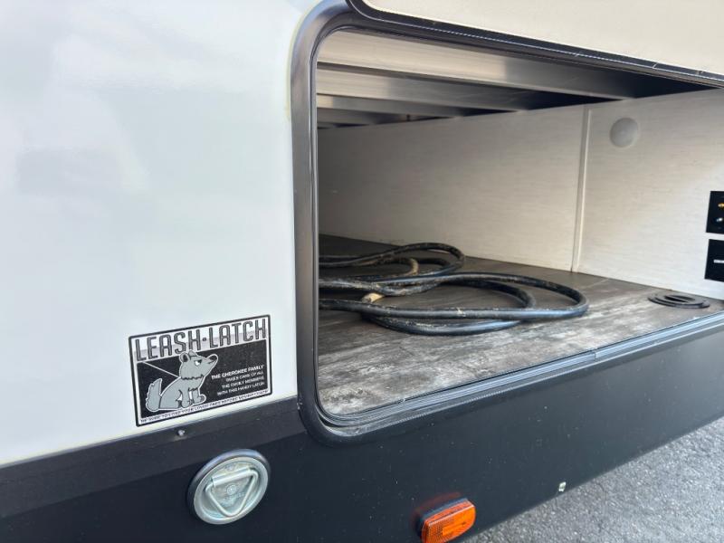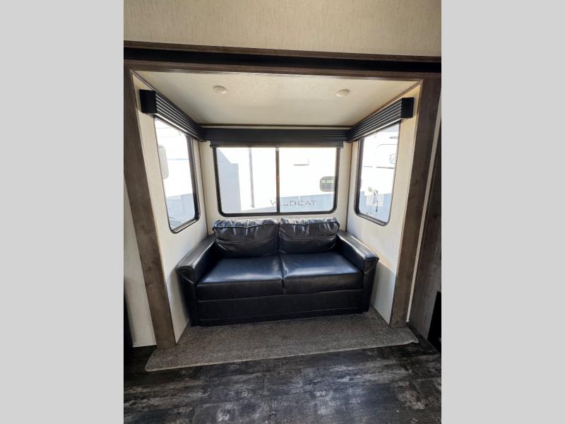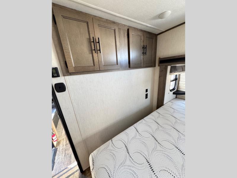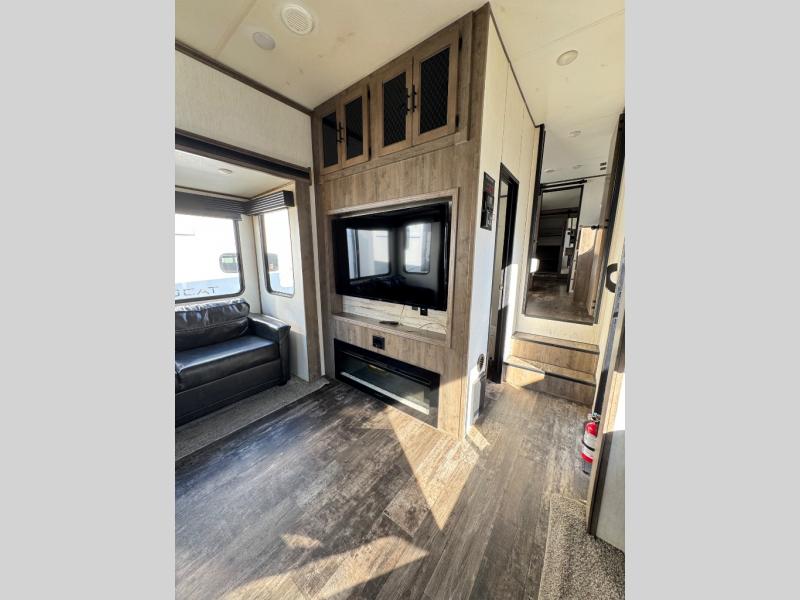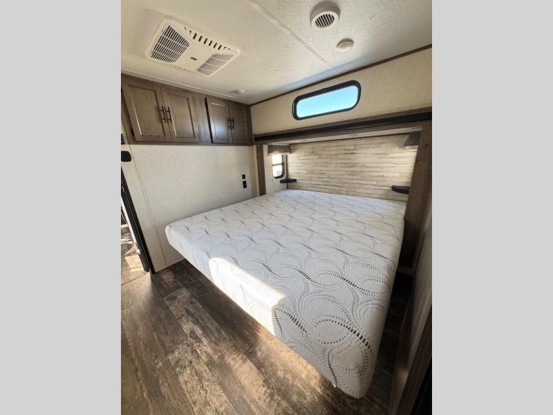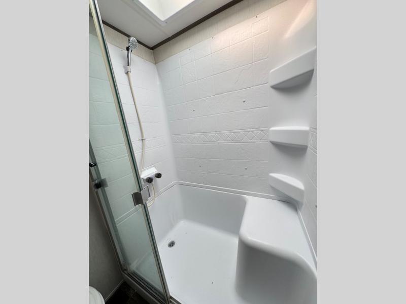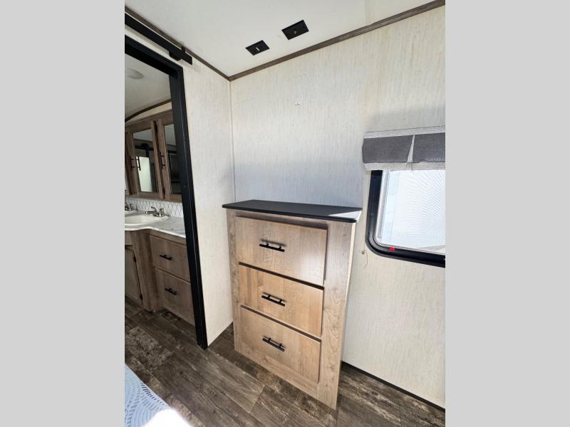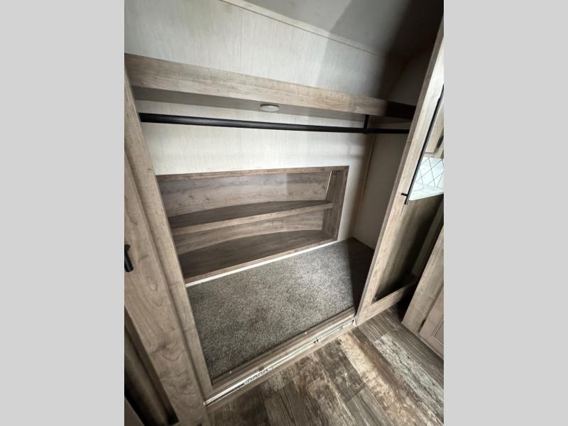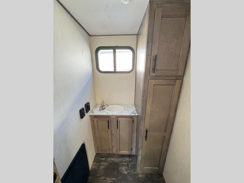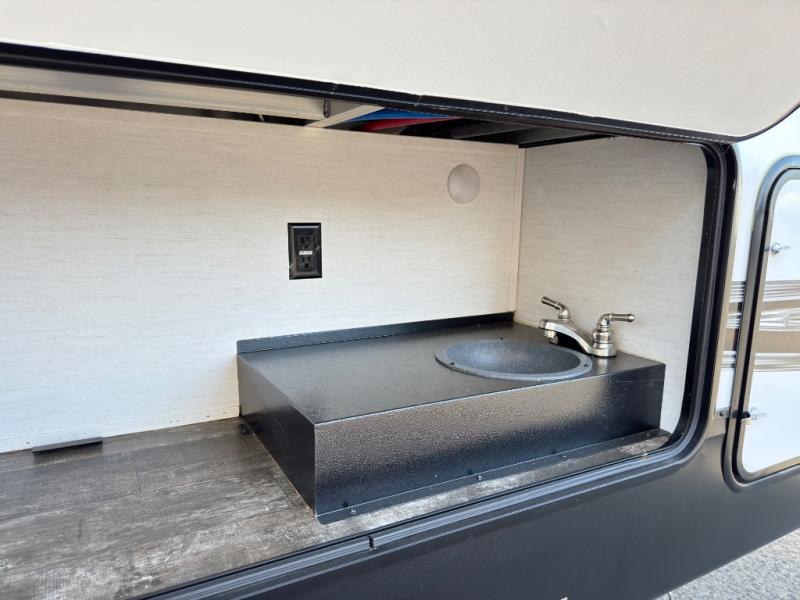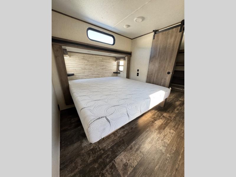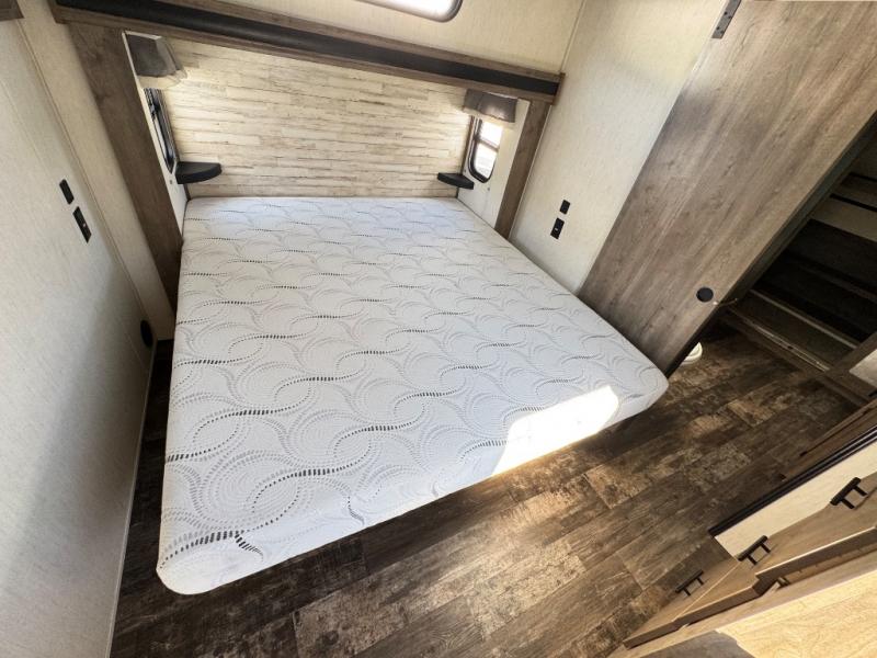 The amenities found in this fifth wheel are exceptional! There is a full bathroom with a dual-sink vanity, a shower, and a full-size wardrobe within the front master suite that will allow you to spend your evenings in complete comfort and convenience. There is an additional half bathroom located right next to the main living area so that your guests also have access to their own facilities while staying the night on the two tri-fold hide-a-bed sofas. You and your spouse can relax on the home theatre seating that is directly across from the residential-size LED TV. And everyone will appreciate finding a residential refrigerator in the rear kitchen late at night when a sugar craving strikes. You can even sit down at the free-standing table with chairs to enjoy that late-night snack.