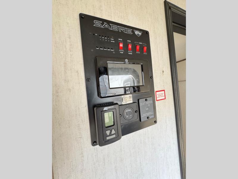 You will experience luxurious camping trips at an affordable price with any one of these Forest River Sabre fifth wheels! These models are durable and ready to travel anytime of the year thanks to features like the high-gloss gel-coat front cap with LED lighting, the reflective white PVC roof membrane, and the forced air underbelly with enclosed gate valves. The electric auto-leveling system makes setting up easy and safe, and the adjustable power awning with LED lighting will create an inviting outdoor living space. Each model includes a universal docking station which includes a black tank flush and an outside shower, and the backlit "Secure Step" landing for you to enter and exit the unit safely. Inside, you will love the design of the ambient accent lighting above the crown molding in the living area, the real wood lumbercore cabinetry, and the vintage gaslight decorative lighting!