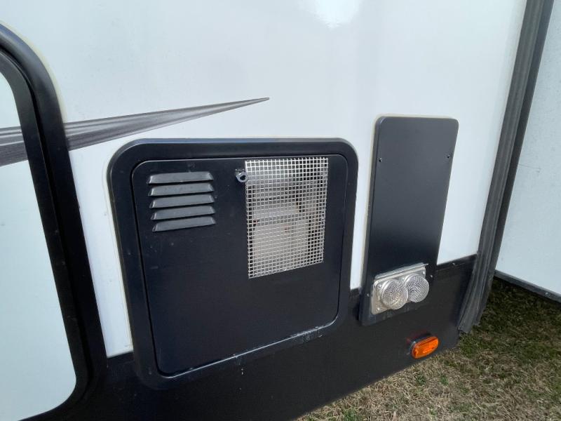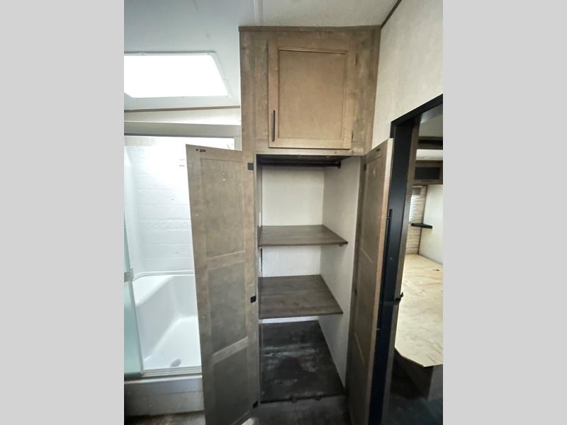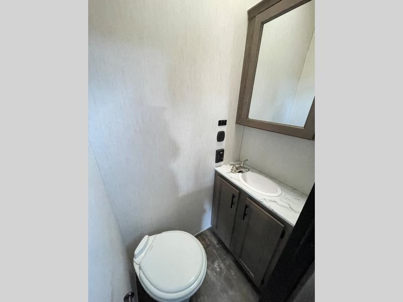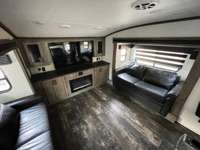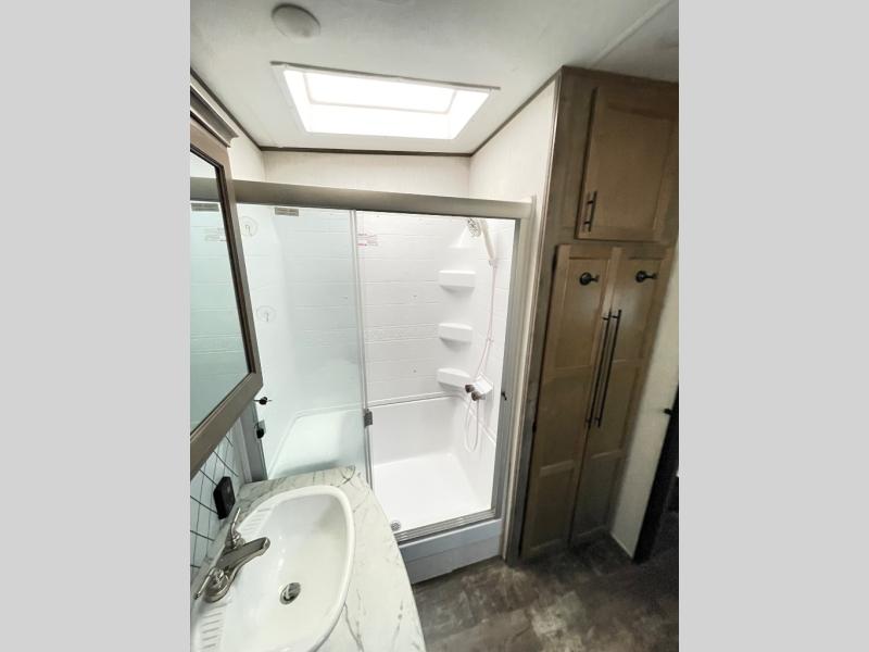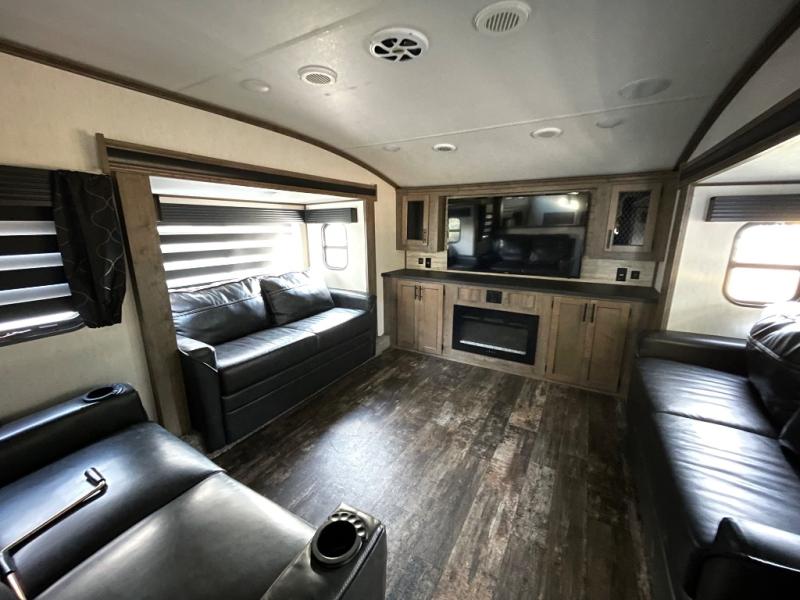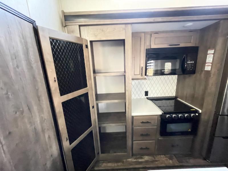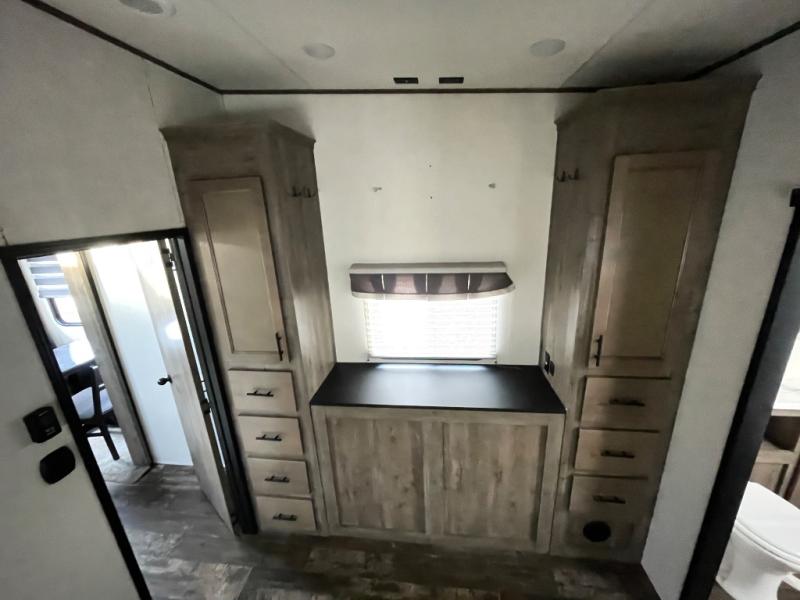 This Sabre fifth wheel with a full and half bath is sure to be a crowd pleaser! The front living area is the perfect place for everyone to visit each other comfortably on the two tri-fold sofas that can be transformed into extra sleeping spaces, or at the theater seating for complete relaxation. You will also find an entertainment center with a fireplace and a residential-size LED TV. This Sabre kitchen is packed out with convenient features, such as a residential refrigerator, a kitchen island, and a lighted pantry with motion sensors. The rear master suite has access to its very own full bathroom with a double-sink vanity for two to get ready at once and a wardrobe that is prepped for the optional washer and dryer to be added so that you can extend your vacation even longer with clean clothes!