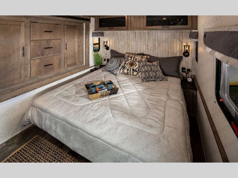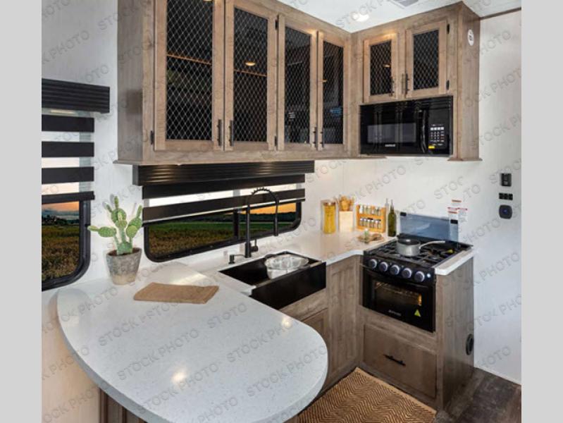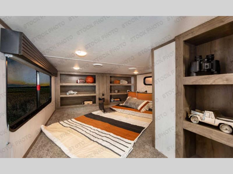 There is only one word that can describe this Sabre fifth wheel: fabulous! You will be amazed by the amount of comfortable convenience that is scattered all throughout this model for you and your family or friends. From the tri-fold sofa slides, the theater seats, the fireplace and entertainment center in the front living room to the rear bedroom with its queen bed and wardrobe slide out, you will always have a place to relax and unwind. Not only that, but there is also a large loft area up above the bedroom and bath which has sleeping space, storage, a wardrobe, and railing. The cook will enjoy the large residential refrigerator and pantry for all of your food storage needs, and the free-standing table with chairs is the perfect place to sit down and enjoy a delicious meal or play board games.