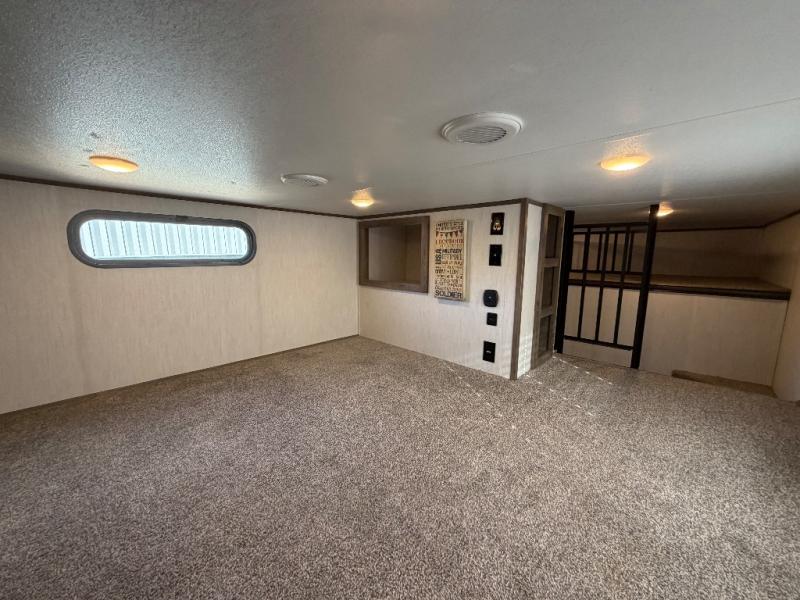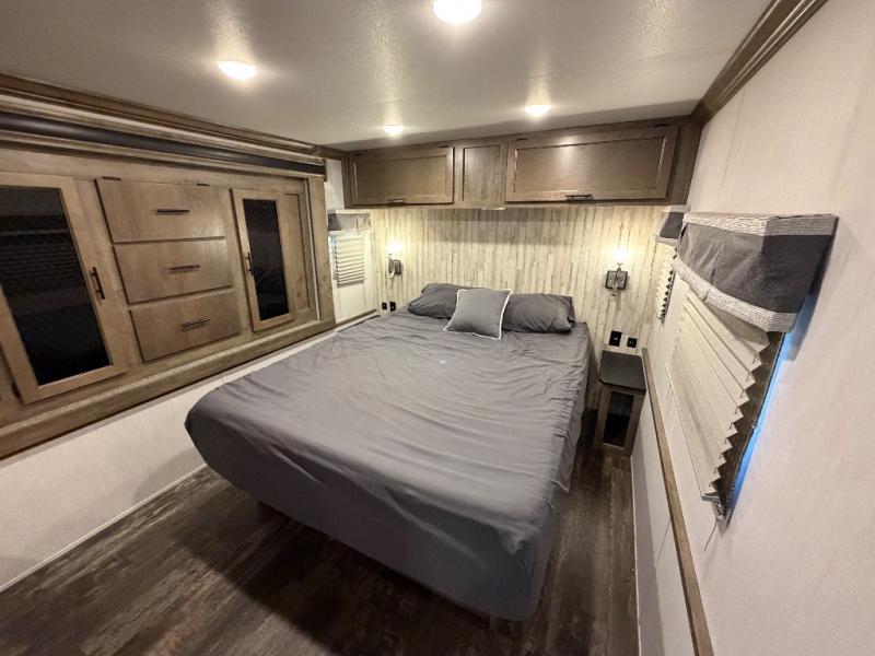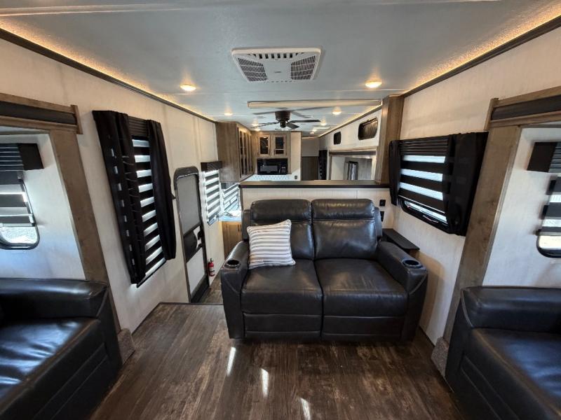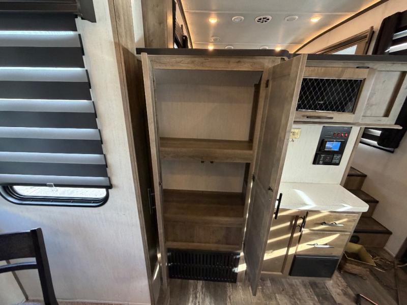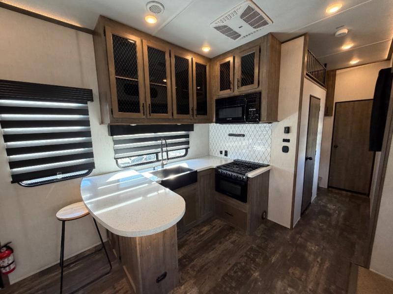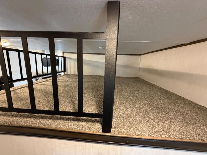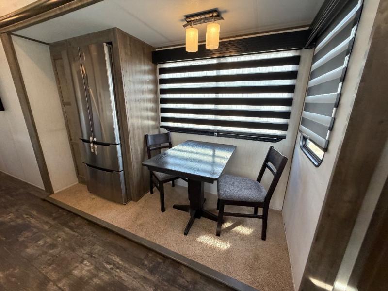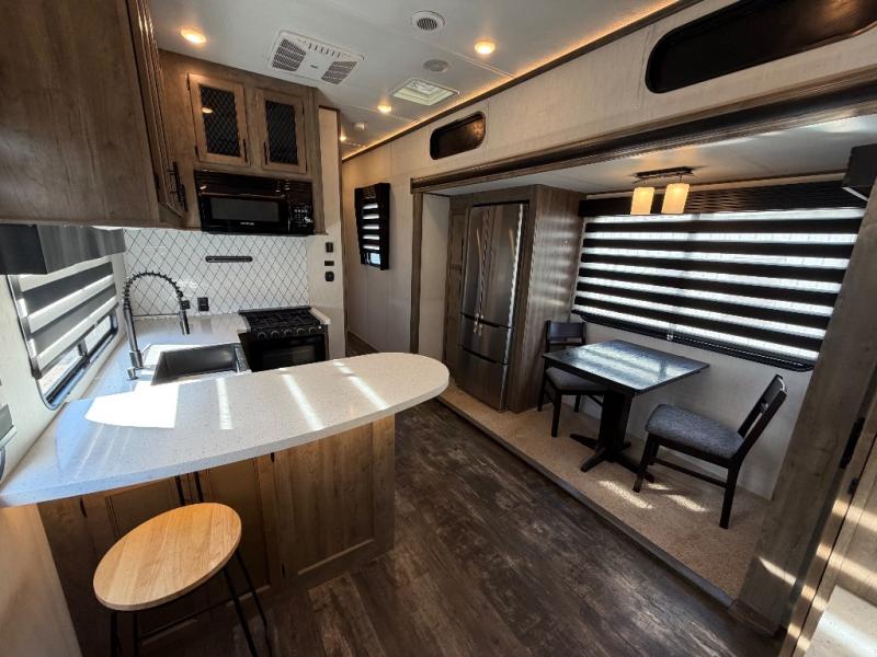 There is only one word that can describe this Sabre fifth wheel: fabulous! You will be amazed by the amount of comfortable convenience that is scattered all throughout this model for you and your family or friends. From the tri-fold sofa slides, the theater seats, the fireplace and entertainment center in the front living room to the rear bedroom with its queen bed and wardrobe slide out, you will always have a place to relax and unwind. Not only that, but there is also a large loft area up above the bedroom and bath which has sleeping space, storage, a wardrobe, and railing. The cook will enjoy the large residential refrigerator and pantry for all of your food storage needs, and the free-standing table with chairs is the perfect place to sit down and enjoy a delicious meal or play board games.