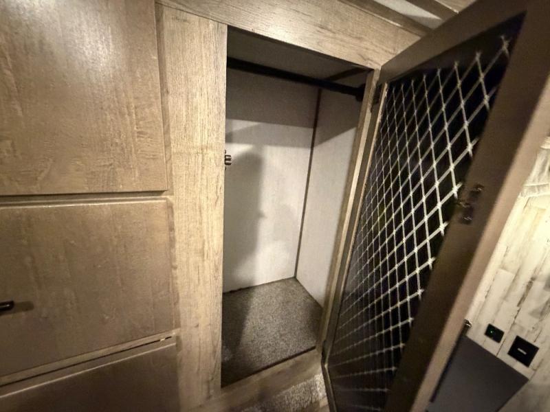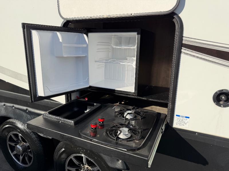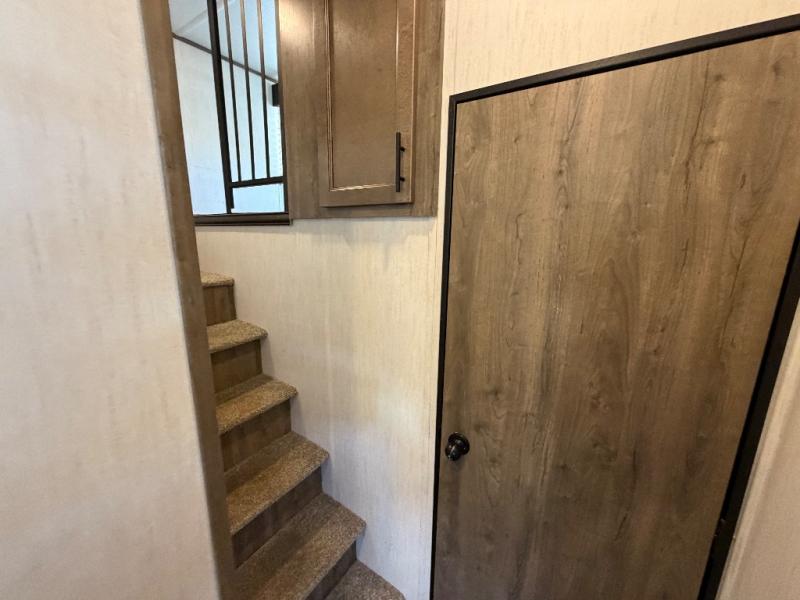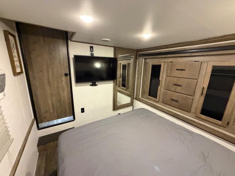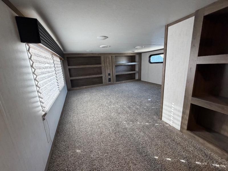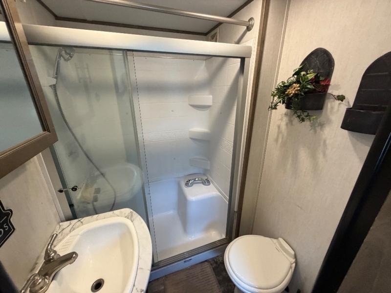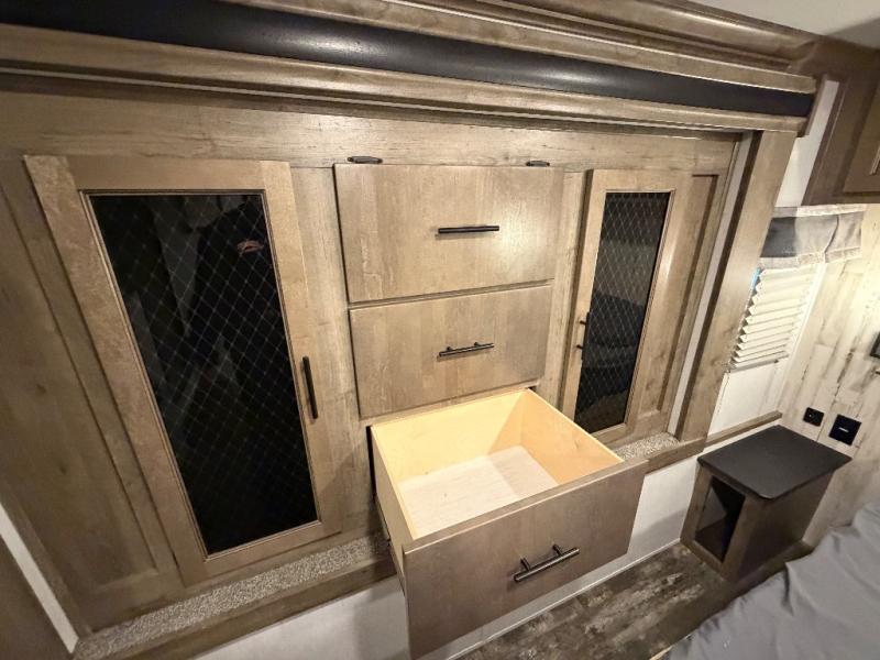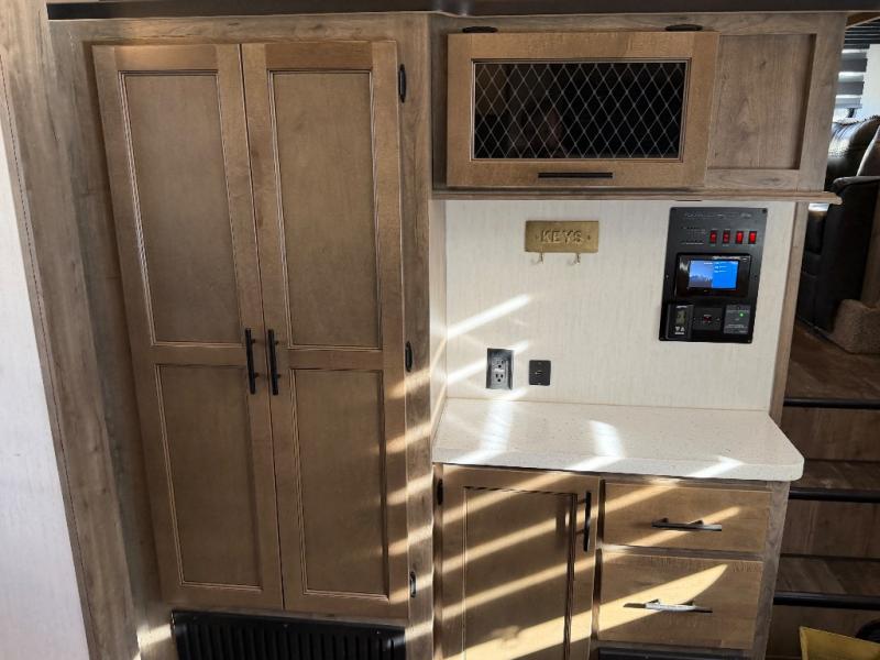 There is only one word that can describe this Sabre fifth wheel: fabulous! You will be amazed by the amount of comfortable convenience that is scattered all throughout this model for you and your family or friends. From the tri-fold sofa slides, the theater seats, the fireplace and entertainment center in the front living room to the rear bedroom with its queen bed and wardrobe slide out, you will always have a place to relax and unwind. Not only that, but there is also a large loft area up above the bedroom and bath which has sleeping space, storage, a wardrobe, and railing. The cook will enjoy the large residential refrigerator and pantry for all of your food storage needs, and the free-standing table with chairs is the perfect place to sit down and enjoy a delicious meal or play board games.