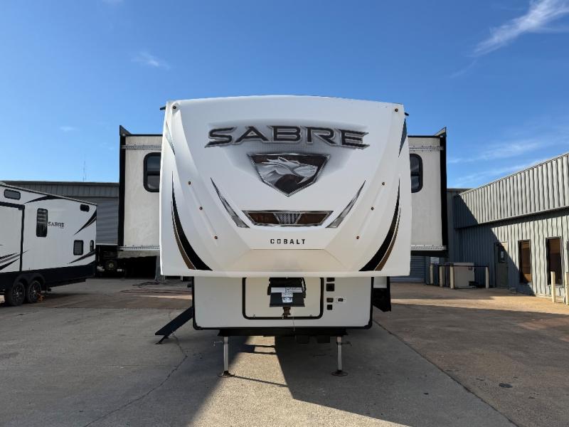 You will experience luxurious camping trips at an affordable price with any one of these Forest River Sabre fifth wheels! These models are durable and ready to travel anytime of the year thanks to features like the high-gloss gel-coat front cap with LED lighting, the reflective white PVC roof membrane, and the forced air underbelly with enclosed gate valves. The electric auto-leveling system makes setting up easy and safe, and the adjustable power awning with LED lighting will create an inviting outdoor living space. Each model includes a universal docking station which includes a black tank flush and an outside shower, and the backlit "Secure Step" landing for you to enter and exit the unit safely. Inside, you will love the design of the ambient accent lighting above the crown molding in the living area, the real wood lumbercore cabinetry, and the vintage gaslight decorative lighting!