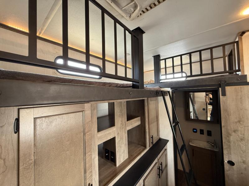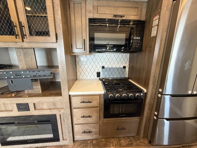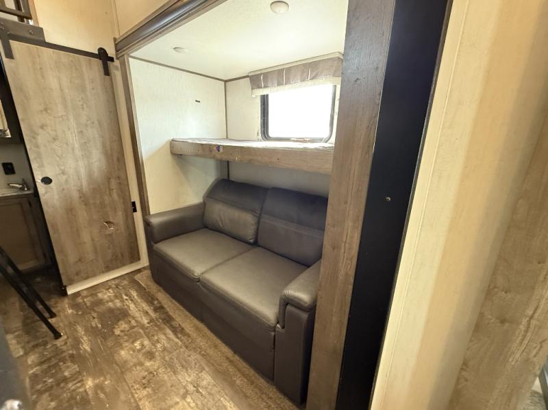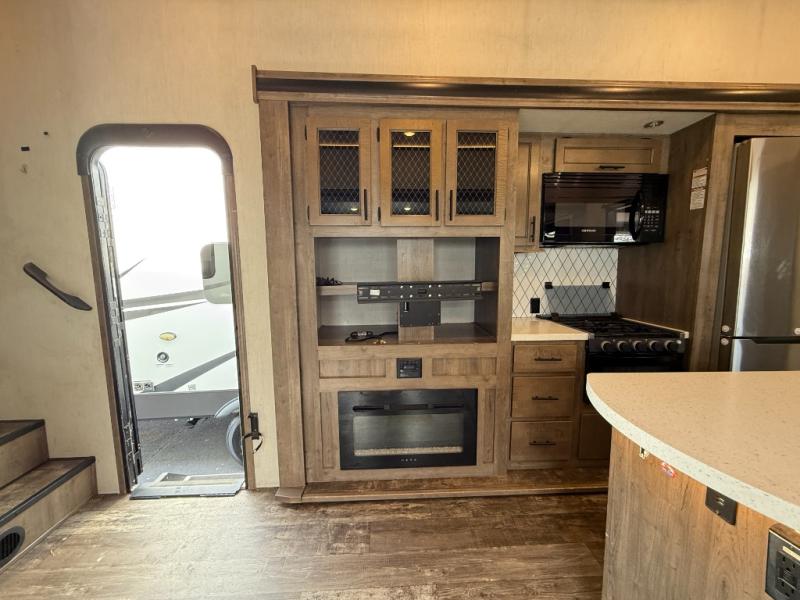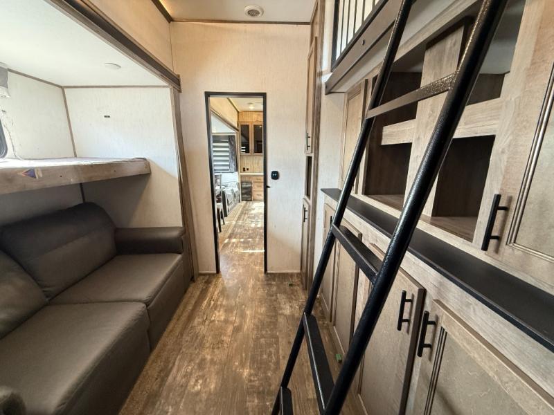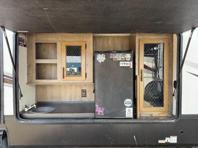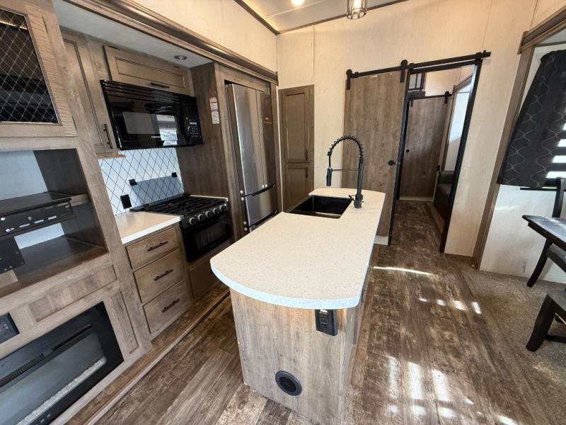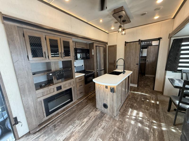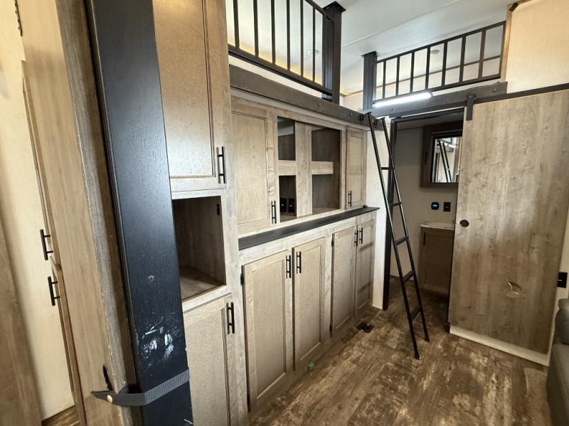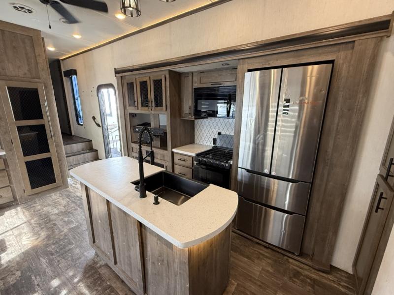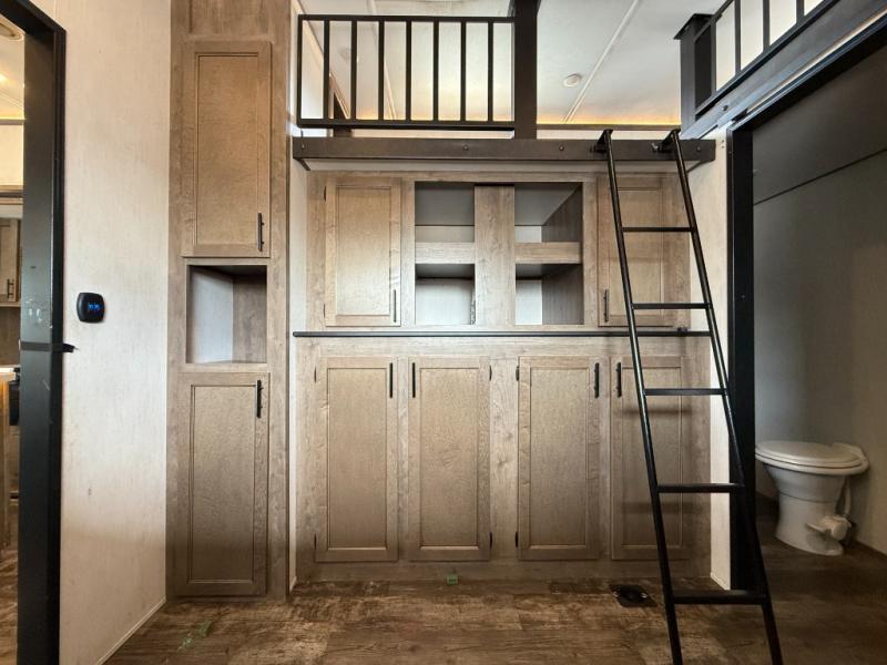 With two full bathrooms in this Sabre fifth wheel, everyone can stay squeaky clean, and with the front private bedroom featuring an area for you to add the optional washer and dryer, your clothes can stay clean as well! Your kids or friends will love having their own private bedroom with a bunk above a jackknife sofa, an entertainment center with storage, and access to their very own full rear bathroom which even has an exterior entry door. There are plenty of sleeping areas for the whole gang to tag along too thanks to the loft area with two bunks. The chef of your group will love having the extra counter and storage space with the kitchen island, and if they want to enjoy some fresh air while they cook, then they can head to the outdoor kitchen.