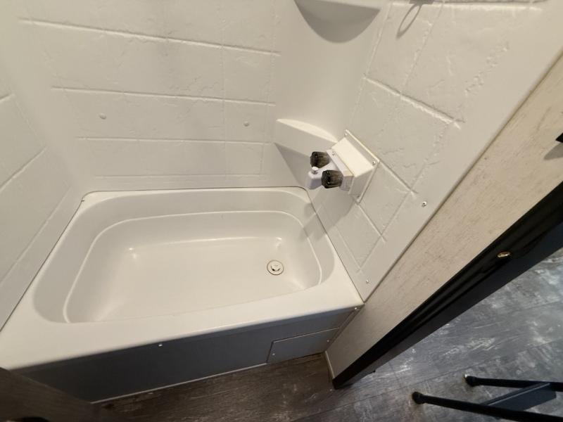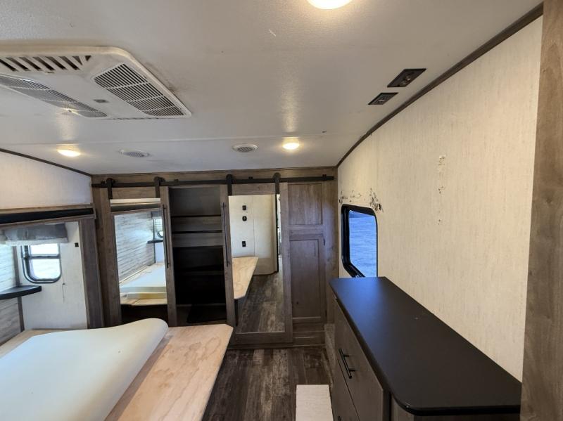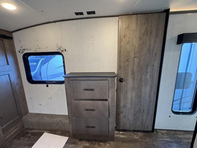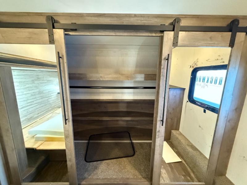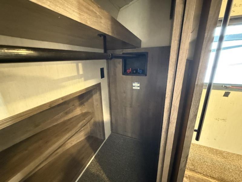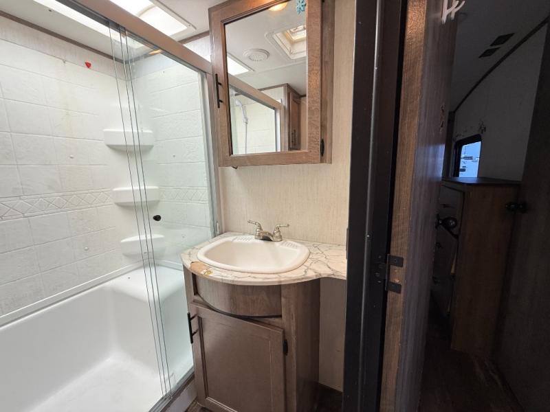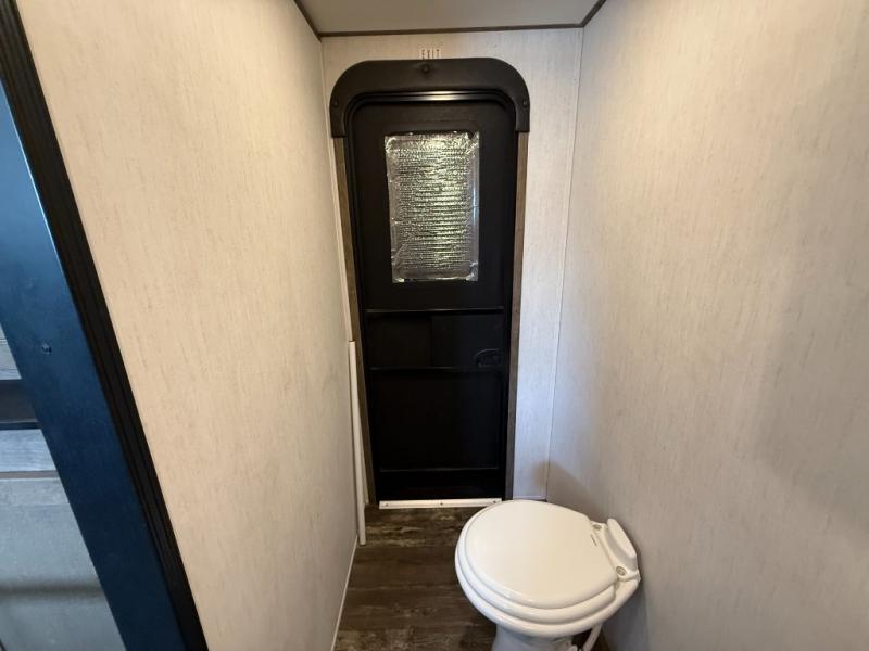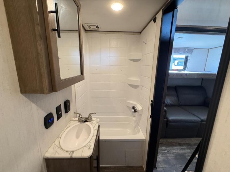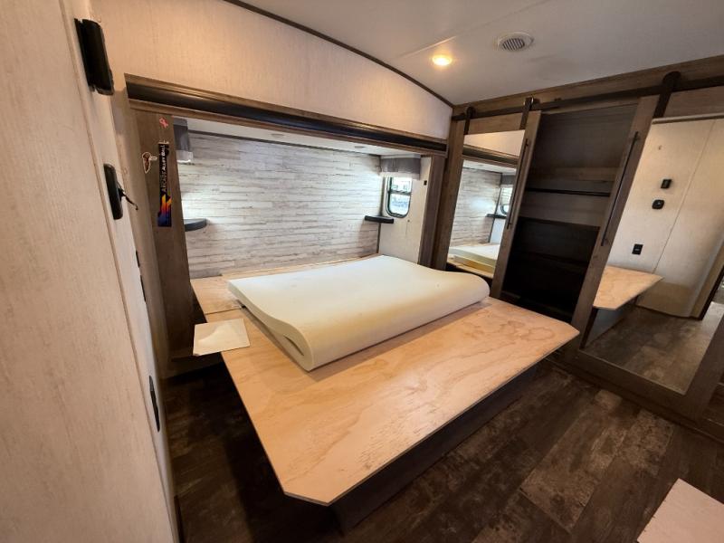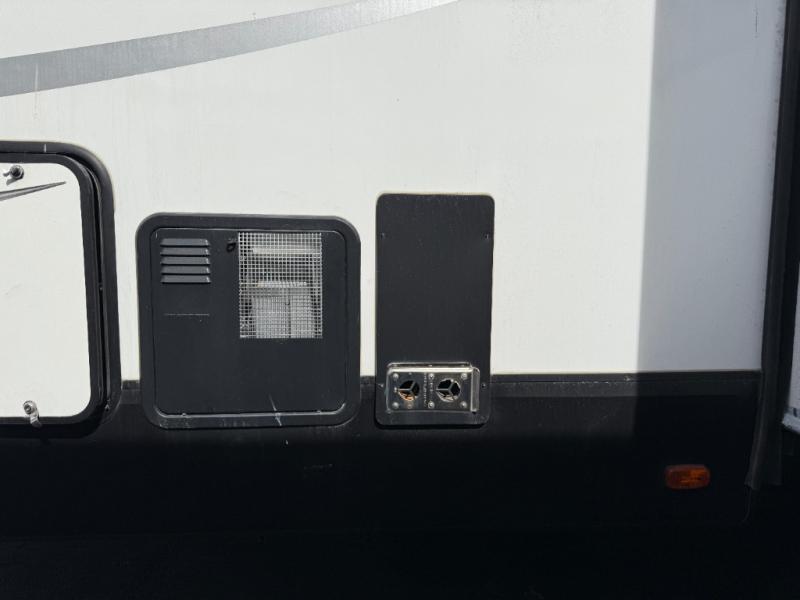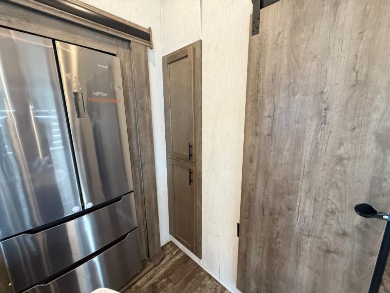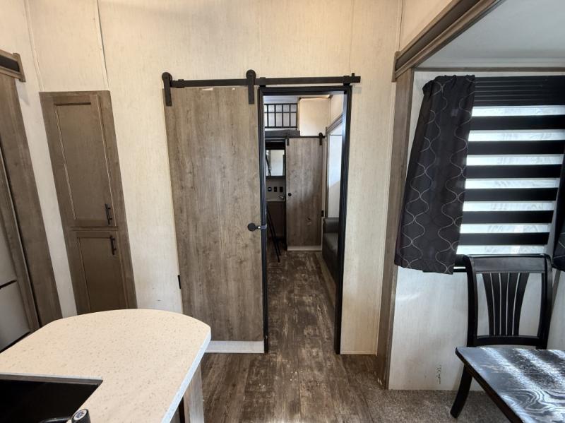 With two full bathrooms in this Sabre fifth wheel, everyone can stay squeaky clean, and with the front private bedroom featuring an area for you to add the optional washer and dryer, your clothes can stay clean as well! Your kids or friends will love having their own private bedroom with a bunk above a jackknife sofa, an entertainment center with storage, and access to their very own full rear bathroom which even has an exterior entry door. There are plenty of sleeping areas for the whole gang to tag along too thanks to the loft area with two bunks. The chef of your group will love having the extra counter and storage space with the kitchen island, and if they want to enjoy some fresh air while they cook, then they can head to the outdoor kitchen.