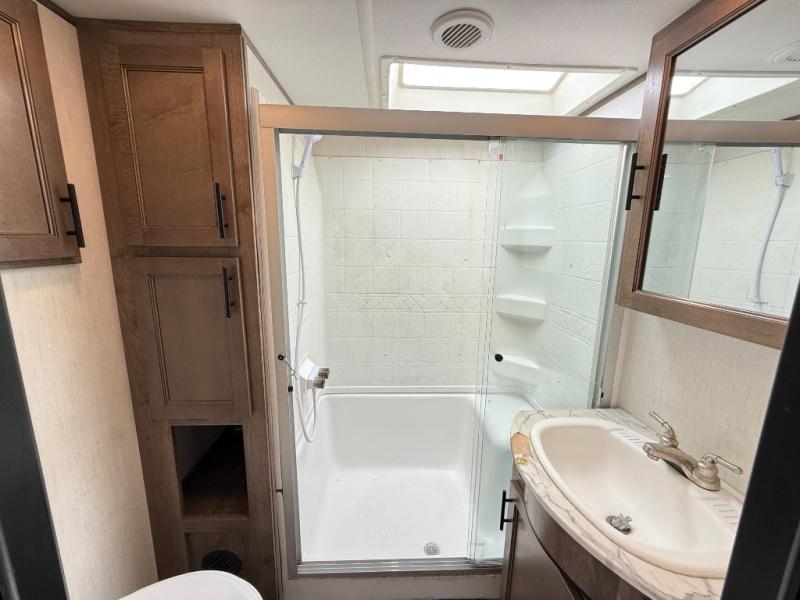 You will experience luxurious camping trips at an affordable price with any one of these Forest River Sabre fifth wheels! These models are durable and ready to travel anytime of the year thanks to features like the high-gloss gel-coat front cap with LED lighting, the reflective white PVC roof membrane, and the forced air underbelly with enclosed gate valves. The electric auto-leveling system makes setting up easy and safe, and the adjustable power awning with LED lighting will create an inviting outdoor living space. Each model includes a universal docking station which includes a black tank flush and an outside shower, and the backlit "Secure Step" landing for you to enter and exit the unit safely. Inside, you will love the design of the ambient accent lighting above the crown molding in the living area, the real wood lumbercore cabinetry, and the vintage gaslight decorative lighting!