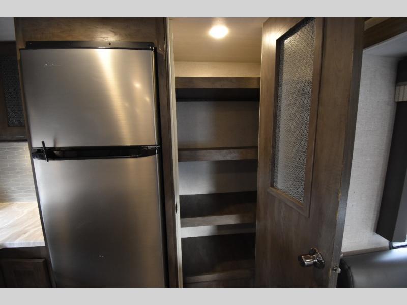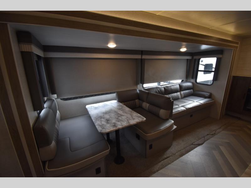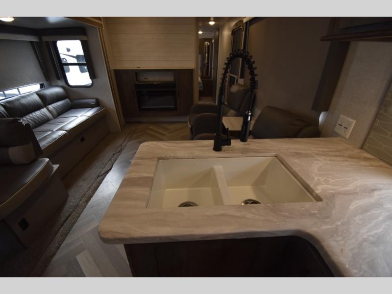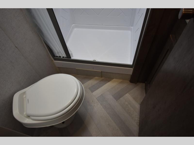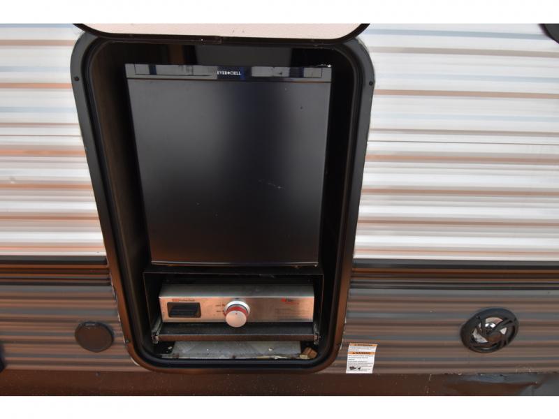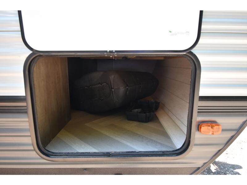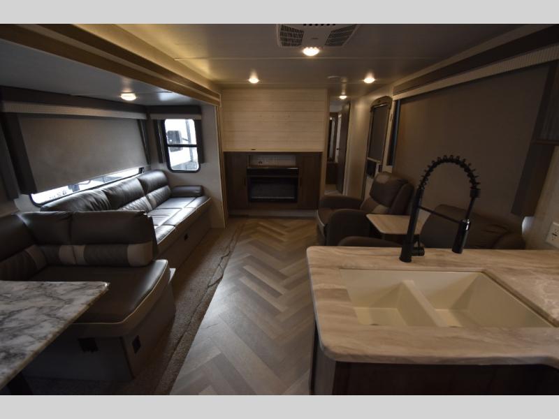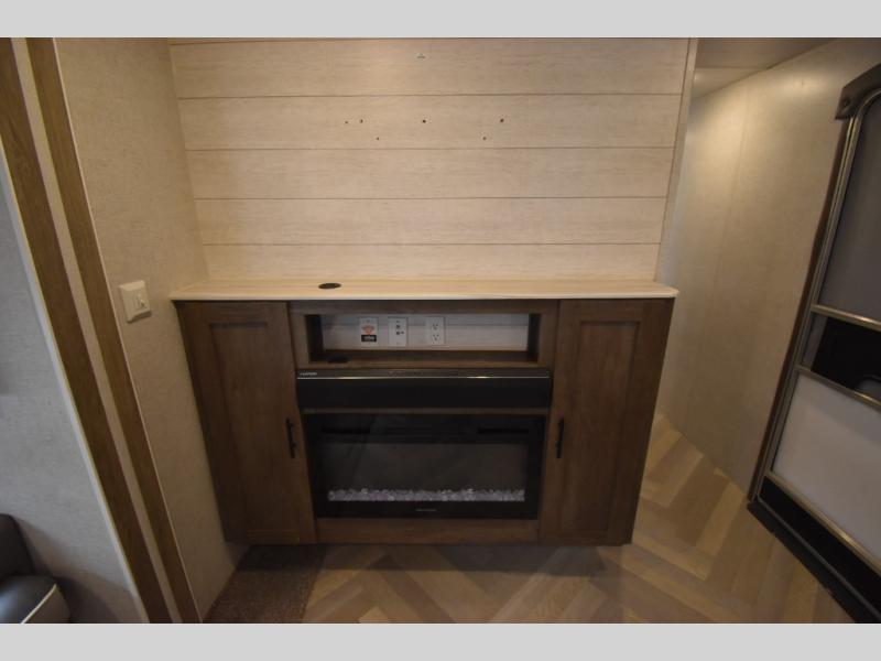 With a spacious kitchen and panoramic windows, this travel trailer is sure to stand out! The Versa Lounge is customizable for you to reconfigure for your needs and it also has Stow N Go storage for extra blankets. Your nights will be spent in true comfort by playing games at the booth dinette or relaxing in one of the two chairs by the fireplace. You can either cook a delicious meal in the rear kitchen or you can add the optional exterior camp kitchen to breathe in some fresh air while you cook. After a fun-filled day, you can rinse off in the walk-in shower then head to the front private bedroom, grab your pajamas from the walk-in closet, and lay down on the Evergreen mattress for a good night's rest!