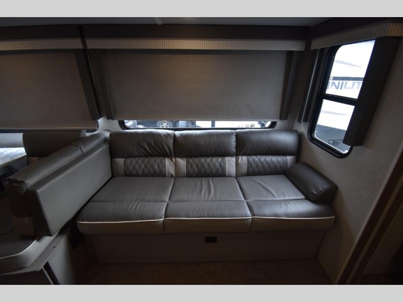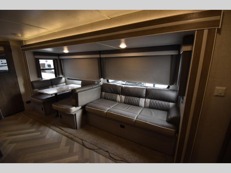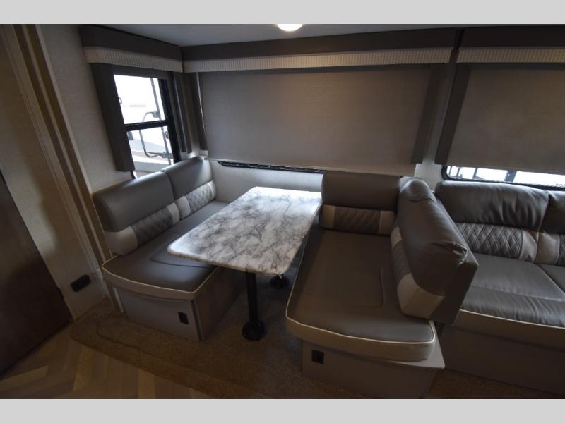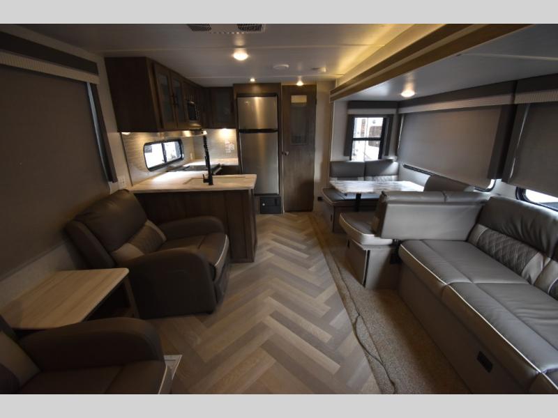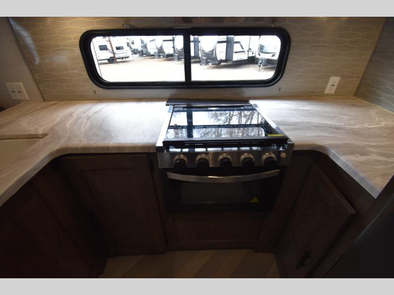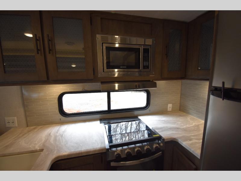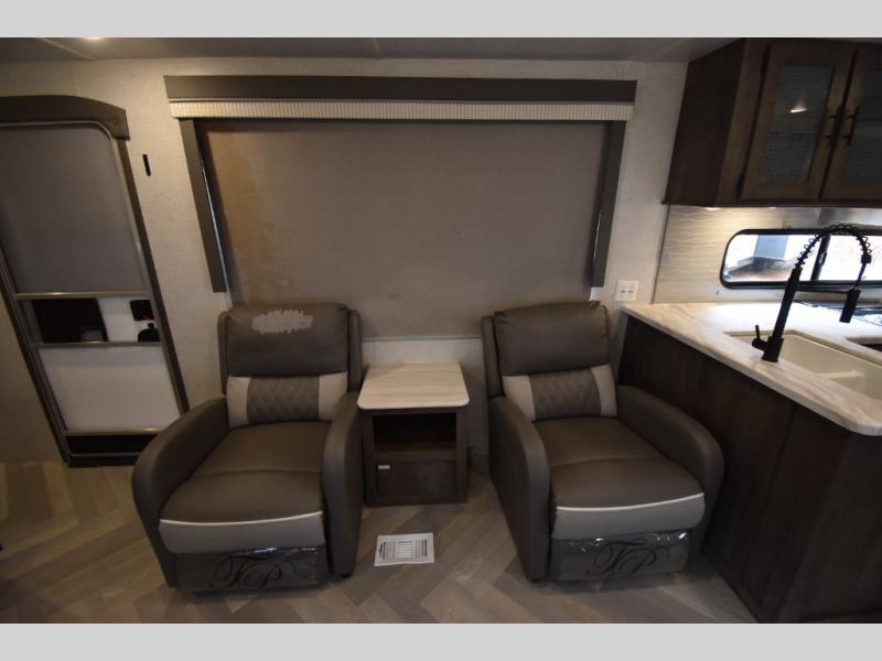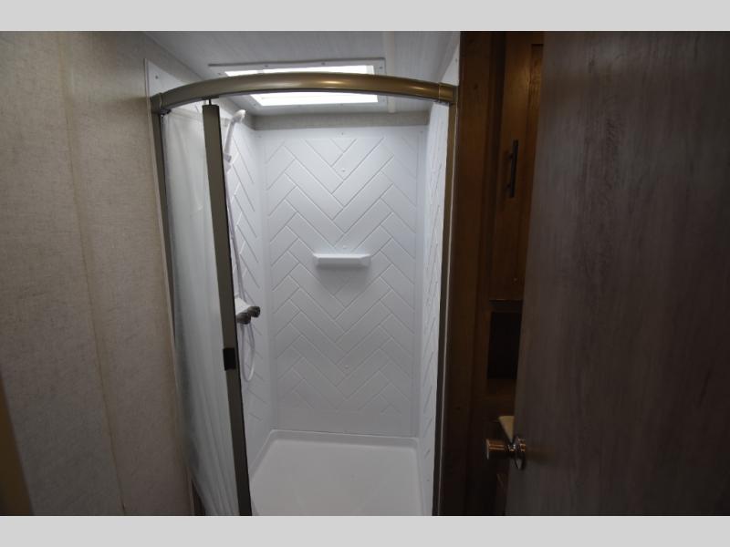 With a spacious kitchen and panoramic windows, this travel trailer is sure to stand out! The Versa Lounge is customizable for you to reconfigure for your needs and it also has Stow N Go storage for extra blankets. Your nights will be spent in true comfort by playing games at the booth dinette or relaxing in one of the two chairs by the fireplace. You can either cook a delicious meal in the rear kitchen or you can add the optional exterior camp kitchen to breathe in some fresh air while you cook. After a fun-filled day, you can rinse off in the walk-in shower then head to the front private bedroom, grab your pajamas from the walk-in closet, and lay down on the Evergreen mattress for a good night's rest!