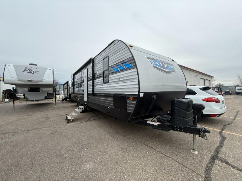 The Forest River Salem travel trailers come in a variety of layouts and designs because families come in a variety of shapes and sizes! Each model has been customized with the very best features so that you and your family always feel cared for when you travel! You will find an extra-large pass-through storage so that you can bring along all of your favorite outdoor gear, and the high-efficiency 15,000 BTU ducted air conditioner will keep you fresh and comfortable while the heat blazes outside. The two outside speakers will provide a fun atmosphere for you and your friends, and the bedside USB chargers will be so handy to have because it will allow you to keep your electronics charged throughout your entire trip.