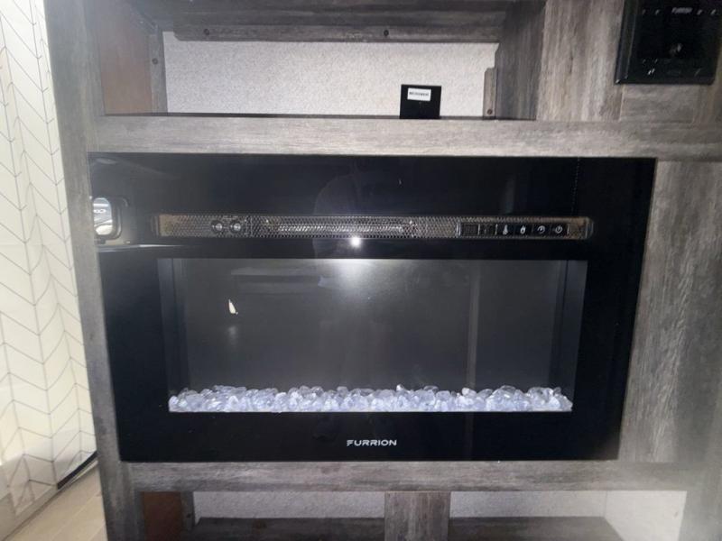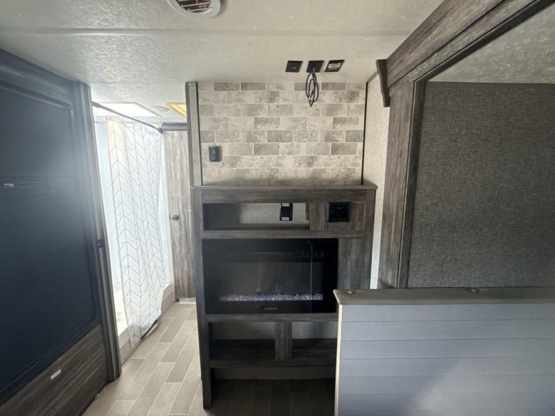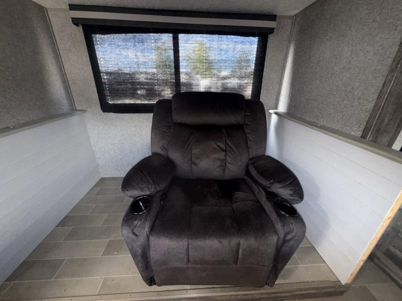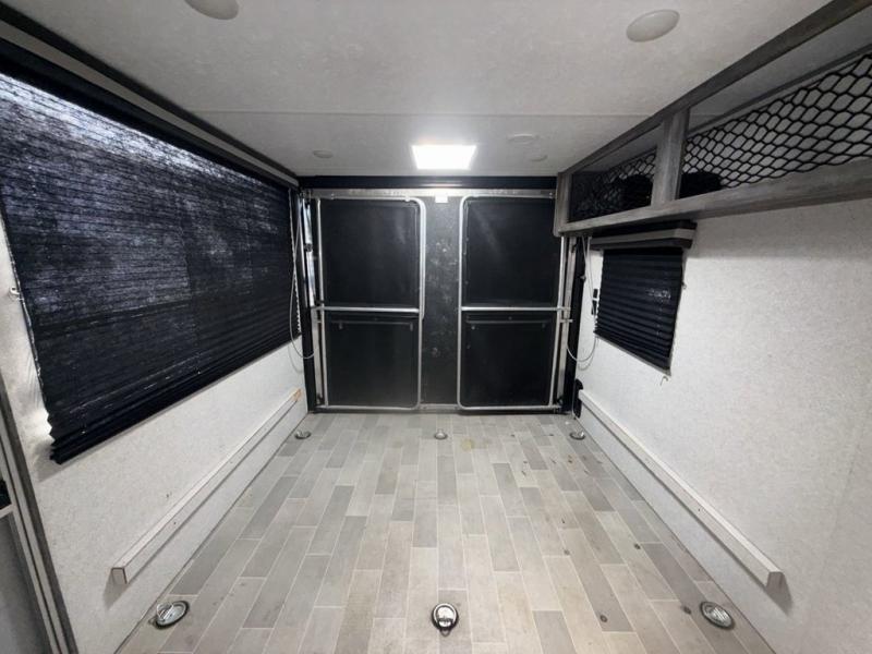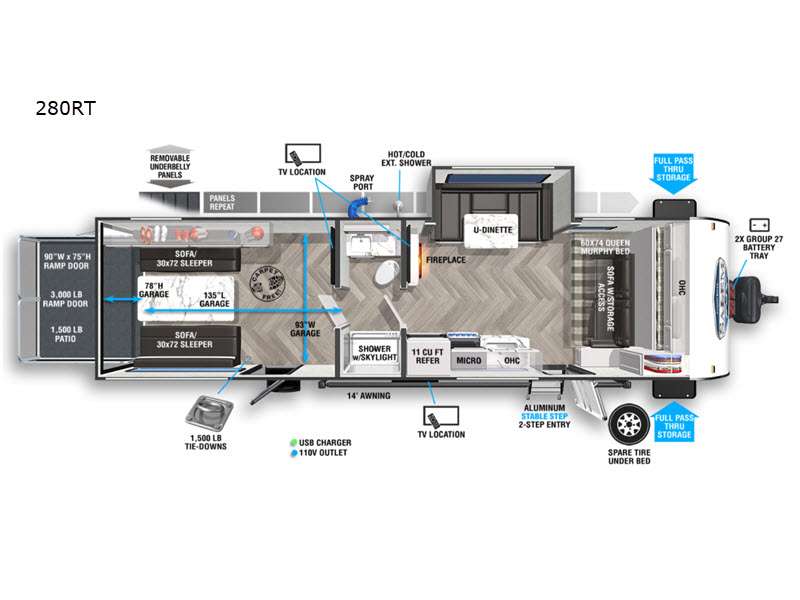 Check out this toy hauler if you're looking for the ultimate toy hauler with a private 11' 3" cargo area for your toys, plus space for your kids or friends to enjoy their own area at night with two sofa sleepers and a removable table. They even get to enjoy the views from the panoramic window and easy access through the second entry/exit door. The walk-through bathroom is convenient having access from the main area and the cargo space. You can cook up your favorite meals with the upgraded appliance package and dine at the U-shaped dinette slide out while enjoying the fireplace and entertainment center. The sofa with storage access allows you to relax inside, and the RV queen bed gives you a comfortable place to fall asleep on. You will also find USB charging outlets, pass-through storage along the exterior, and another panoramic window in the slide out.