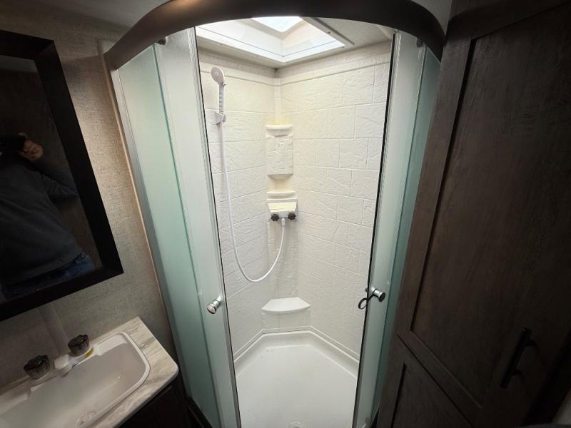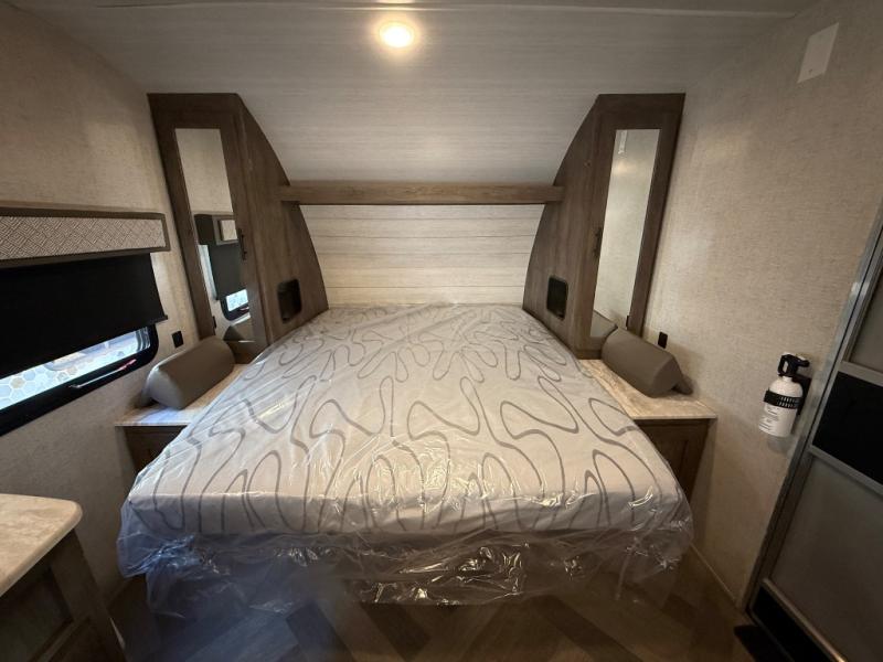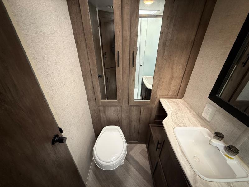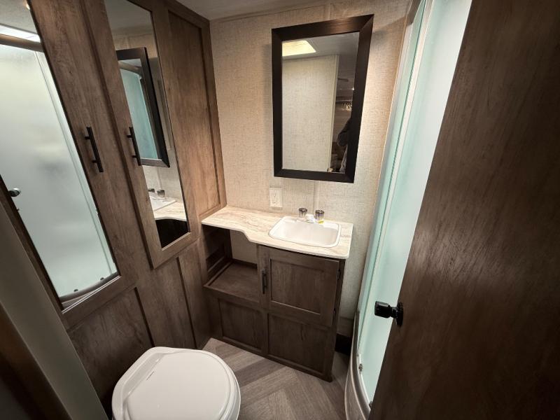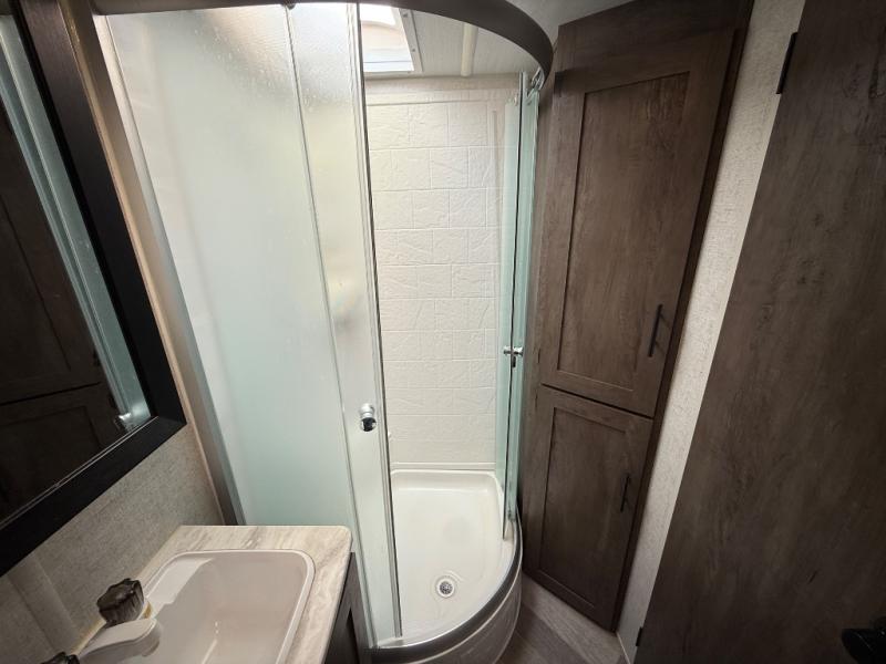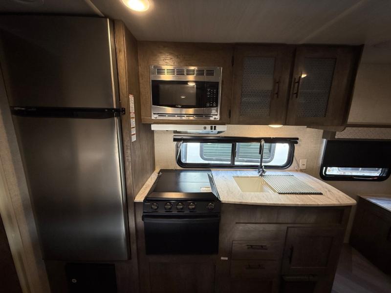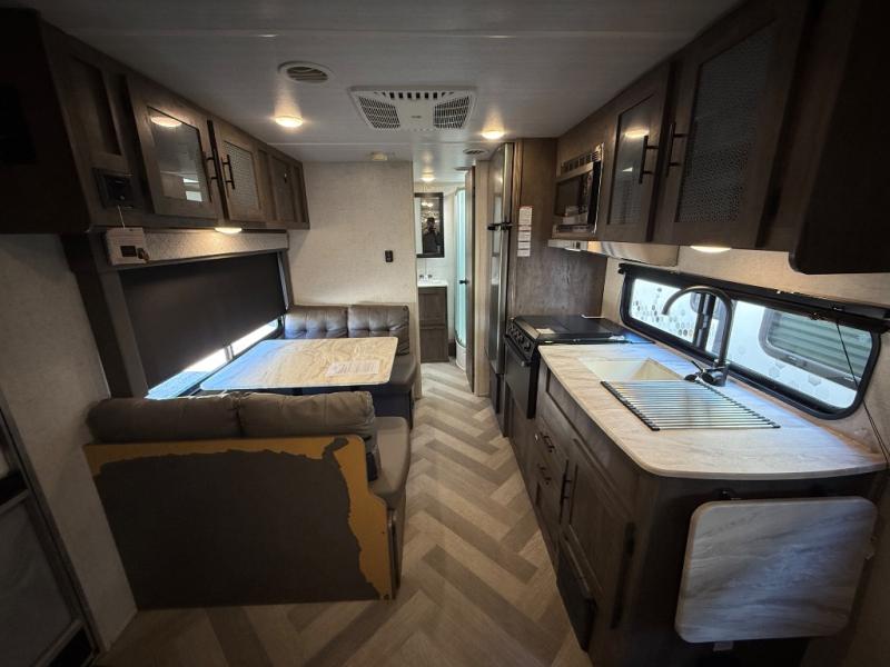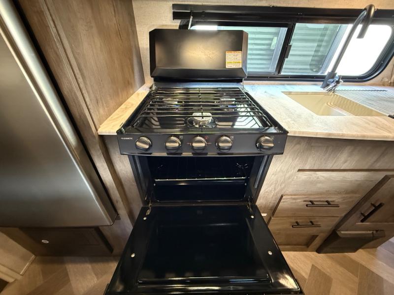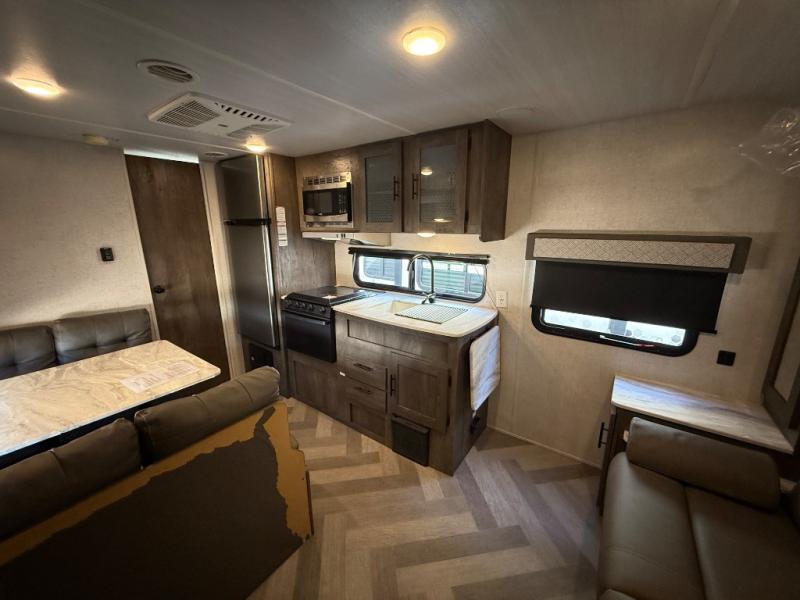 If you and your spouse wish to escape the hustle and bustle of everyday life then you need this travel trailer! Depending on what time of the day you enter the unit will determine whether you see the queen bed or the Jiffy sofa. You will enjoy home cooked meals throughout your camping trip thanks to the three burner cooktop and the stainless steel 10.7 cu. ft. refrigerator. The booth dinette is not only great for enjoying your meals at, but also for playing card games and transforming into an extra sleeping space for a guest to tag along. The full rear bathroom has a radius walk-in shower for you to rinse off the day, and storage for your towels and accessories!