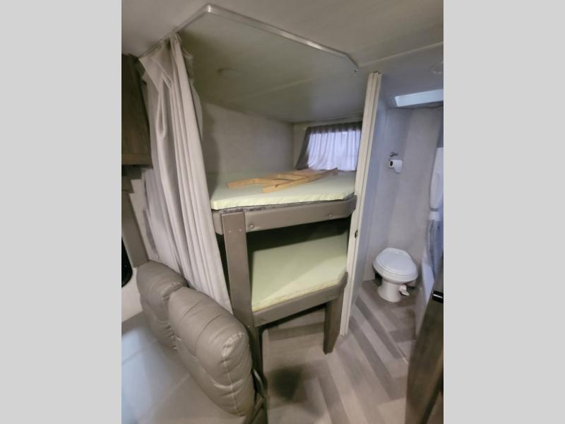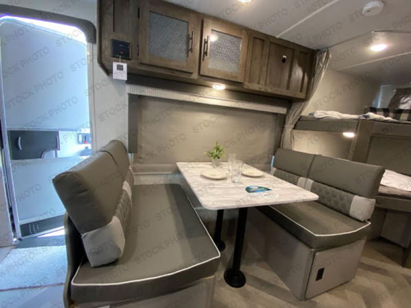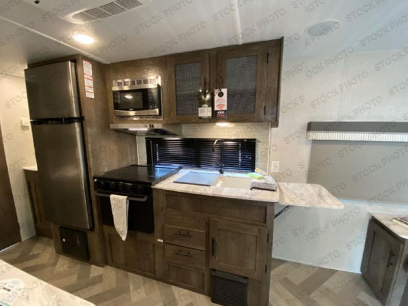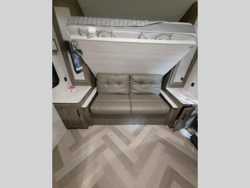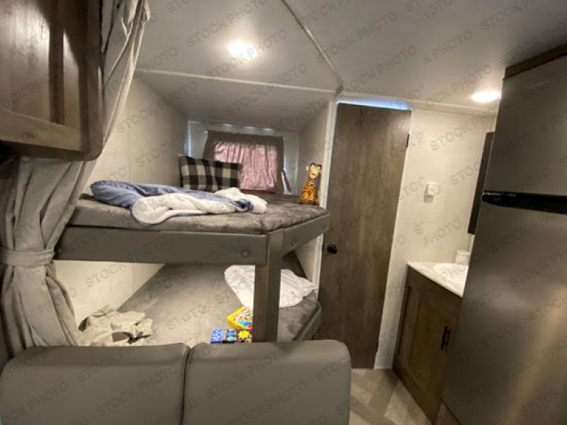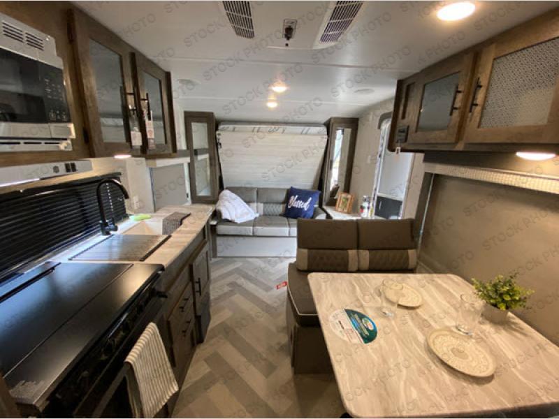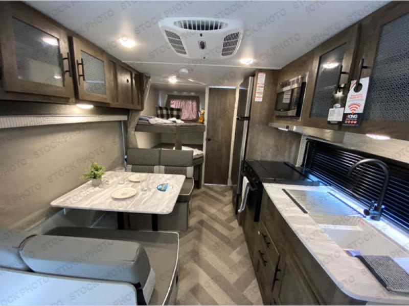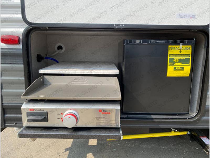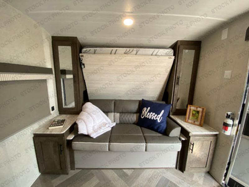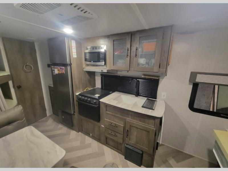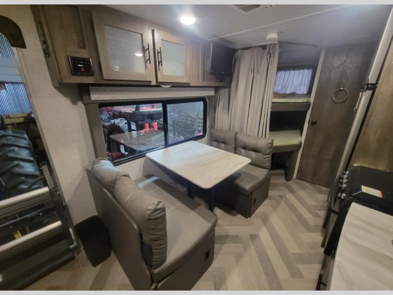 If you're looking for a bunkhouse travel trailer that weighs less than 5,000 lbs. then look no farther! Everyone can freshen up each morning in the rear corner bathroom with the walk-in shower with a skylight above for added natural lighting. The kids can sleep on the 48" x 74" double over double bunk beds and you can sleep on the front Murphy bed which has an Easy Bed lift system. The booth dinette can also transform into an extra sleeping space when you're not using it to enjoy your meals or playing card games. You can also choose to add the optional outside kitchen so you can breathe in some fresh air while you cook and watch the kids play outside!